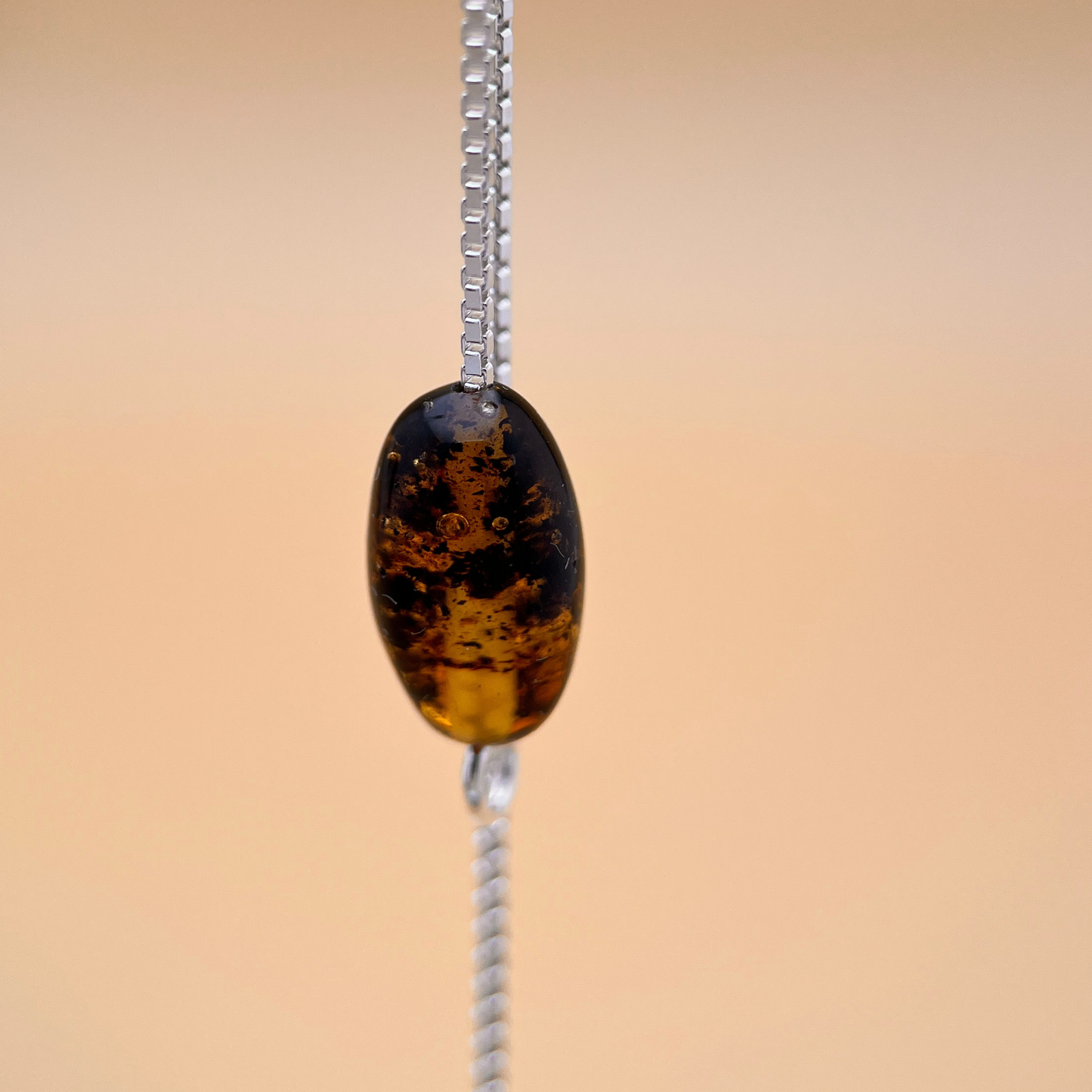 I den ene ende hænger et poleret ovalt ravstykke i en dyb mosgrøn tone , der afslører lag af naturlig dybde og bløde lysrefleksioner. Denne unikke nuance bringer en moderne, men jordnær følelse til designet, hvilket gør det både raffineret og karakteristisk.