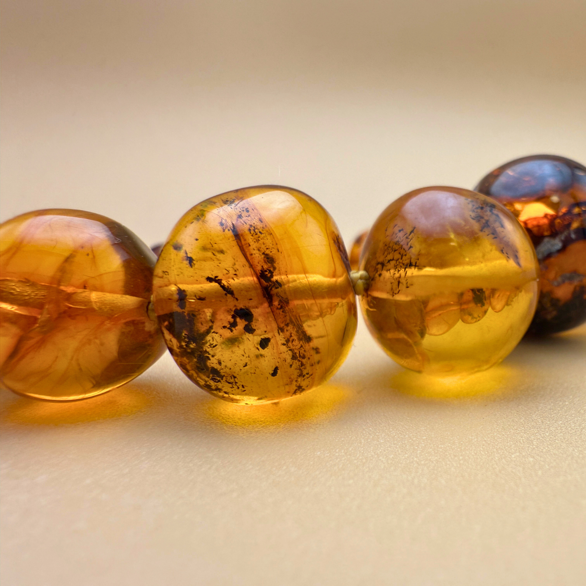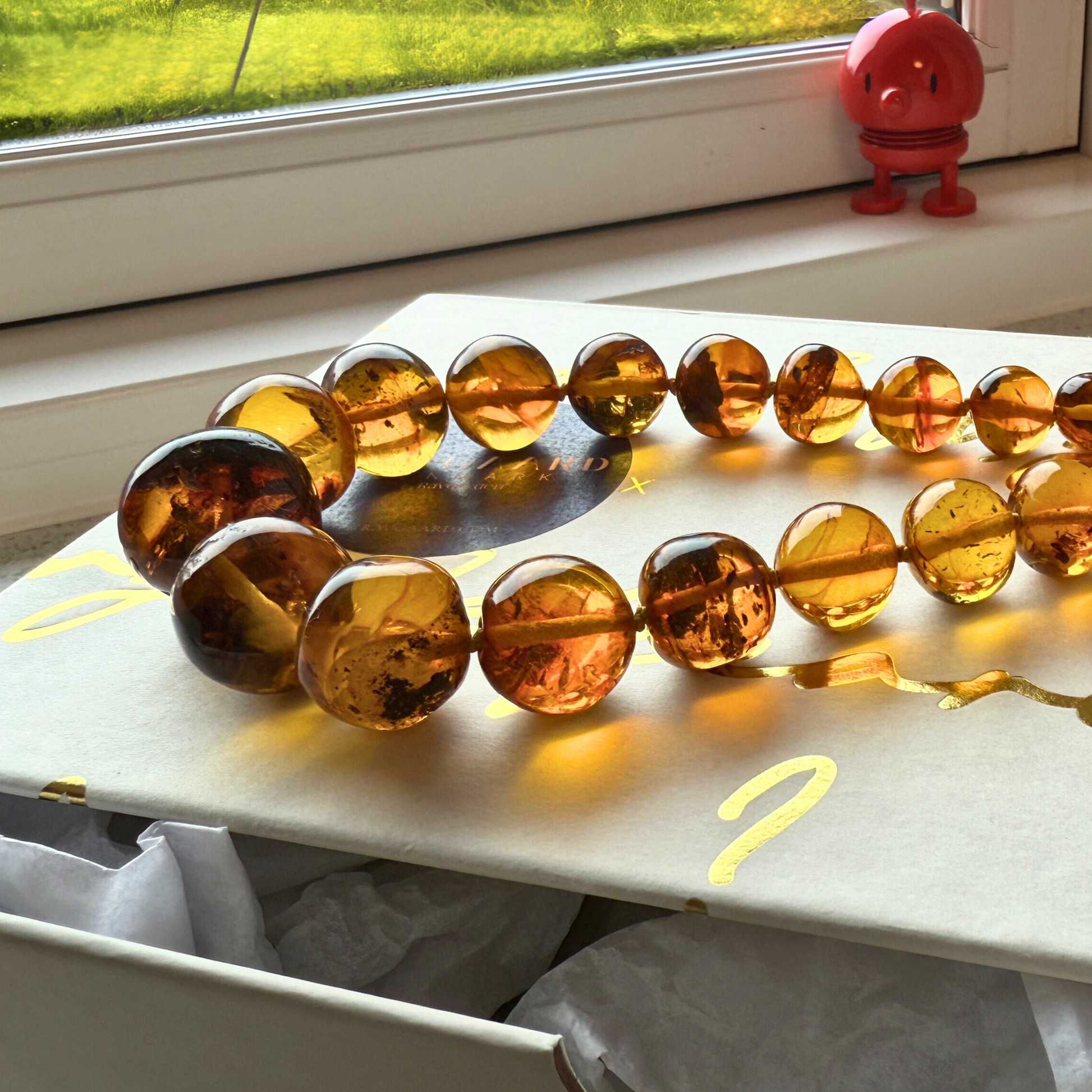 Halskæden er trukket i en blid progression med mindre perler ved halsen og større, skulpturelle perler i midten foran. Hver perle er individuelt håndknyttet, hvilket giver smykket flydende bevægelse, holdbarhed og en raffineret finish. I sollys gløder ravet med ekstraordinær dybde – fuld af liv, klarhed og organiske mønstre, der ændrer sig, når du bevæger dig.