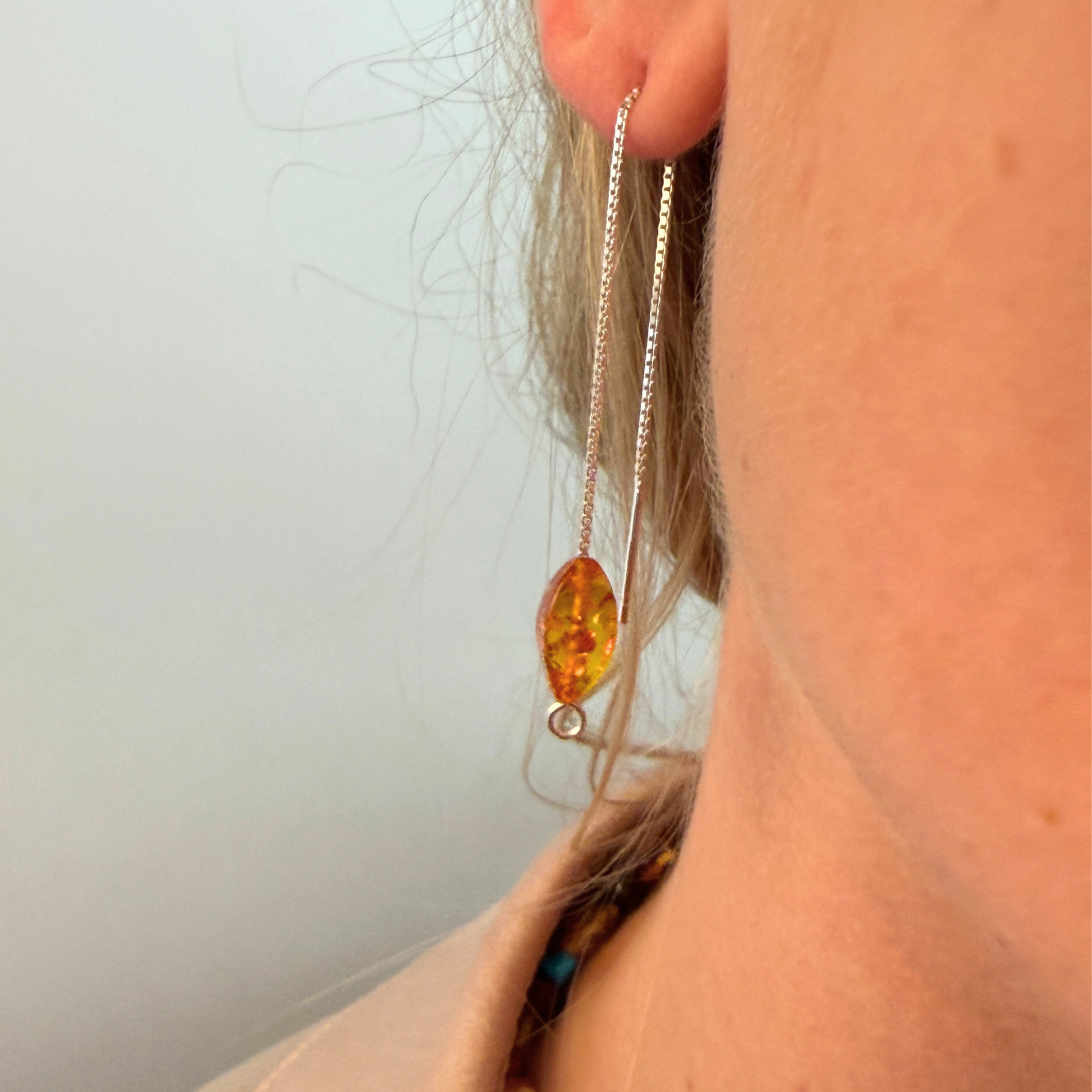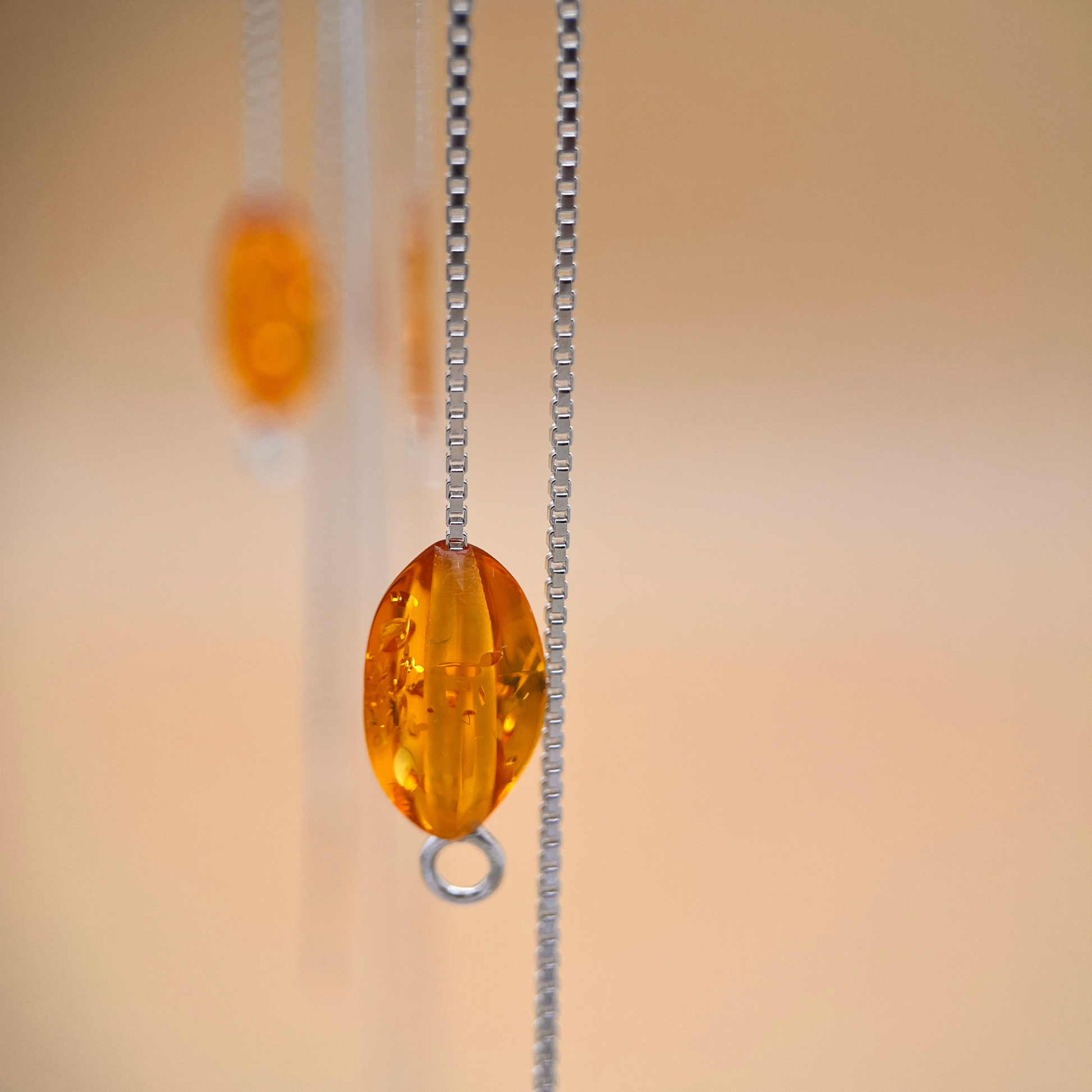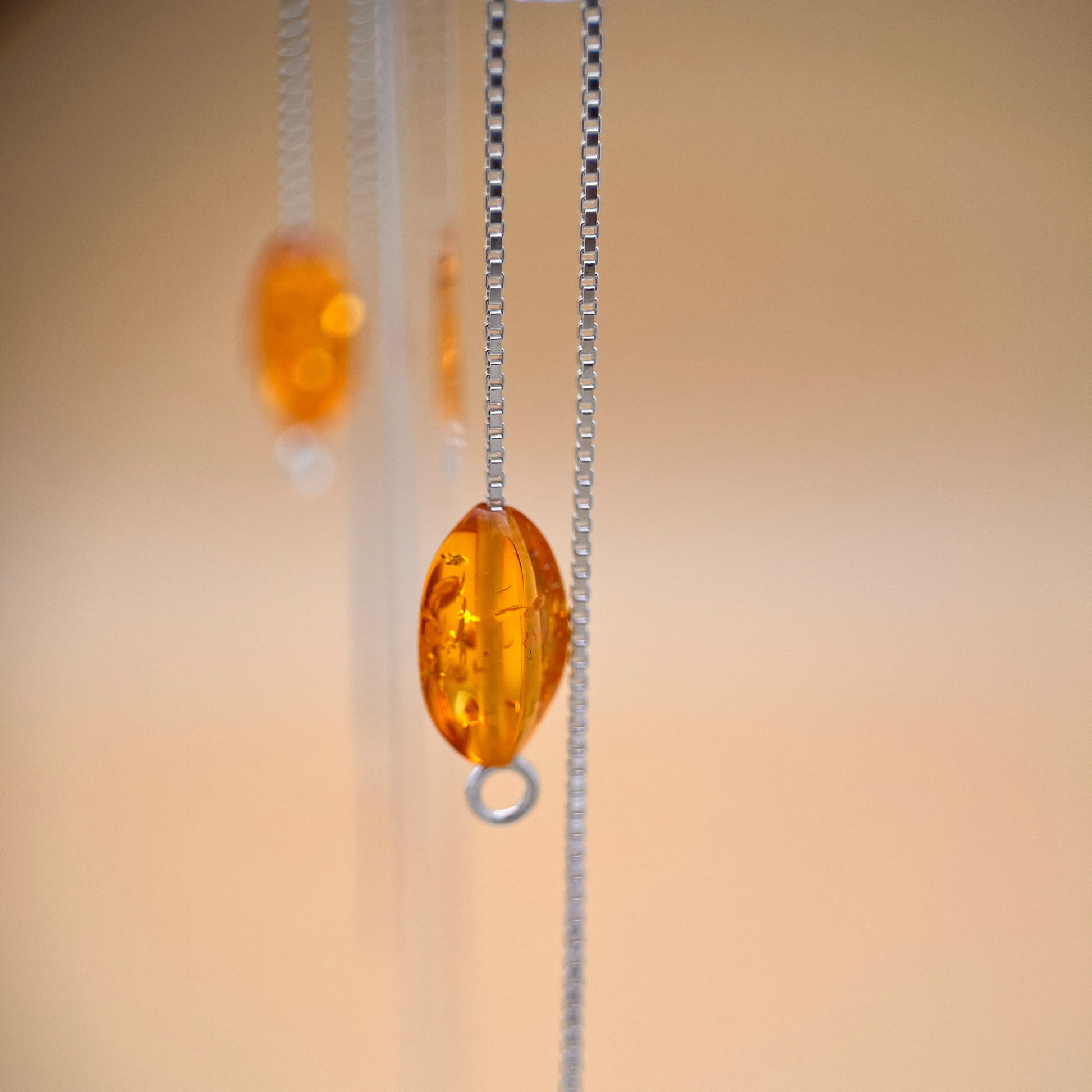 I den ene ende hænger en skulptureret ravperle i klar lys cognac , formet i en aflang oval med fire bløde facetter og blidt spidse ender . Den geometriske silhuet bringer en moderne kant til den organiske varme fra rav og skaber et design, der er både moderne og tidløst.