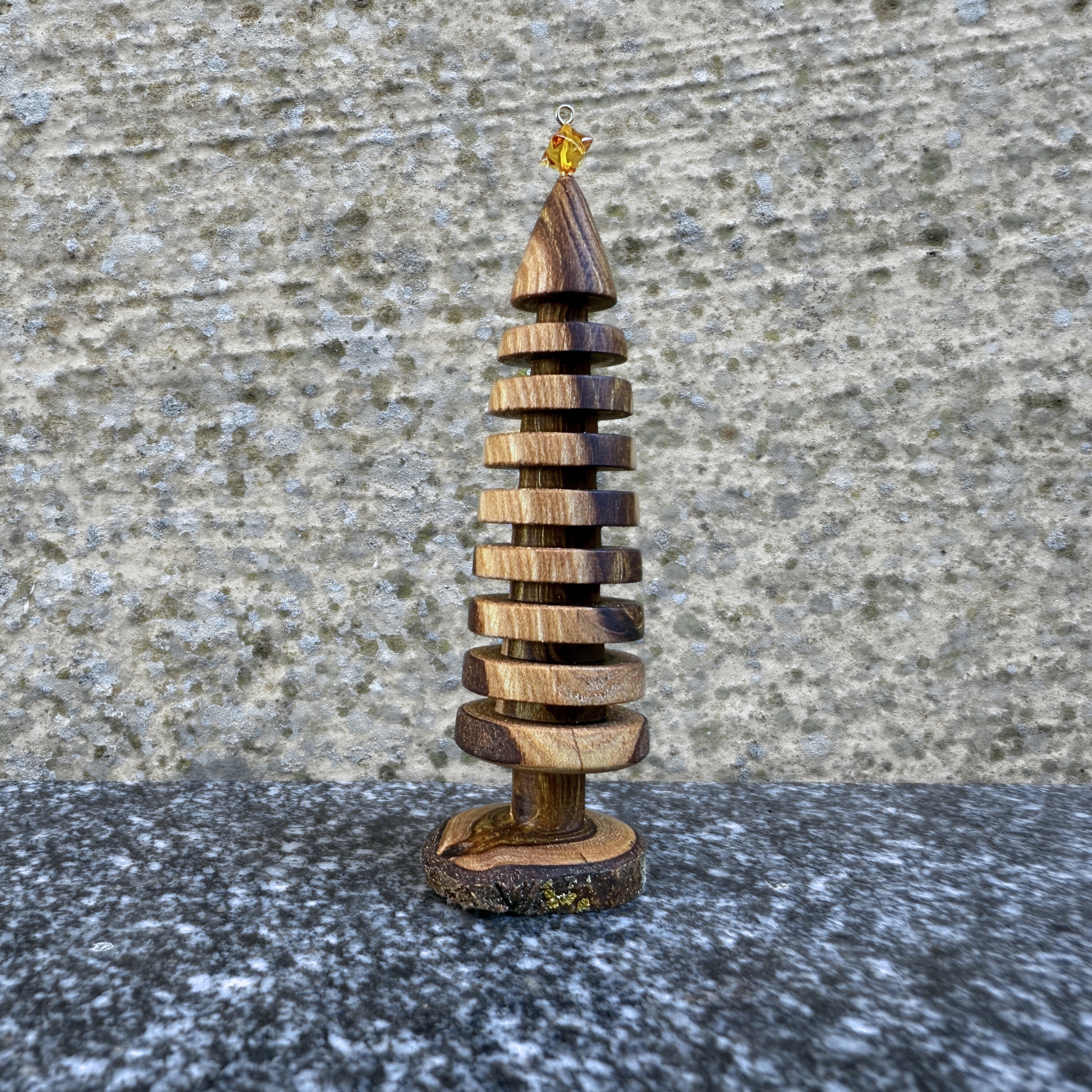 Hvert lille juletræ i guldregn er hånddrejet af Erik på drejebænken i Ravgården – et stykke levende håndværk, hvor træets årer og ravets varme mødes i vinterens lys.