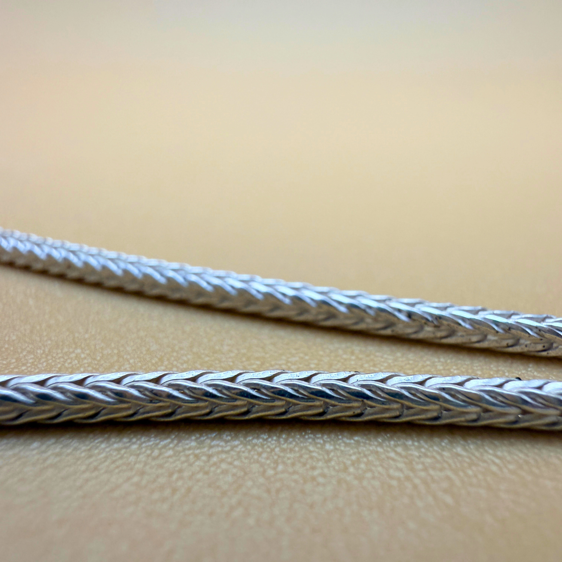 Vores blanke rævehale kæde er lavet i massivt 925 sterling sølv, med en smidig og tæt struktur, der lægger sig naturligt om halsen. Kæden er 1,6 mm i tykkelsen og passer til vedhæng med en øskenåbning på minimum 4 mm i diameter.