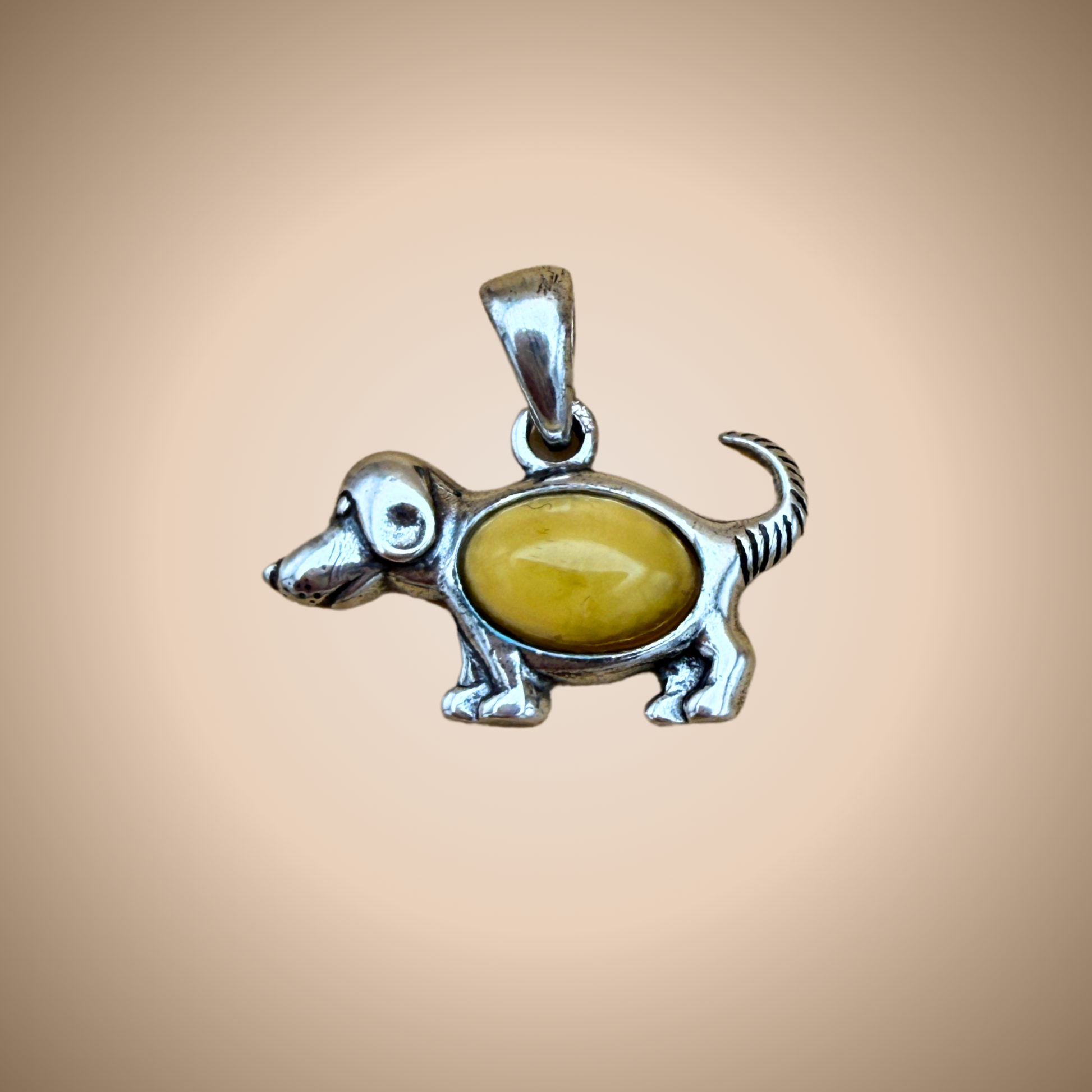 En glædelig lille hyldest til loyalitet og kærlighed – dette gravhund-vedhæng er fremstillet i massivt 925 sterlingsølv og har en varm ravcabochon som sin mave.
