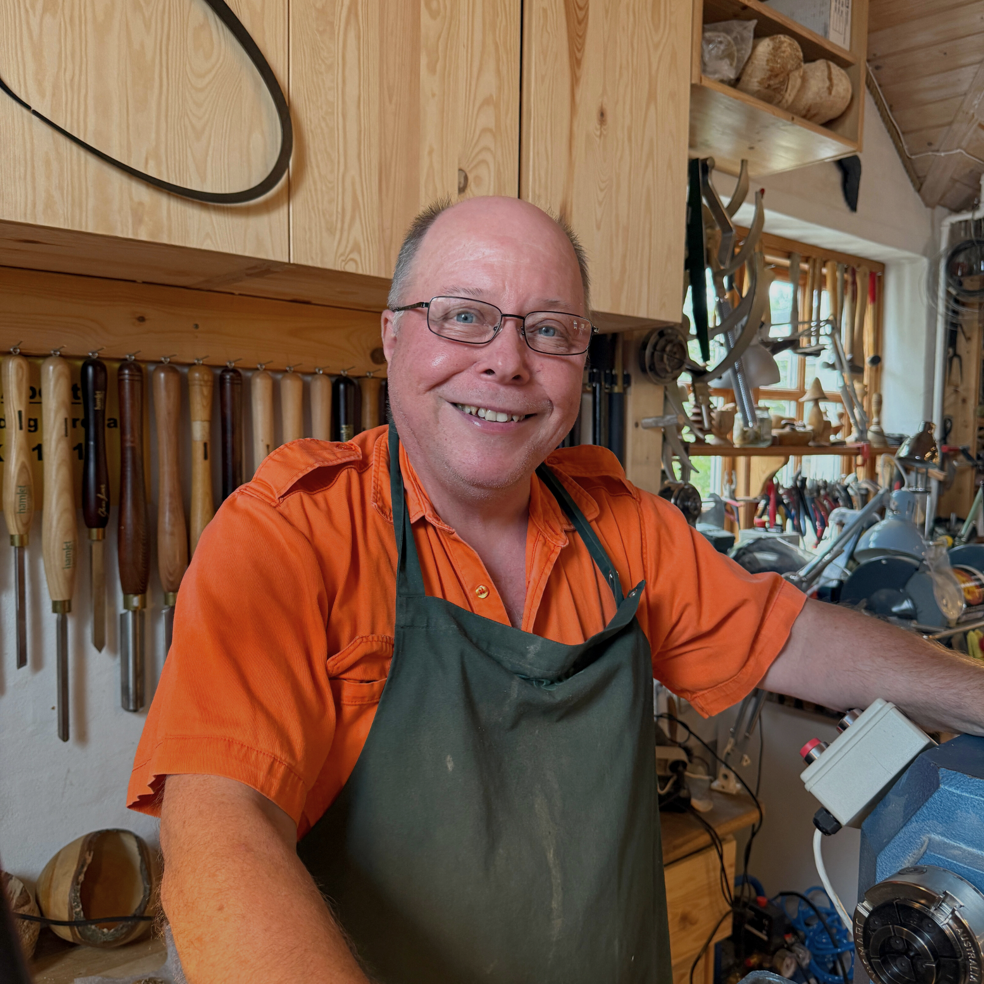 Erik har arbejdet med rav i over fire årtier og er både en sand håndværker og en kunstner i hjertet. Han bevarer ikke kun traditionelle ravslibningsteknikker, men bringer også kreativitet ind i værkstedet gennem trædrejning - lader naturen guide hvert stykkes form og udtryk.
