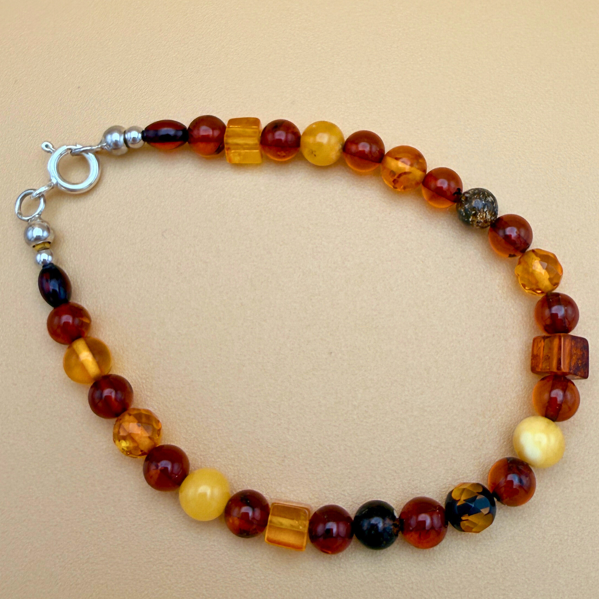 Dette armbånd er et let og tidløst udtryk for ravets naturlige varme. Det består af omhyggeligt udvalgte ravperler i nuancer fra blød honning til dyb cognac og rummer de små variationer i form og klarhed, som giver hvert armbånd sit eget rolige udtryk.