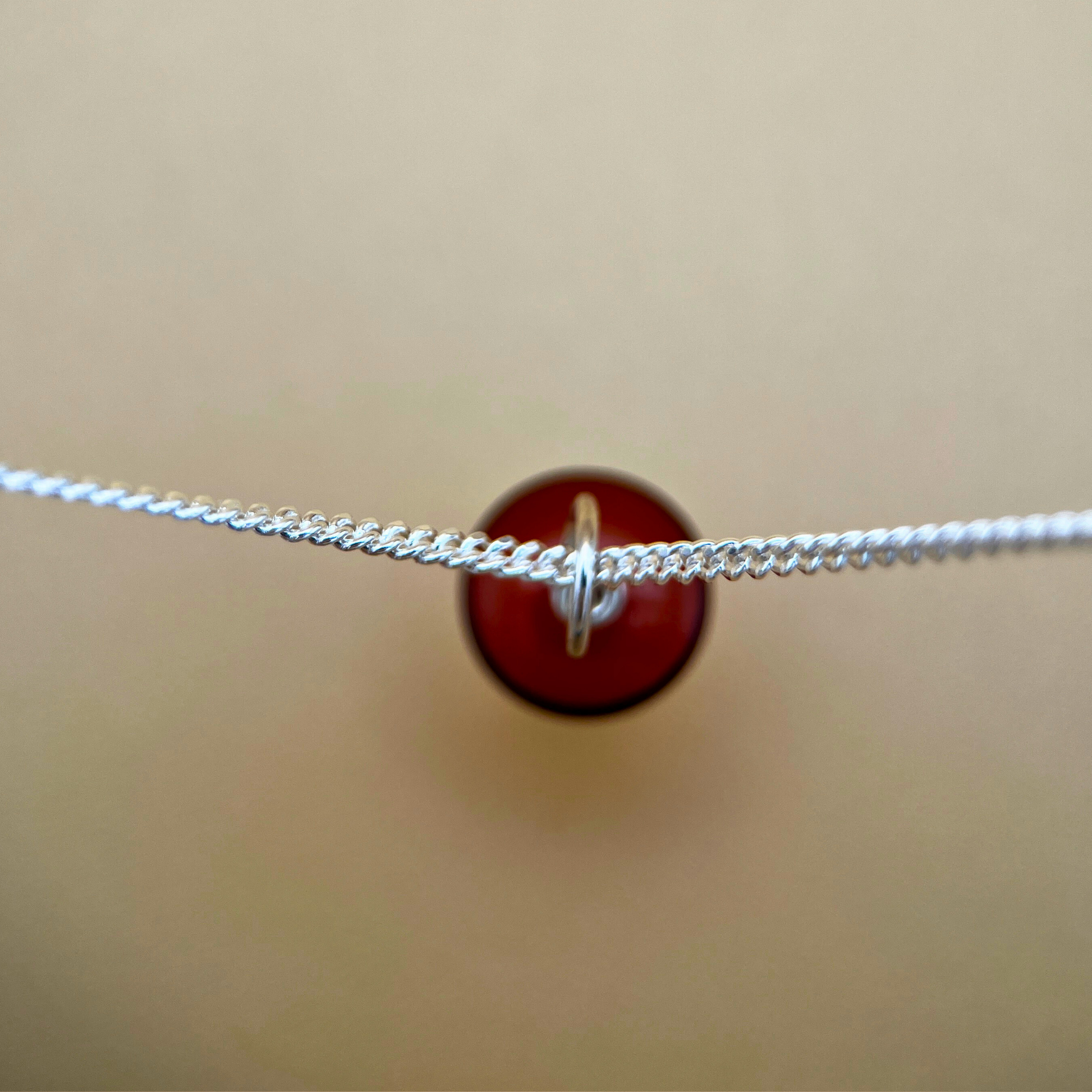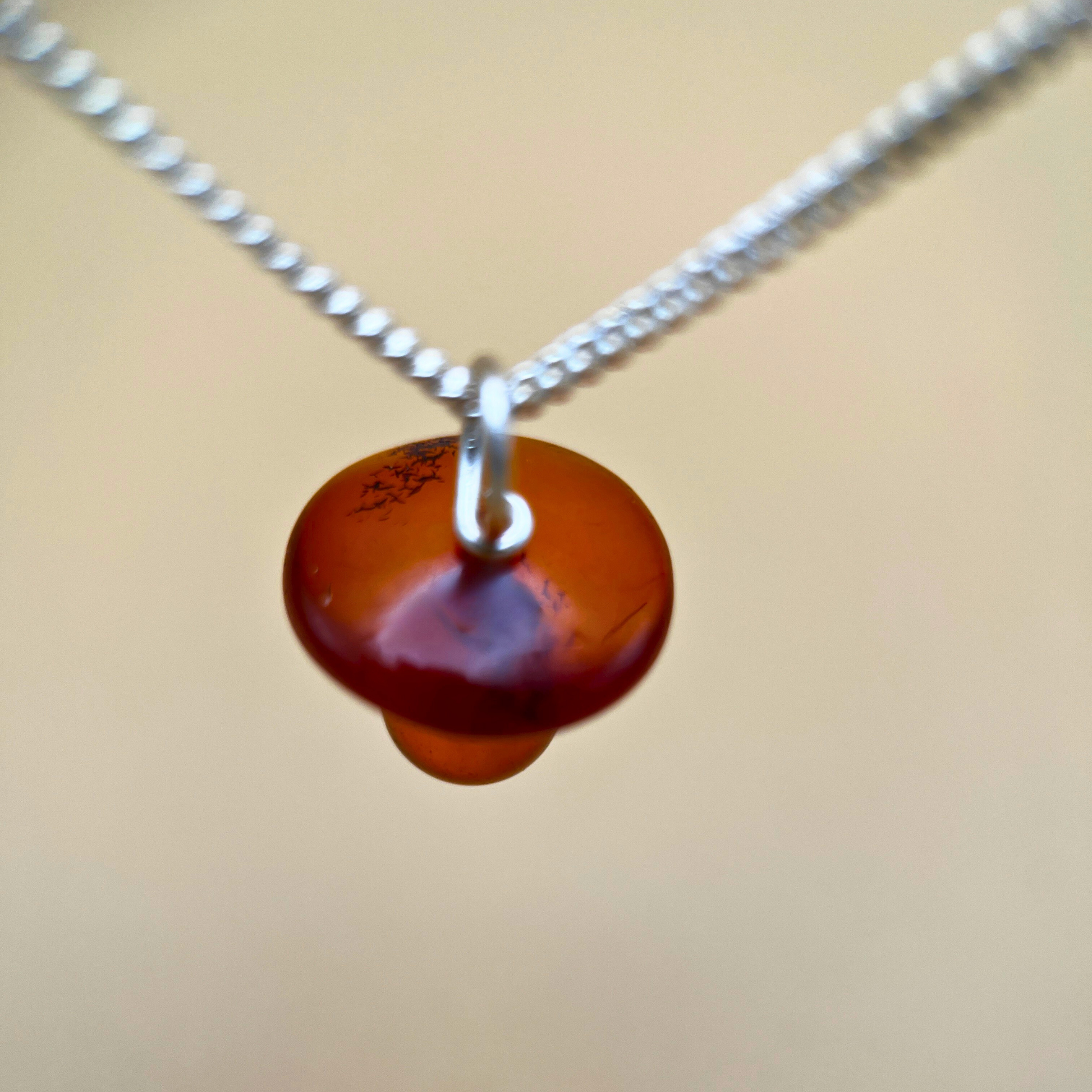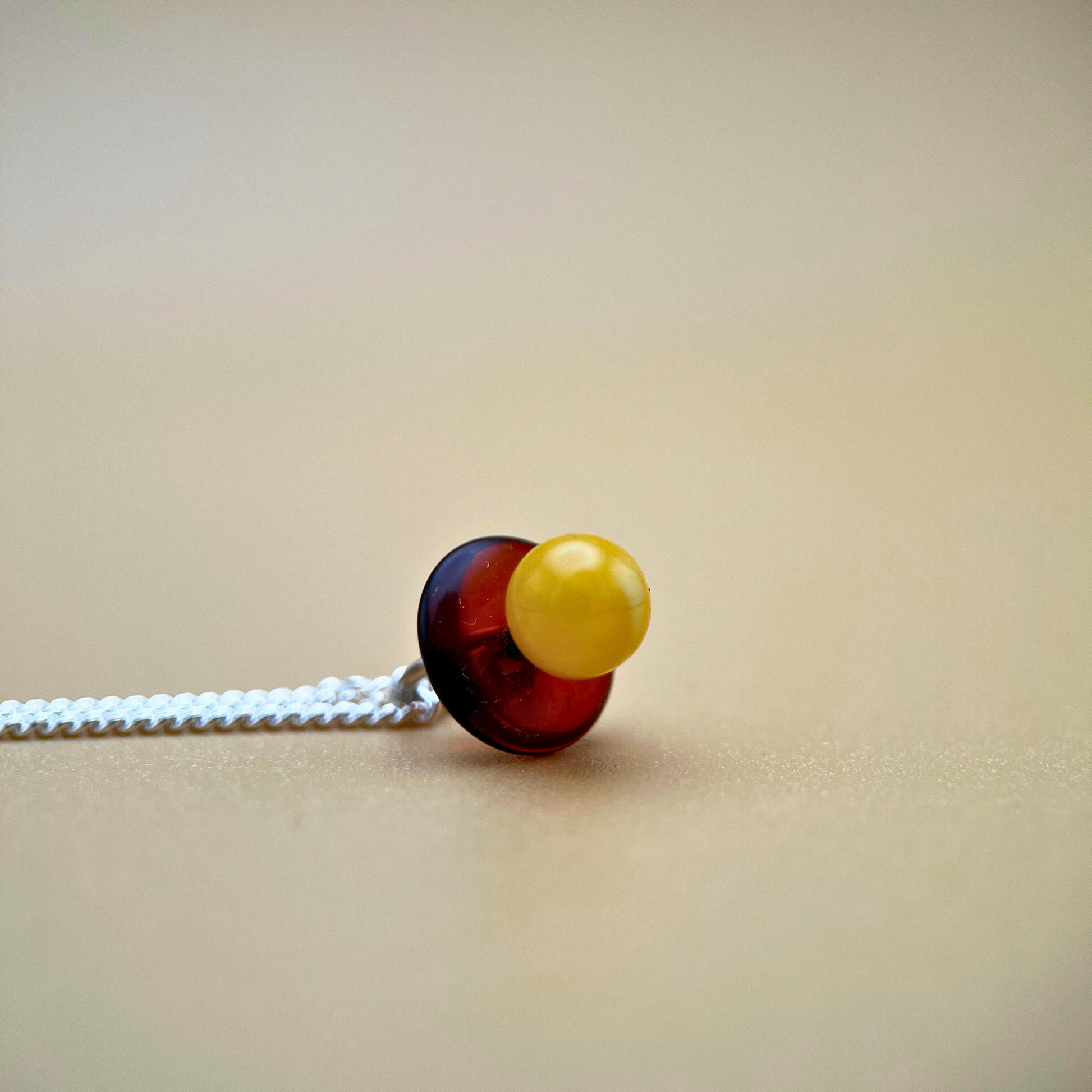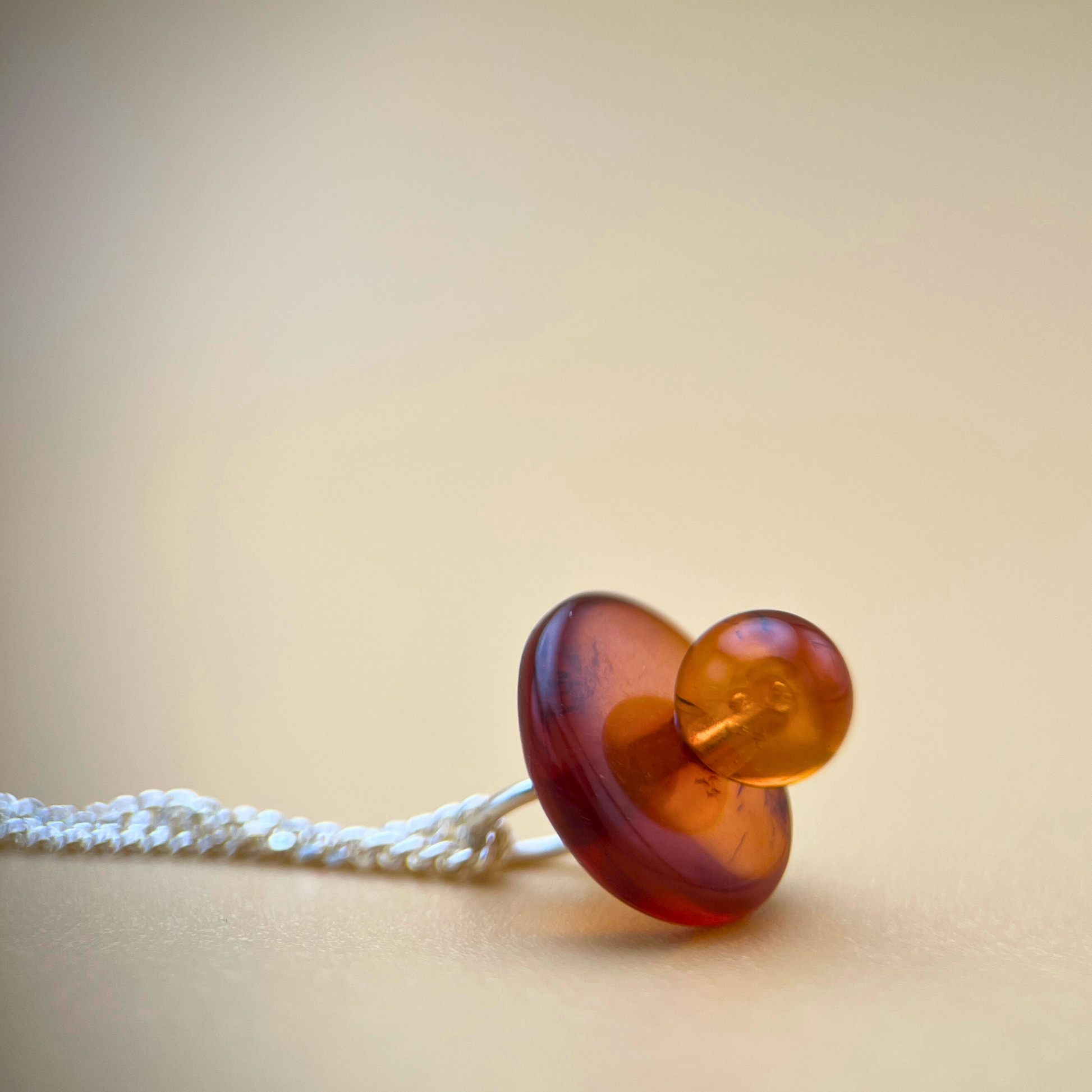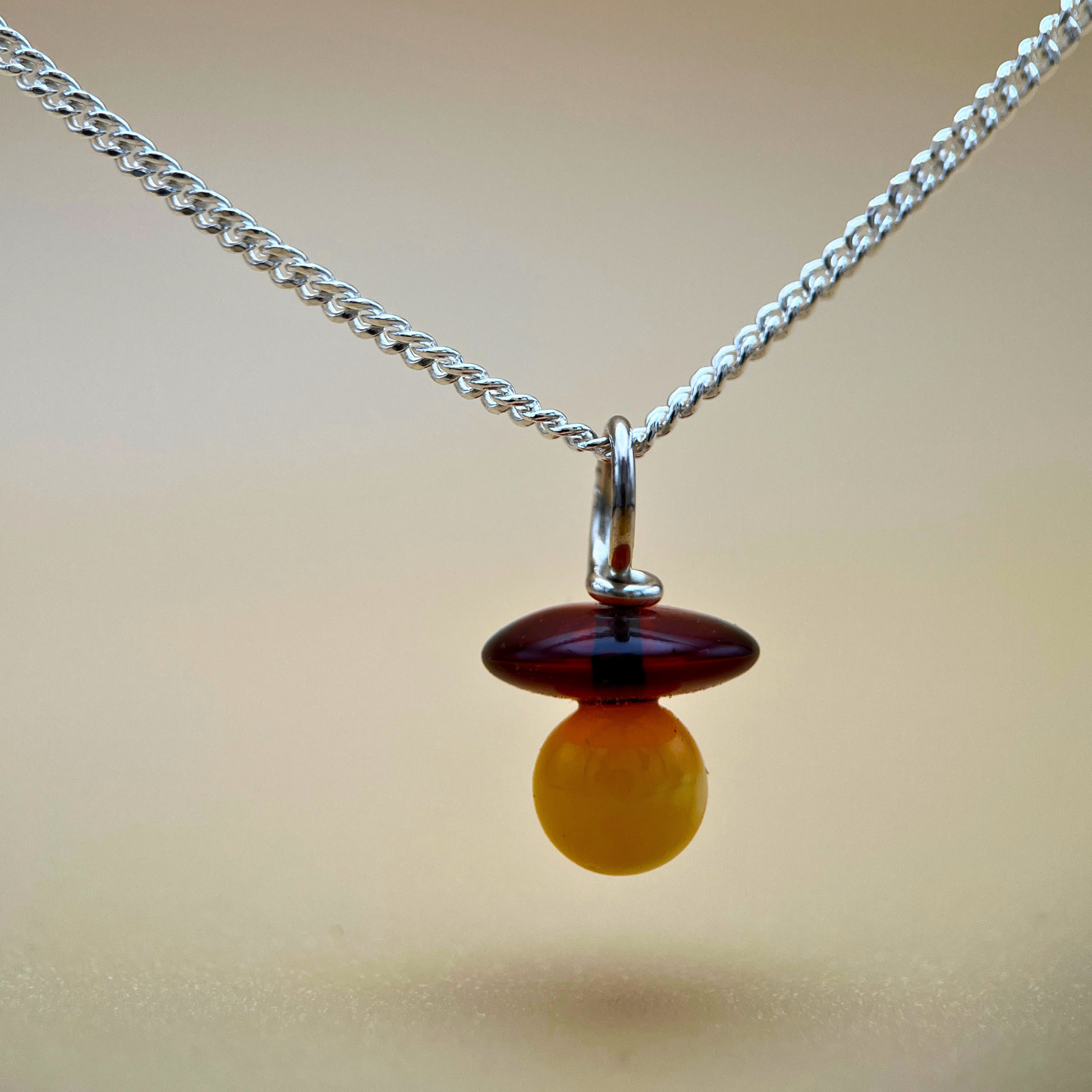 En fin og meningsfuld gave – denne miniature sut er håndlavet i naturlig baltisk rav og monteret med et snoet øsken i sterling sølv, der danner selve sutte-ringen. Vedhænget består af to omhyggeligt formede ravperler: en rund, glat bund og en flad cirkelskive øverst – en blød og velkendt silhuet.