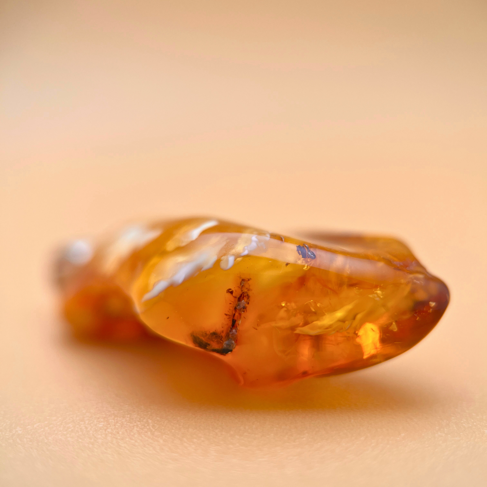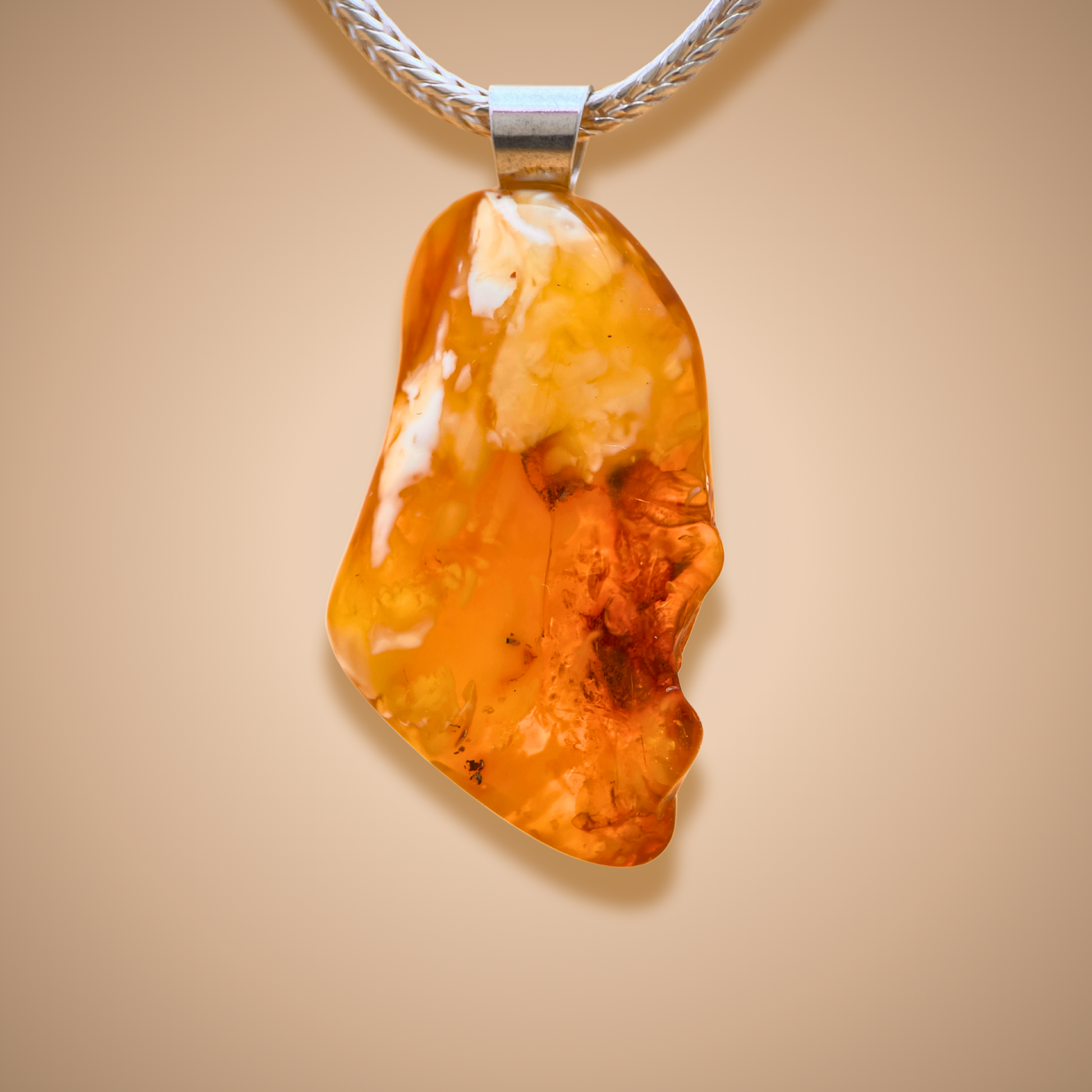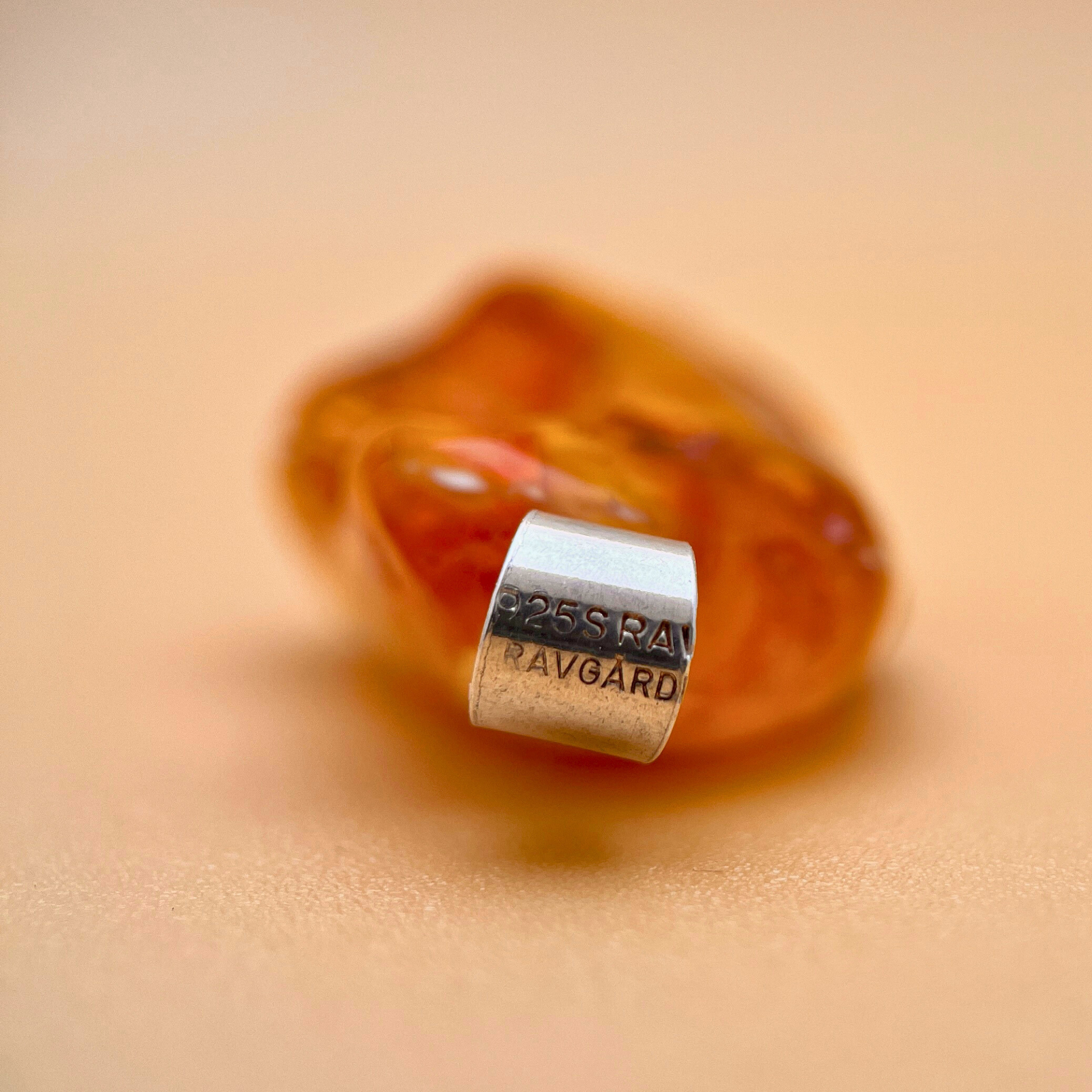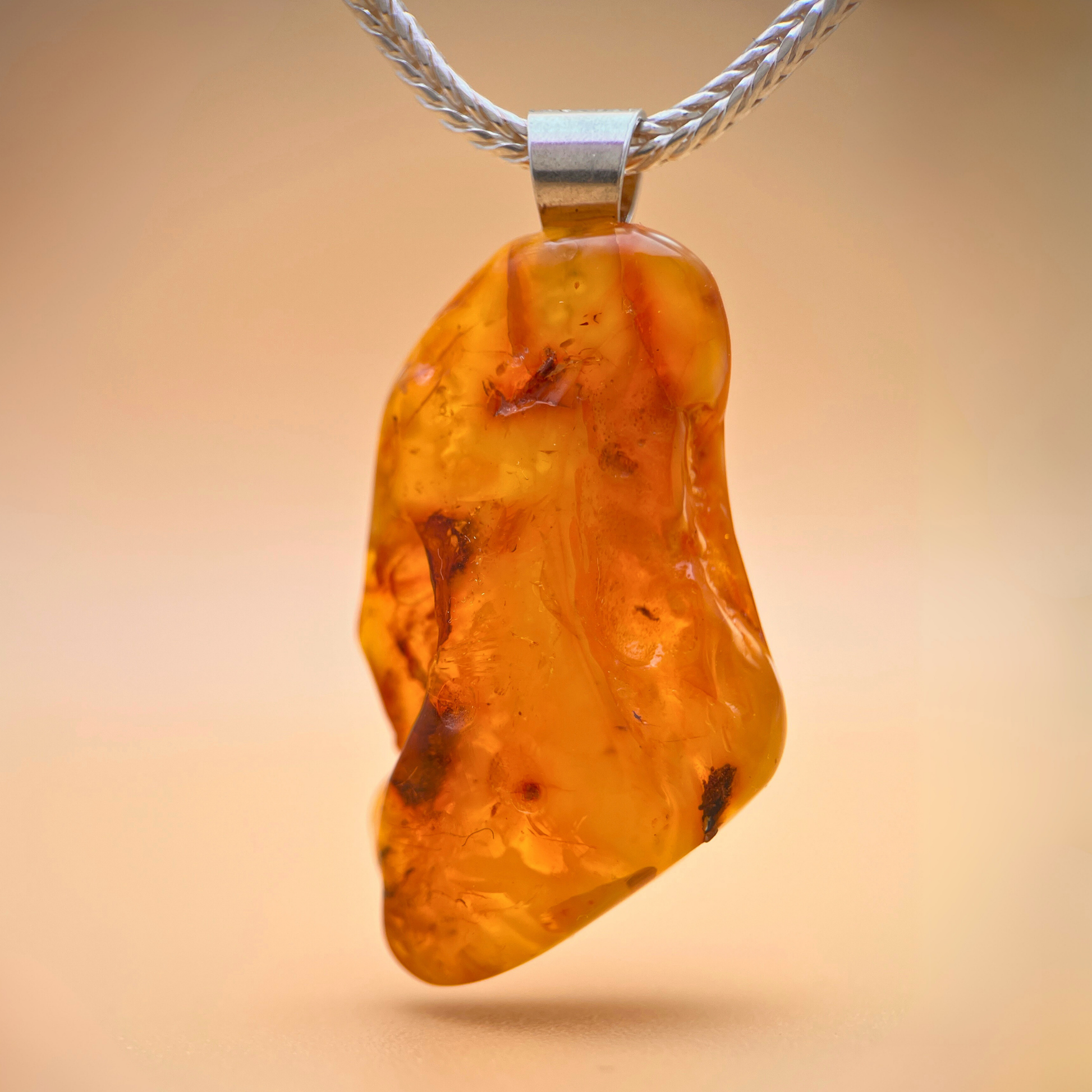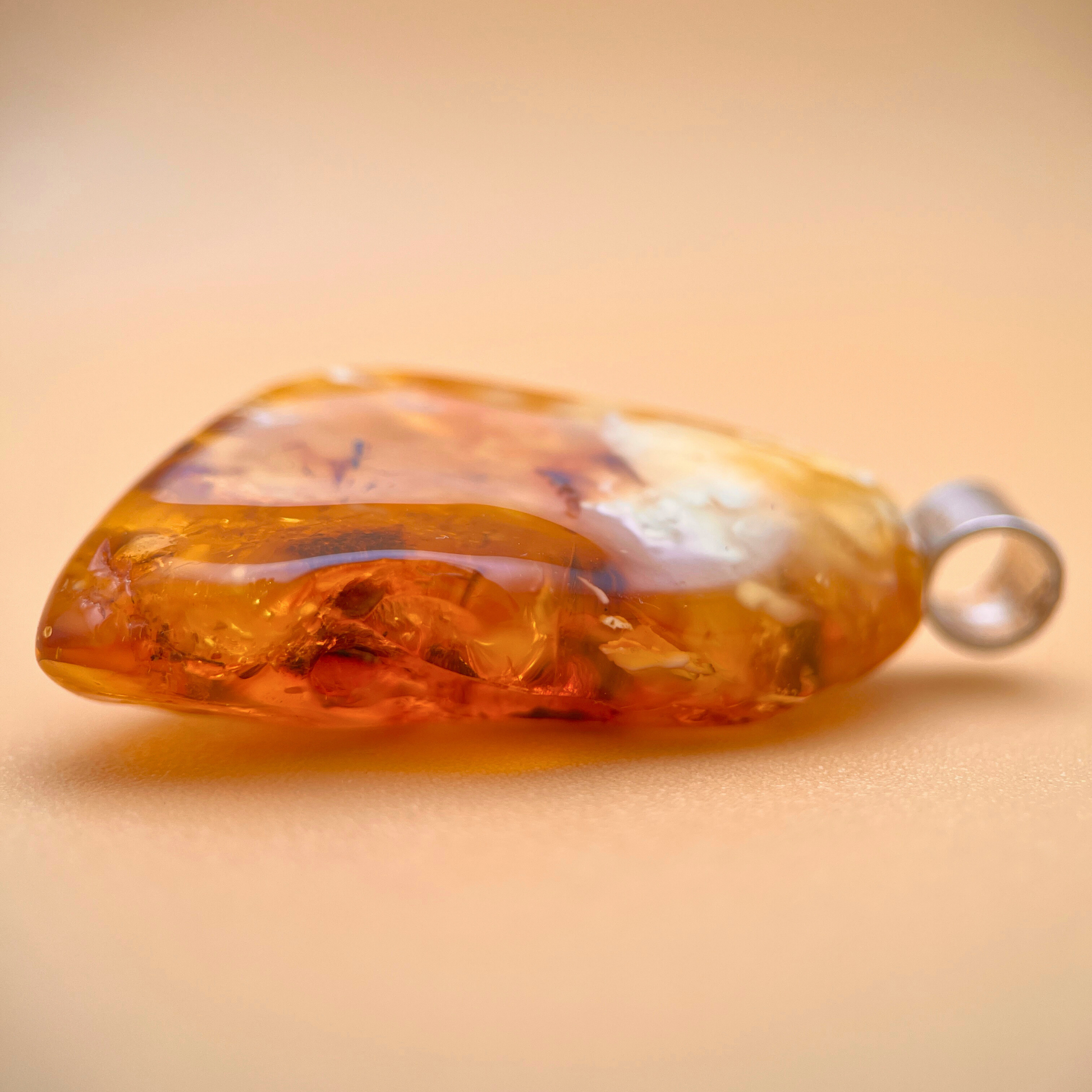 Dette håndlavede ravvedhæng er skabt med omhu og kærlighed og fremhæver den naturlige skønhed af ægte rav. I stedet for en traditionel øsken har den et slankt sølvrør, der tilføjer et moderne og elegant touch - perfekt sammen med en lidt tykkere kæde.