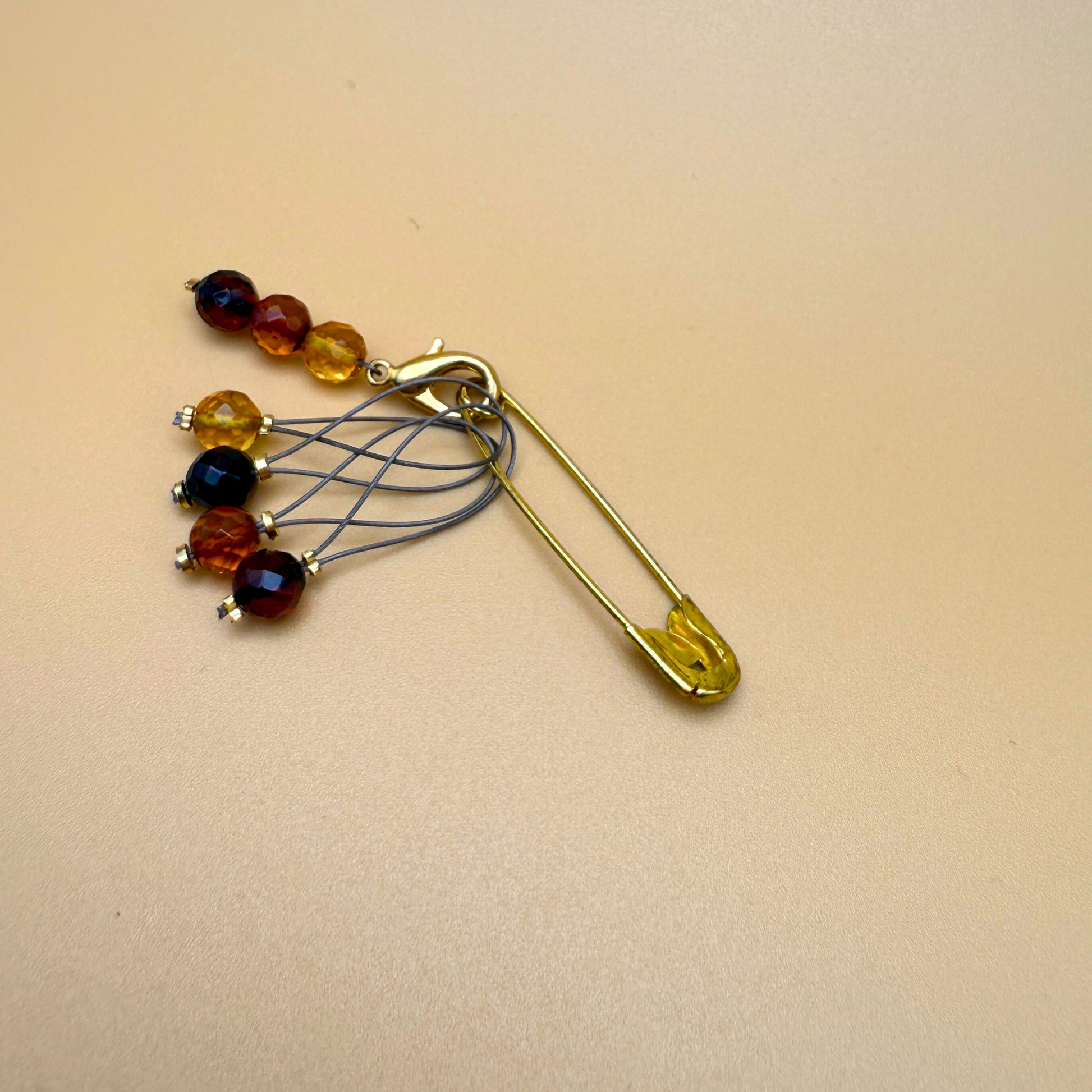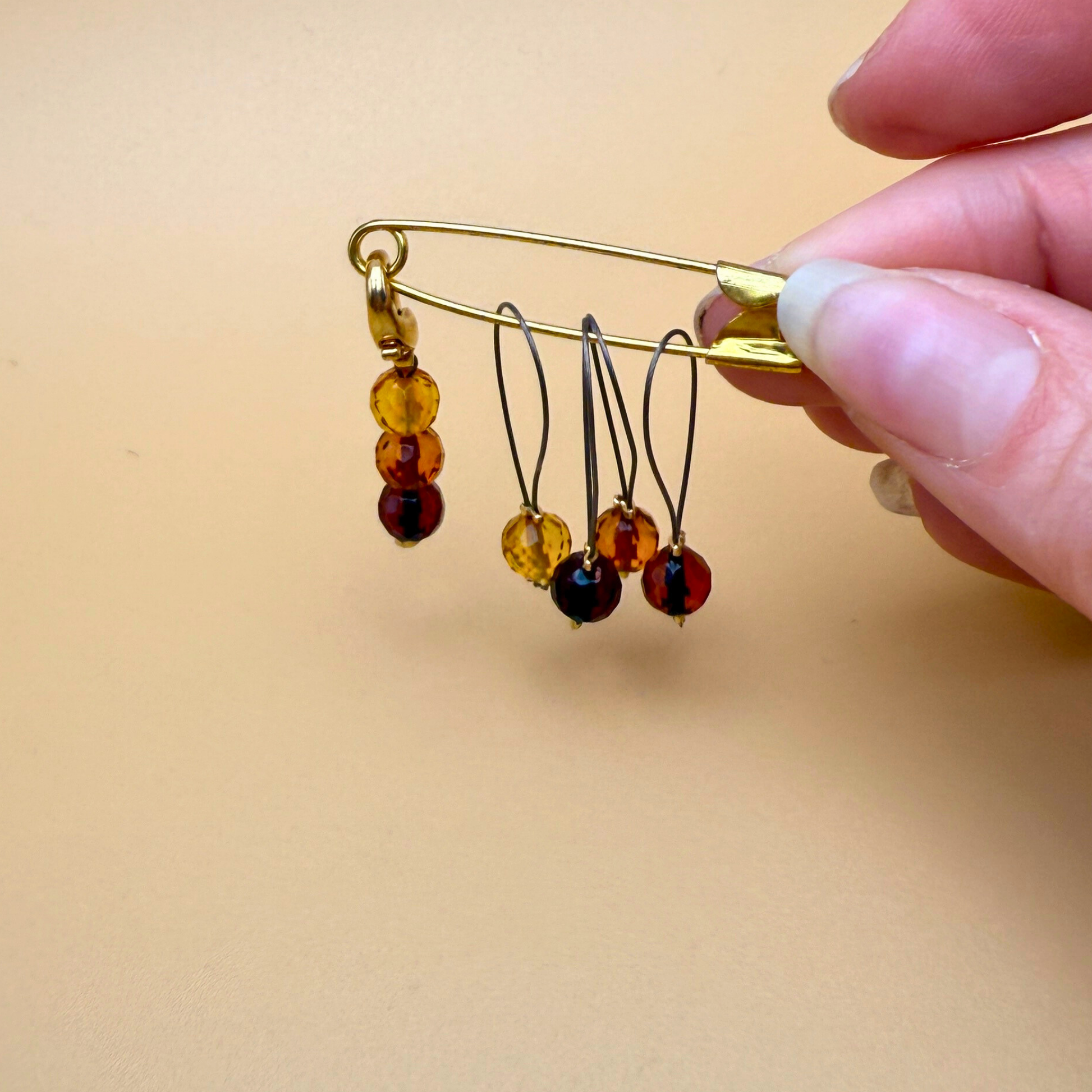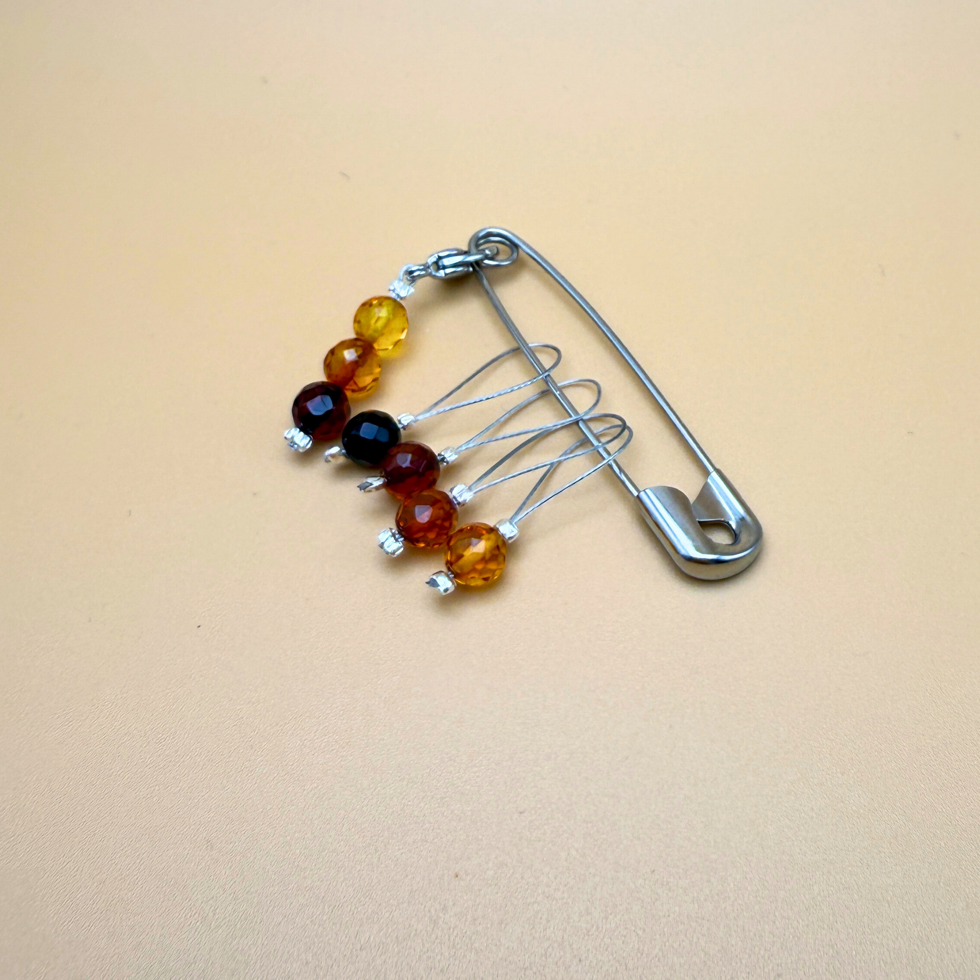 Giv din strikning et løft med dette smukke og praktiske sæt maskemarkører. Hver markør er lavet med 5 mm facetslebne ravperler i varme toner, og den er samlet på en fin stålwire og fastgjort med krympeperler for et elegant og minimalistisk look.