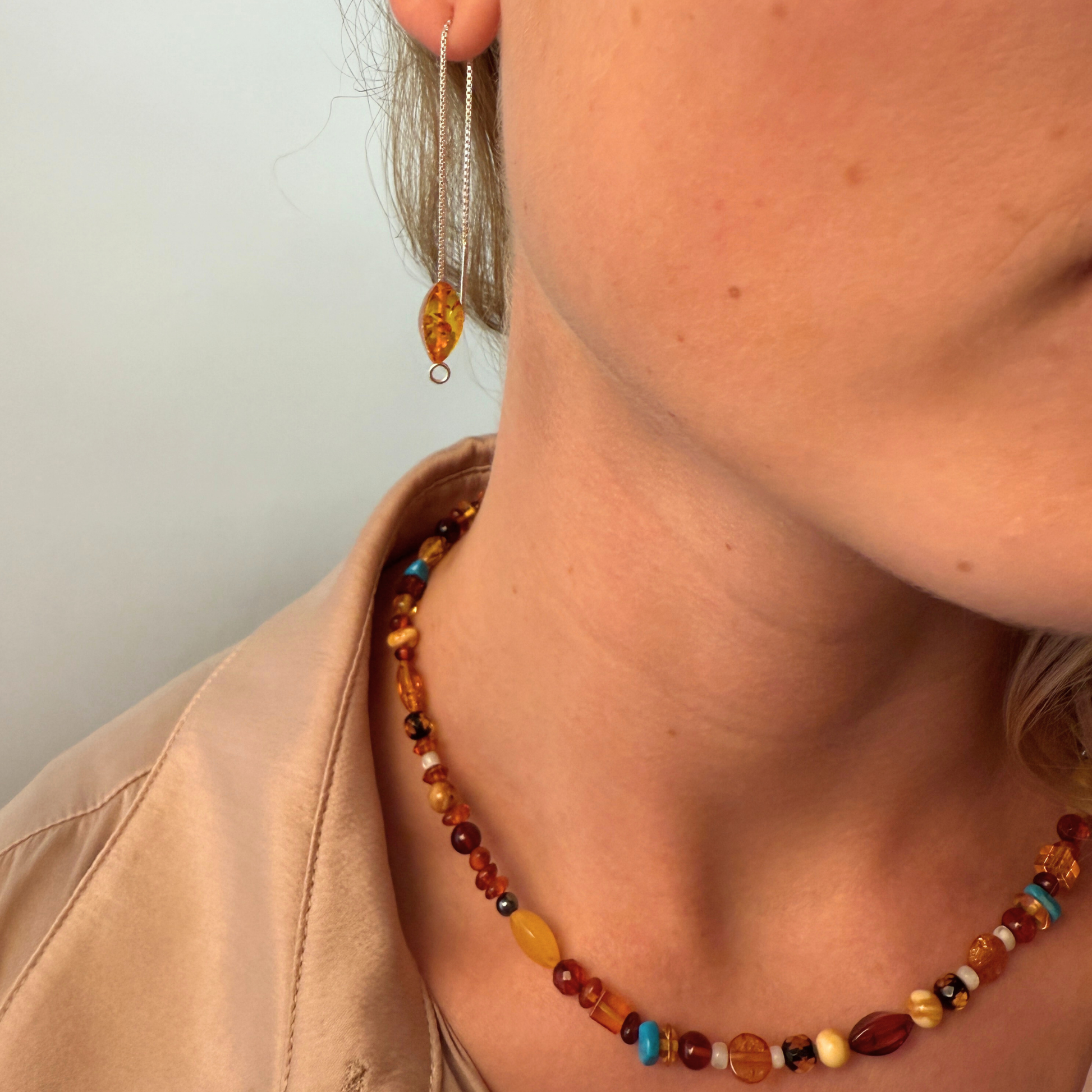 Halskæden er trukket på slidstærk stålsnor og afsluttes med en fjederlås i sterling sølv. Et let og behageligt design, der forener naturens varme med nutidens æstetik.