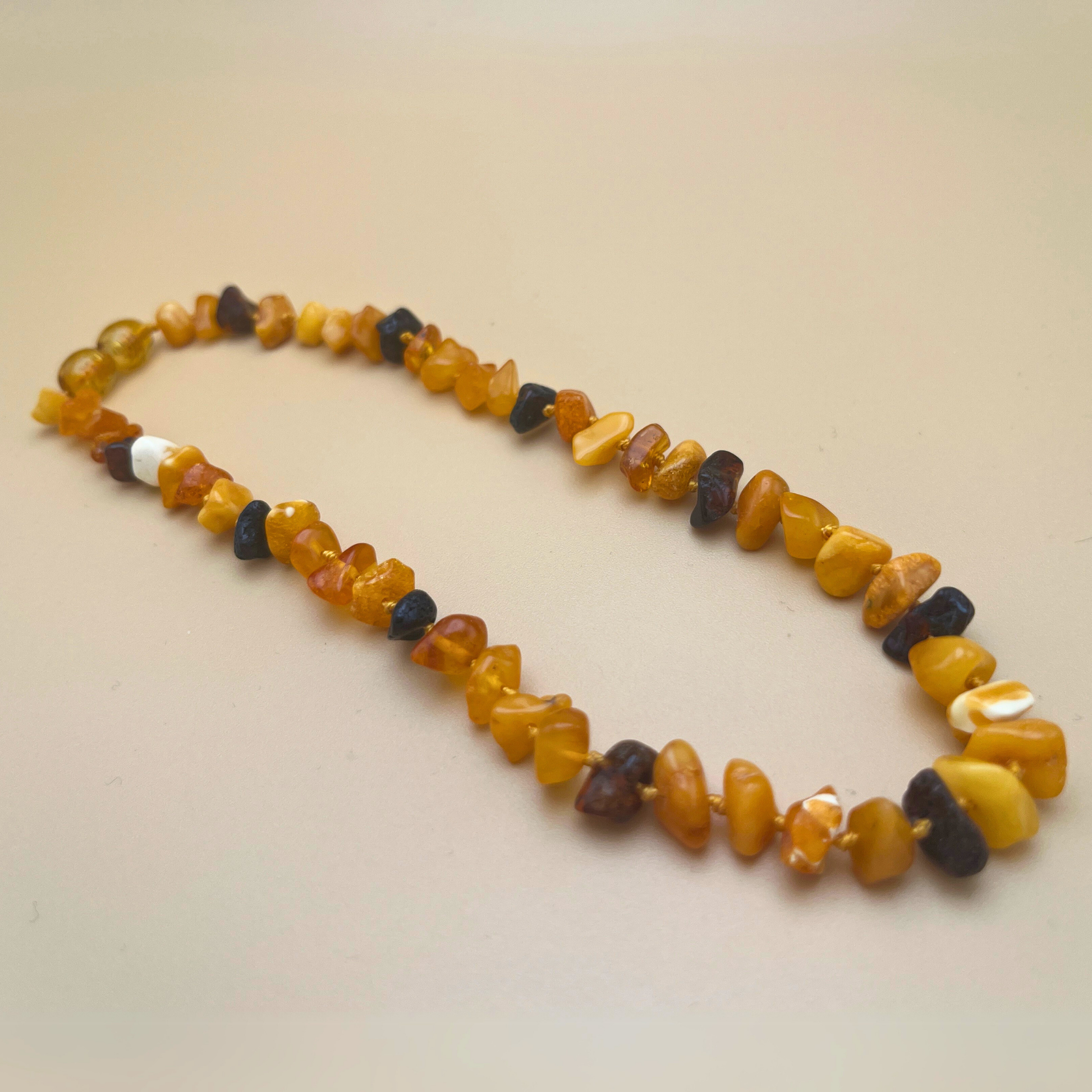 Denne varme og farverige babyhalskæde er fremstillet af naturligt rav i en smuk blanding af toner – mælkehvid, gylden honning, dyb cognac og endda et strejf af kirsebærrødt. Perlerne er blødt afrundede, organisk formede, og hver enkelt har sin egen glød og karakter.