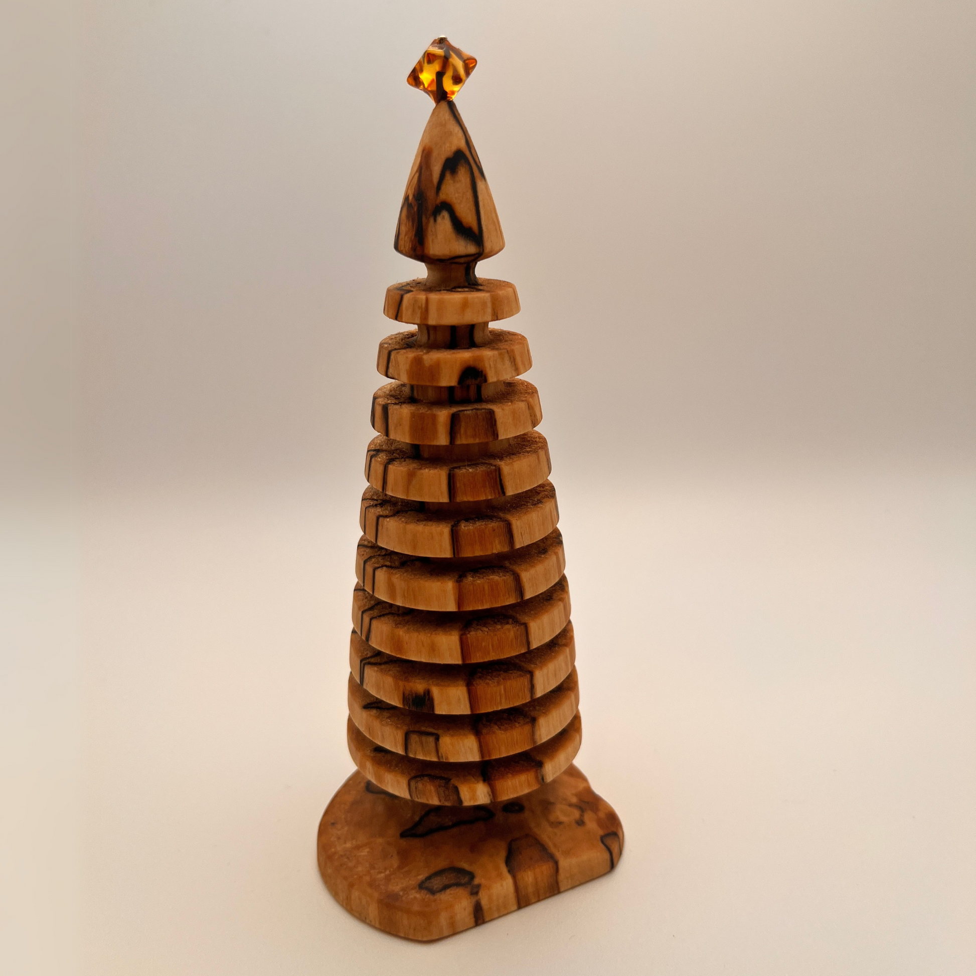 Dette charmerende juletræ i træ er hånddrejet af lokalt fremskaffet spaltet birk og toppet med en poleret ægte ravstjerne – et yndefuldt møde mellem natur, håndværk og nordisk tradition.