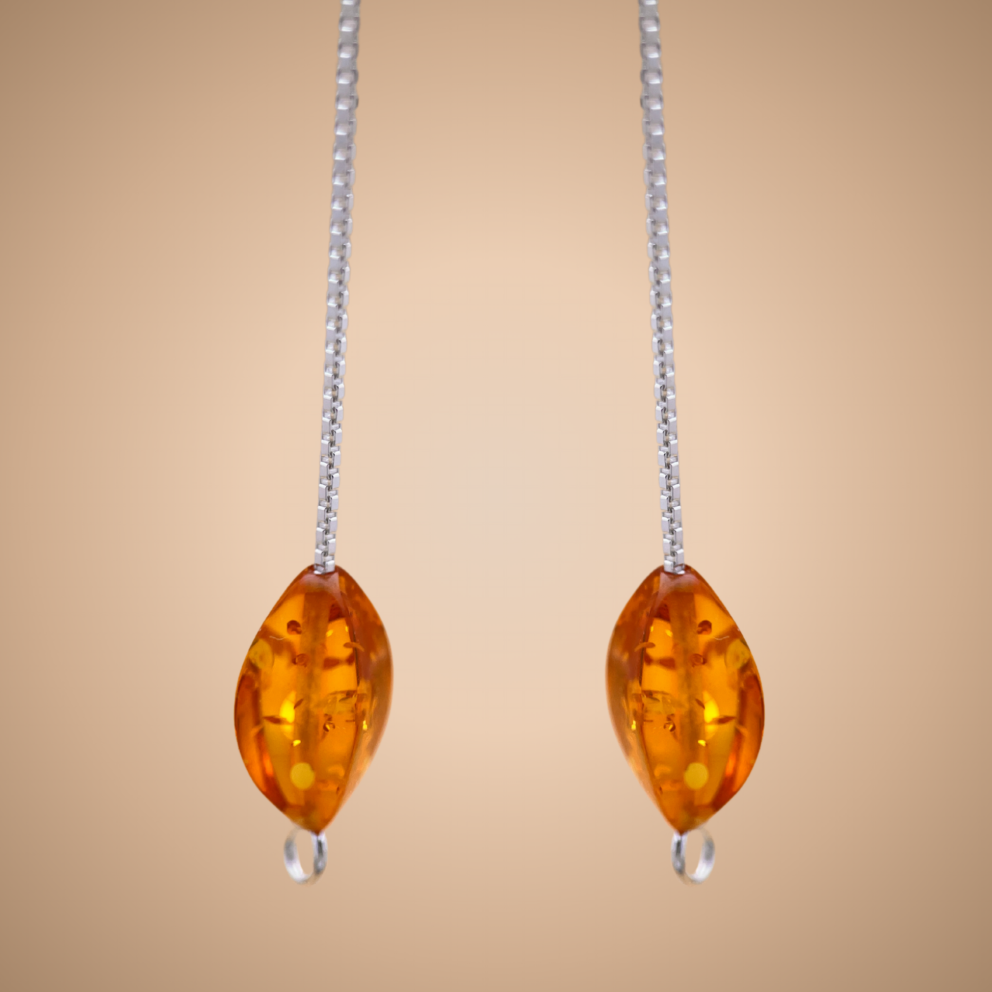 I den ene ende hænger en skulptureret ravperle i klar lys cognac , formet i en aflang oval med fire bløde facetter og blidt spidse ender . Den geometriske silhuet bringer en moderne kant til den organiske varme fra rav og skaber et design, der er både moderne og tidløst.