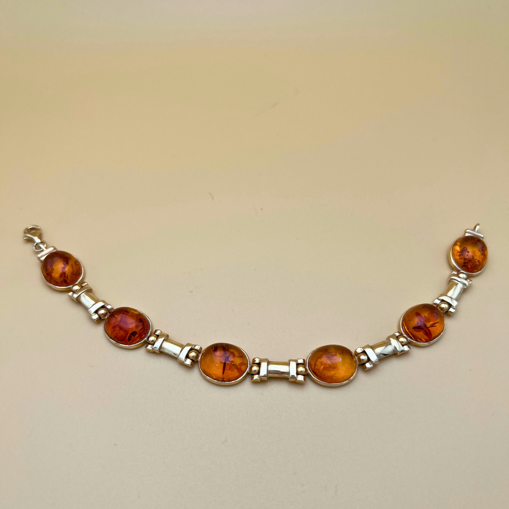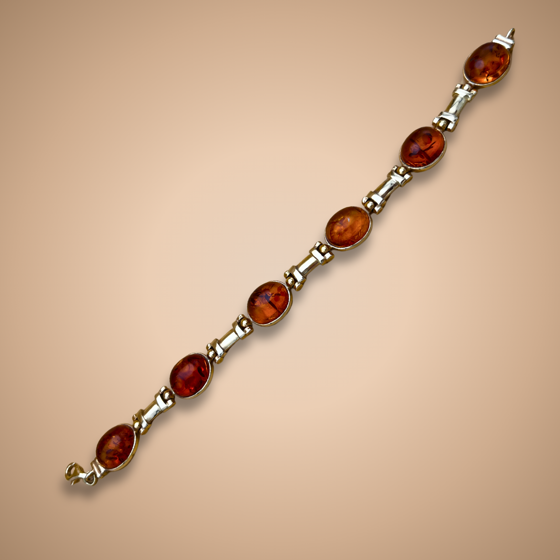 Armbåndet er besat med massivt 14 karat guld og har syv ovale ravcabochoner i en lys cognac-tone. Hver kuppel afslører fine overfladekrakeleringer – et naturligt resultat af blid opvarmning – der skaber en blød indre glimmer og en følelse af bevægelse i stenen.