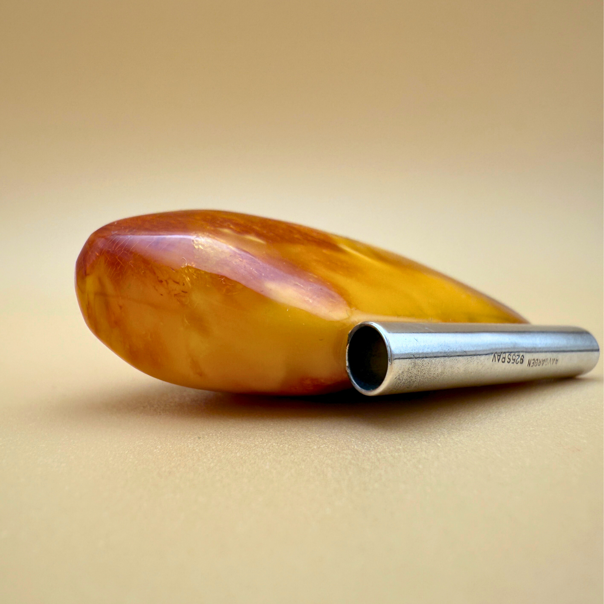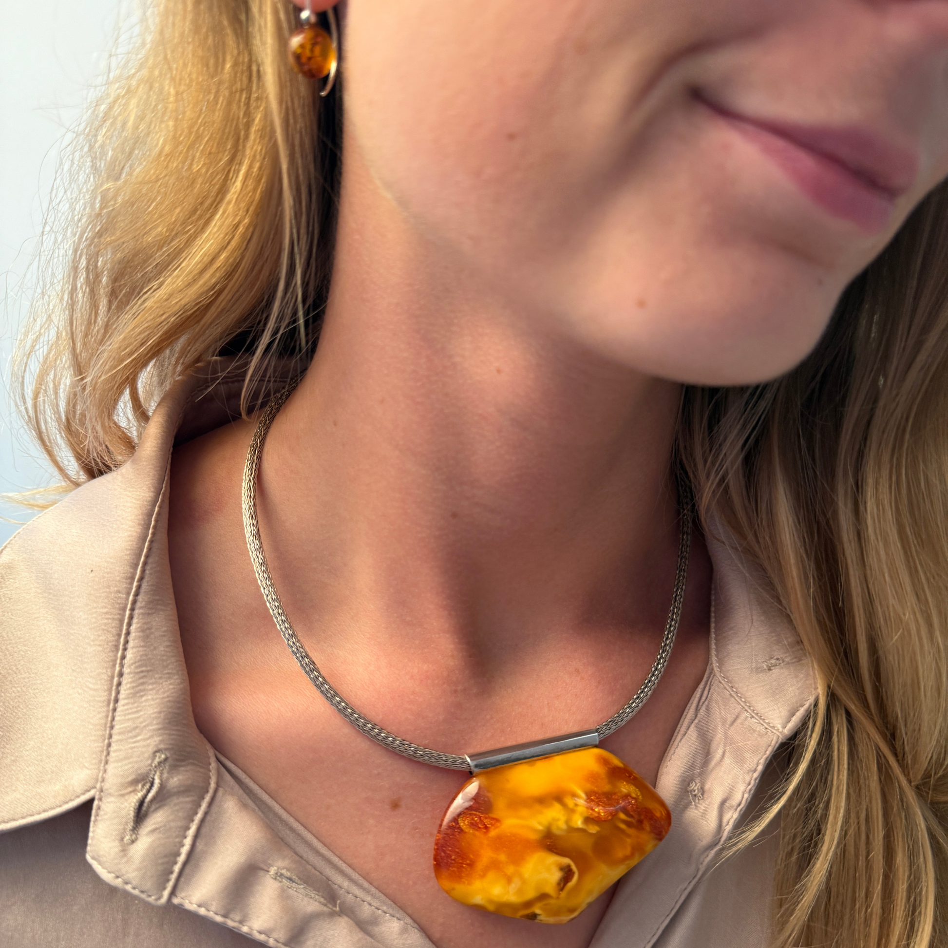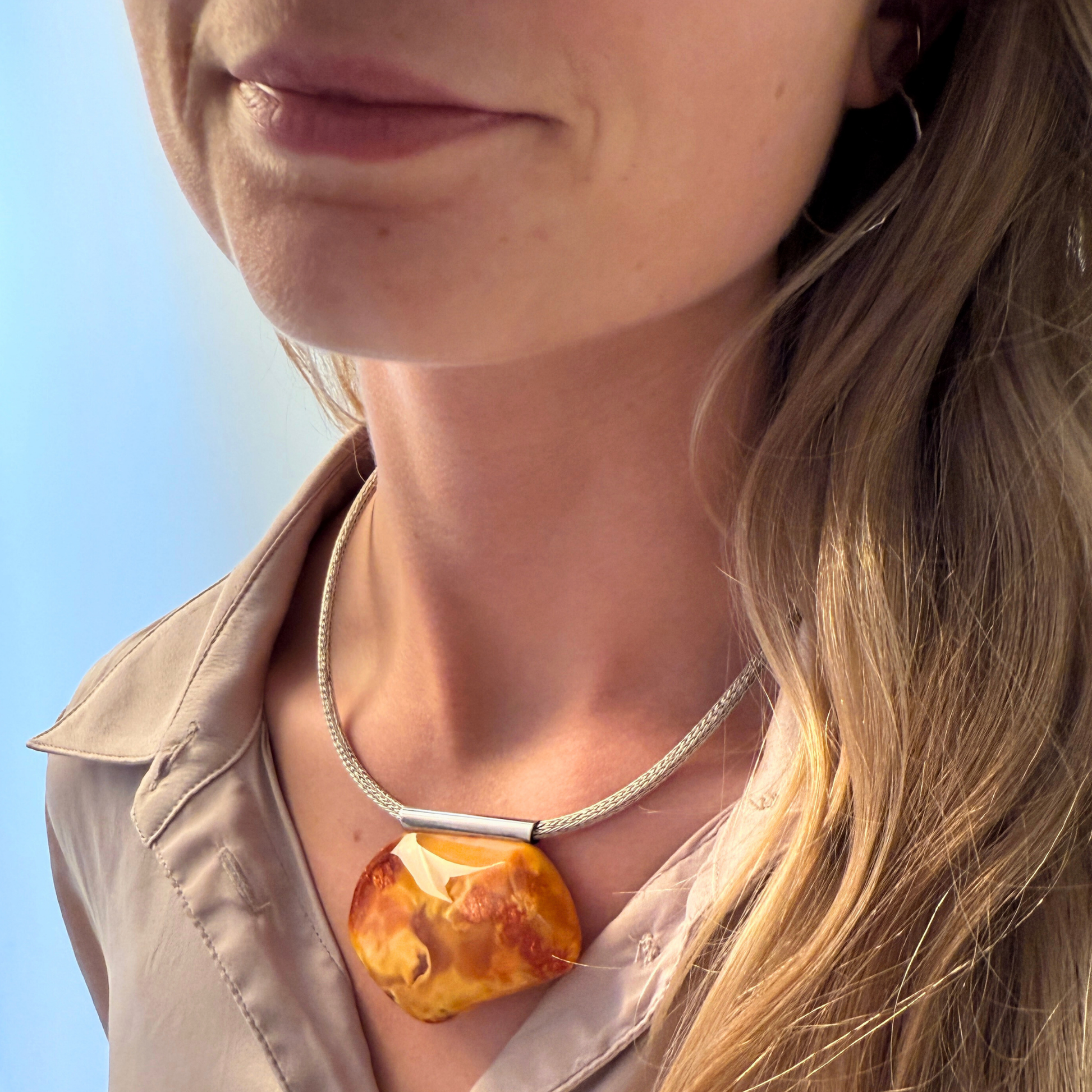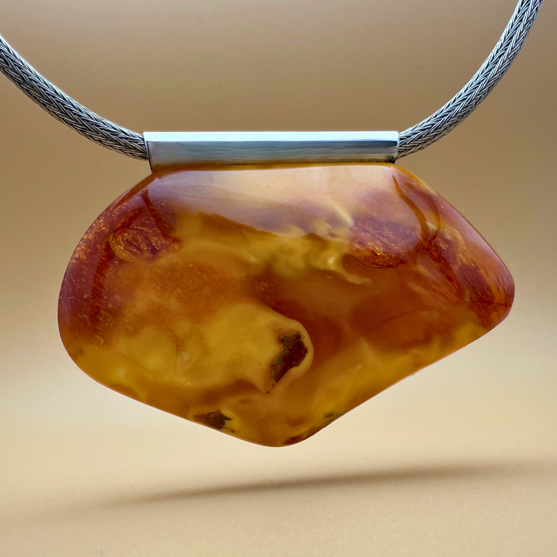 Dette unikke vedhæng er håndlavet i vores eget værksted på Ravgården , nær Vesterhavet. Det har et smukt formet stykke gyldent rav med en unik blanding af cremede toner, klare ravstriber og en diskret shimmereffekt . Du finder også et par små plantedele , der giver smykket en autentisk og organisk karakter.