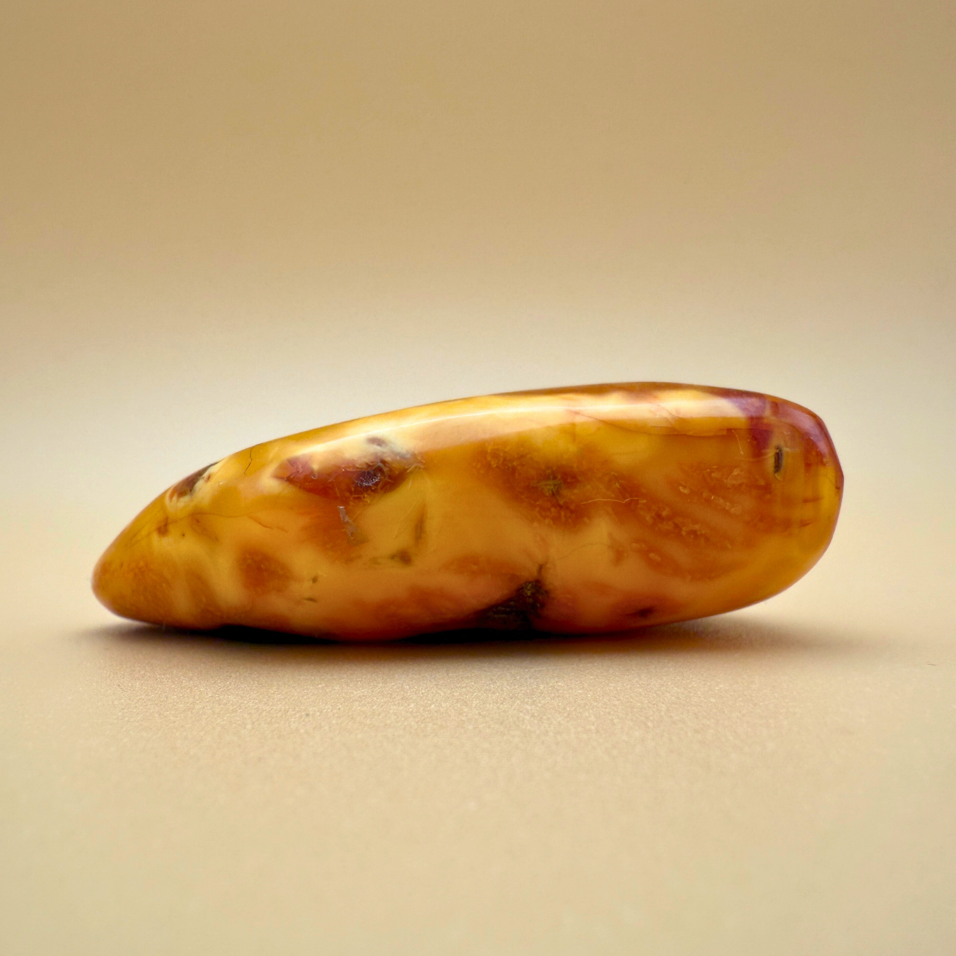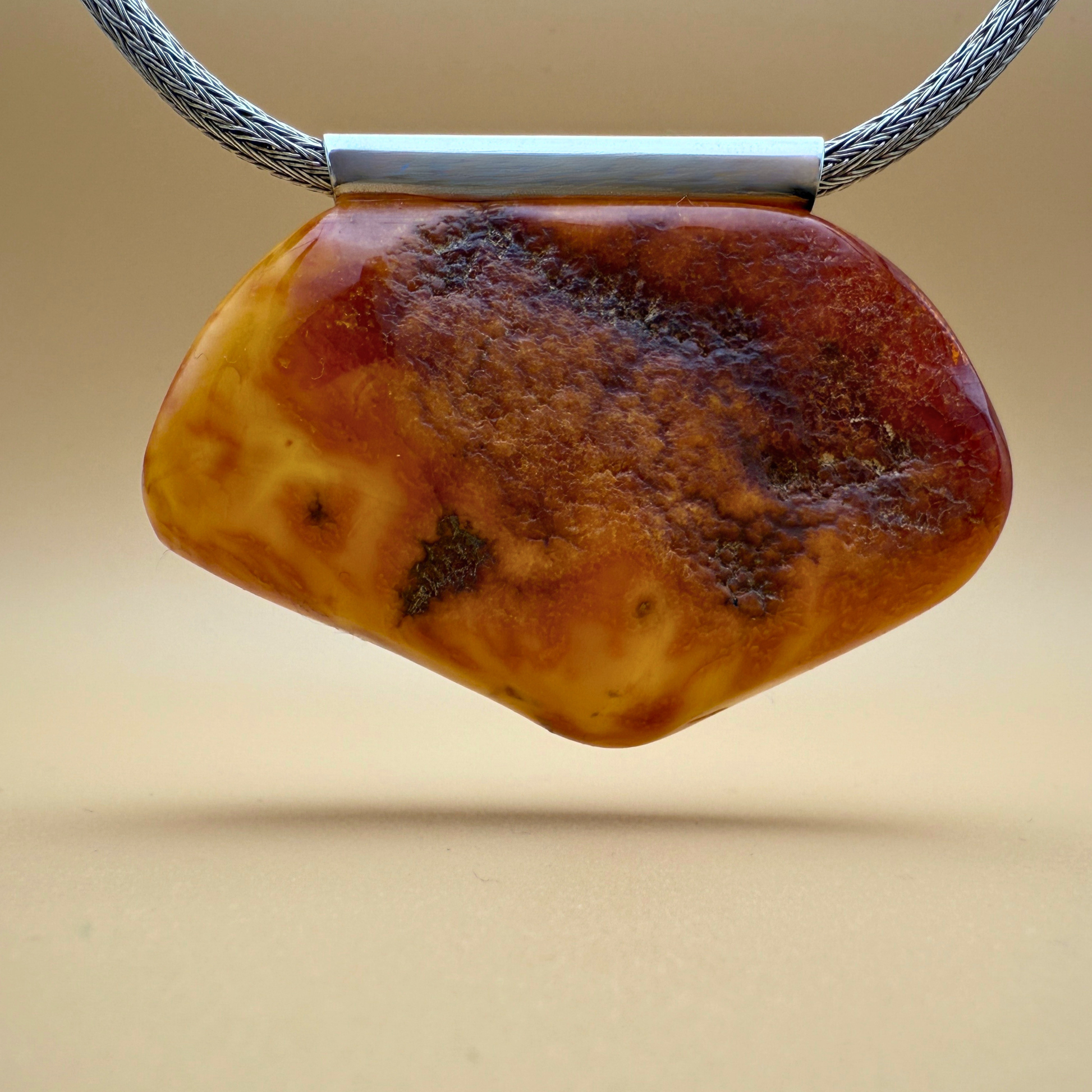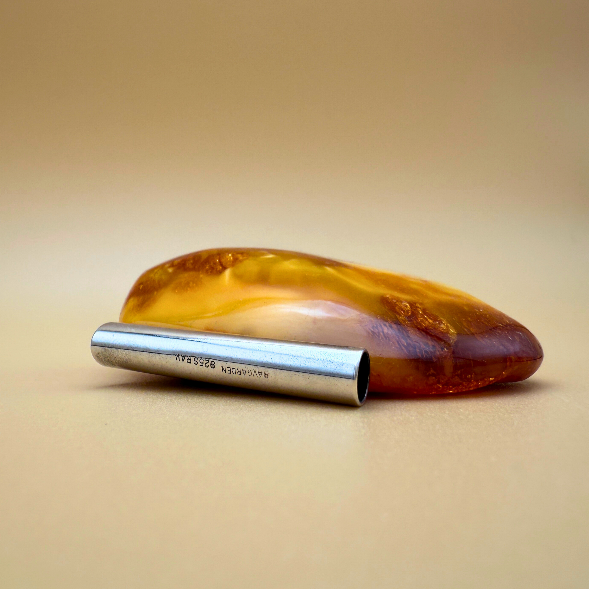 På bagsiden kan man skimte den rå ravoverflade – en naturlig påmindelse om dens uberørte tilstand gennem millioner af år , mens forsiden afslører den skjulte skat indeni.