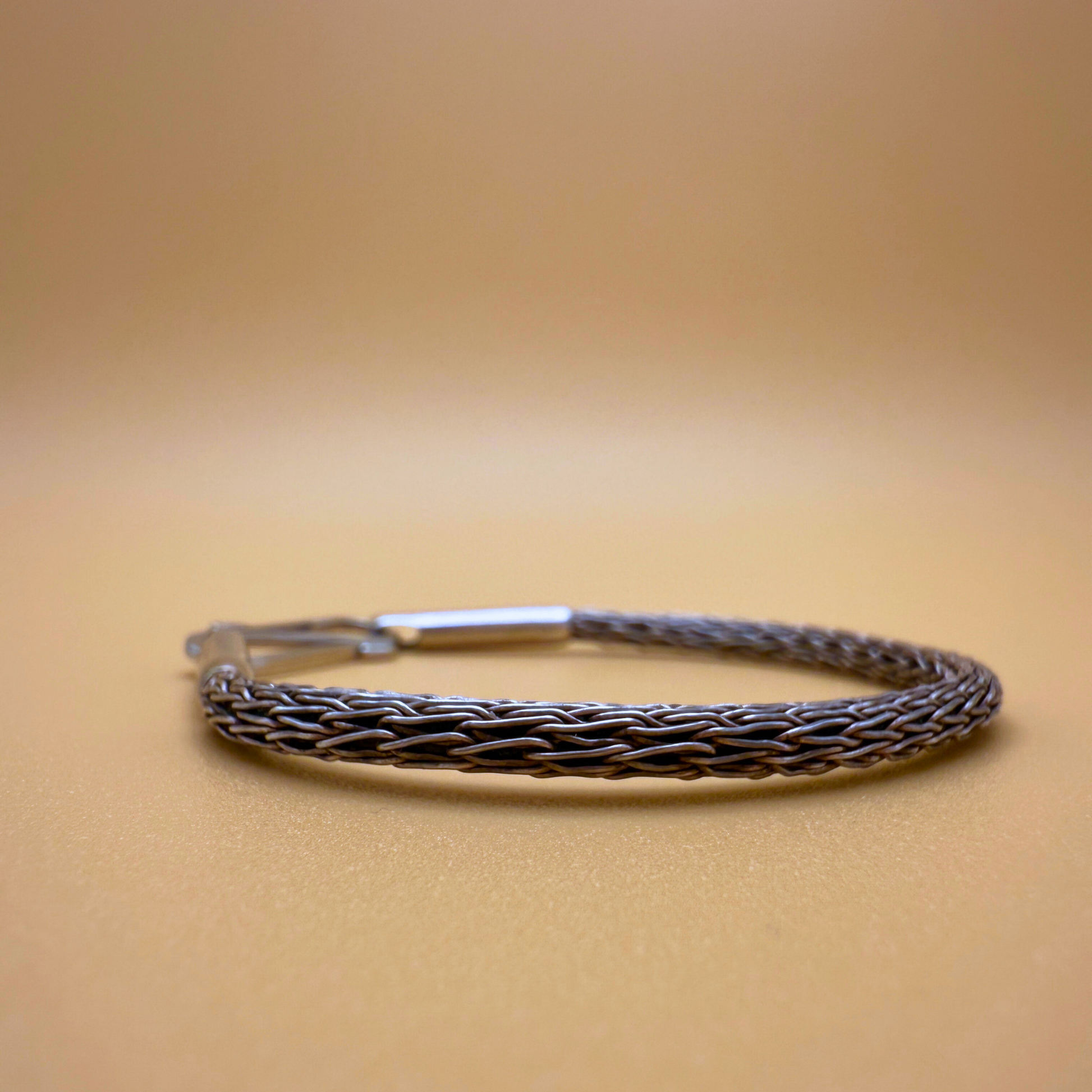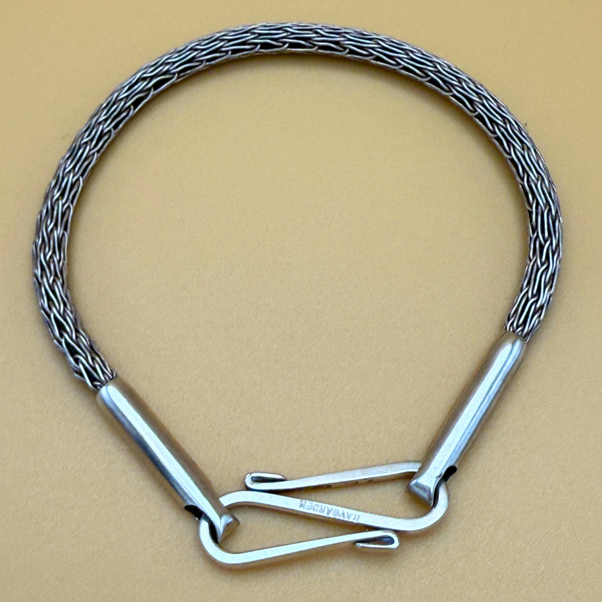 Dette armbånd er lavet med en enkeltstrikningsteknik med 0,35 mm fin sølvtråd (999) , hvilket danner et mere åbent mønster end vores dobbeltstrikkede designs. Den sorte læderkerne tilføjer diskret styrke og lader den håndlavede struktur forblive synlig – hvilket giver smykket en mere rå og jordnær fornemmelse .