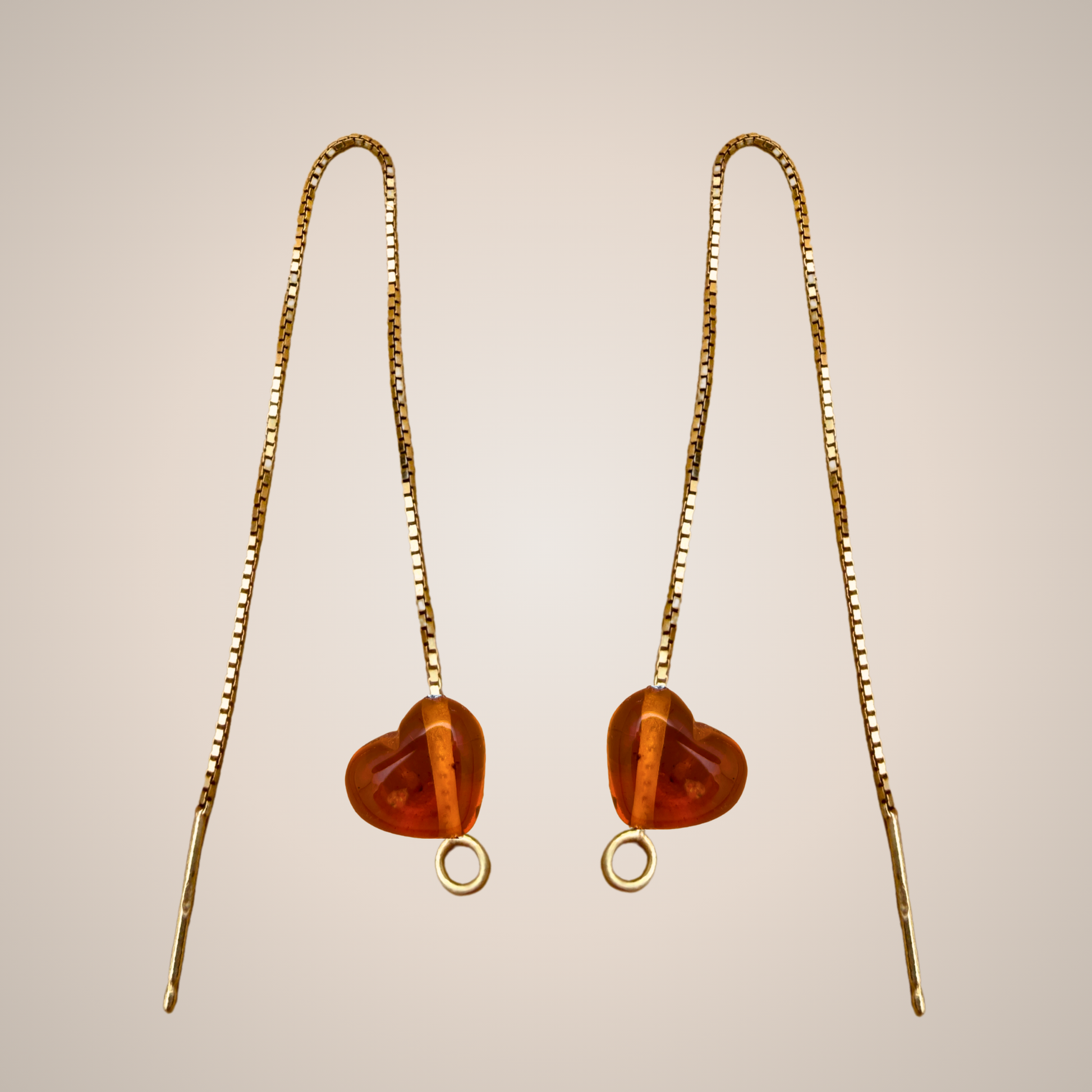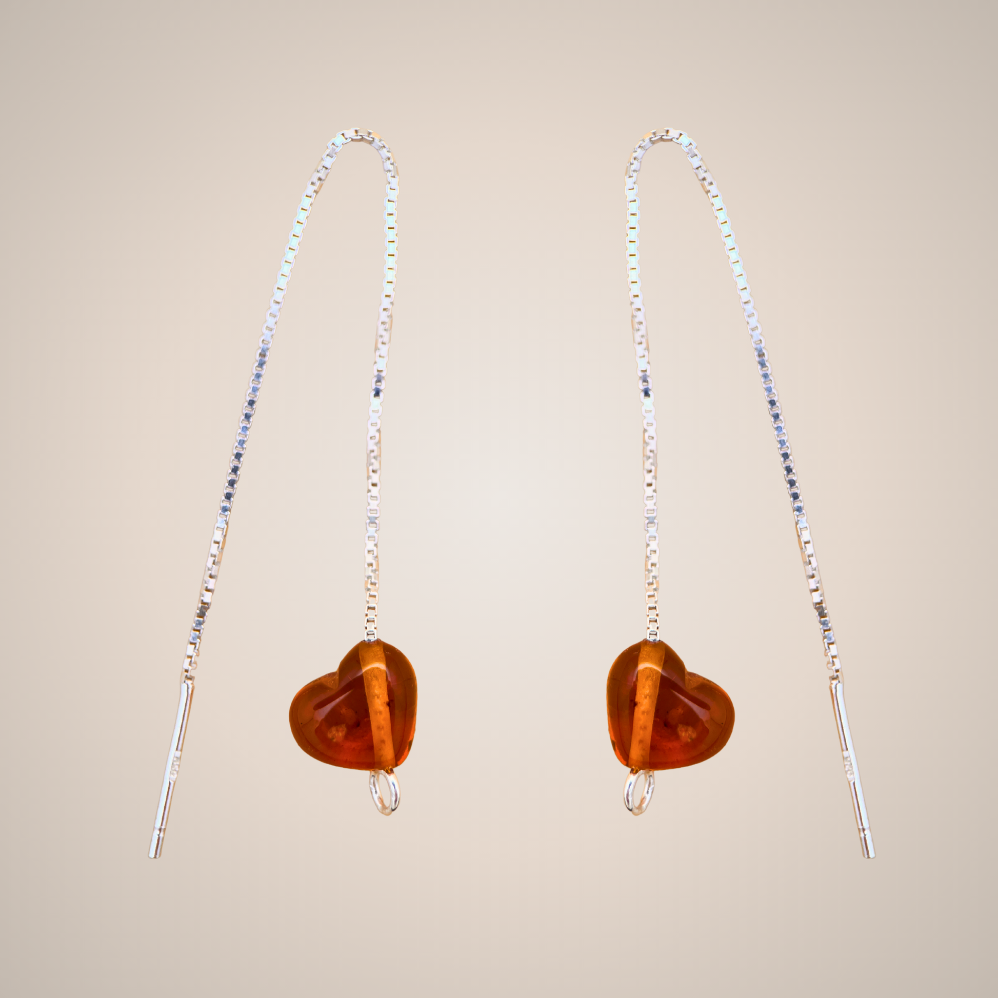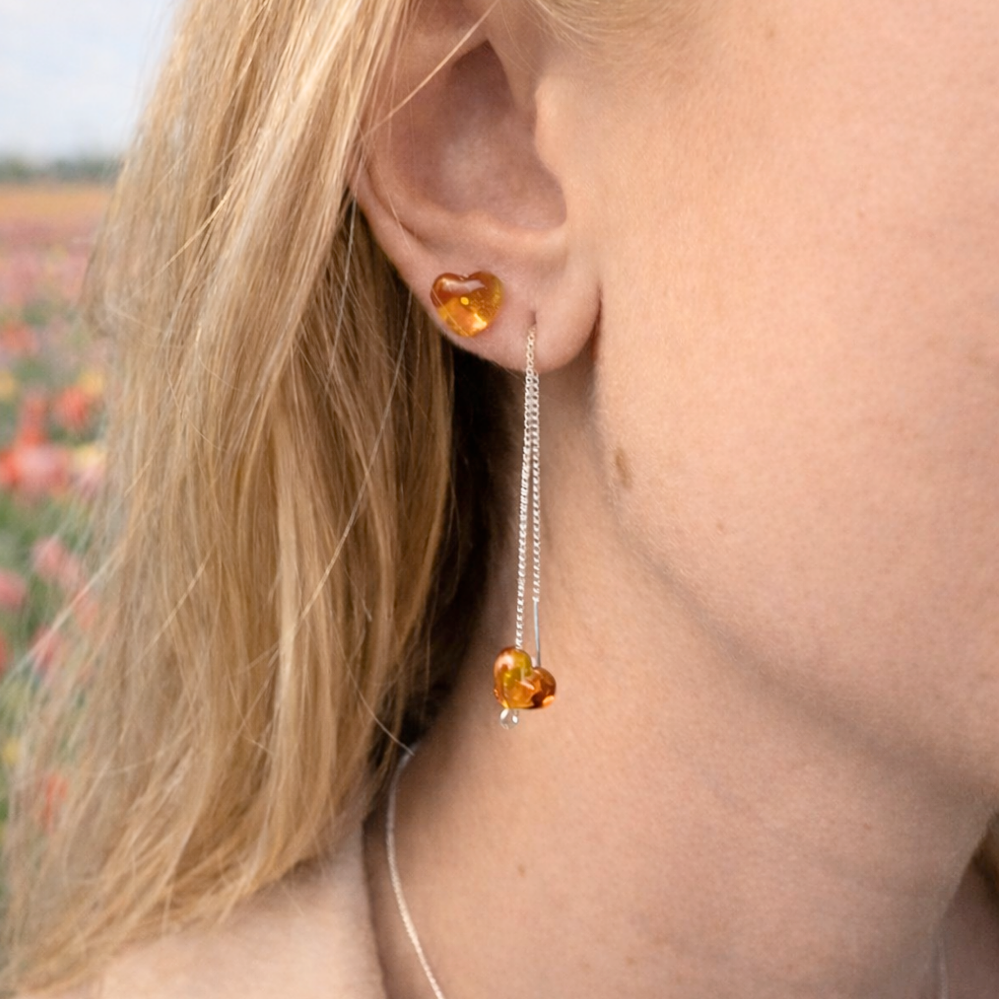 I den ene ende af hver kæde hænger et lyst cognac-ravhjerte , vinklet let skævt for at skabe en legende og organisk følelse . Den varme, klare tone i ravfarvet fanger lyset smukt, mens øreringene svajer og tilføjer en naturlig gylden glød til dit look.