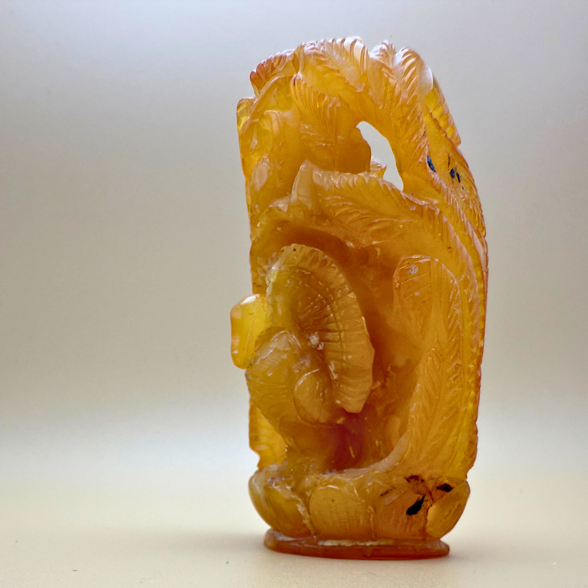 Dette er et helt unikt stykke – baltisk rav, der rejste til Indien, hvor det blev forvandlet af lokale indiske håndværkere, der bringer generationer af kunstnerisk tradition ind i deres arbejde. Selve ravet har bevaret varme og lys i millioner af år og bærer nu historien om to kulturer, der mødes, i ét ekstraordinært stykke.