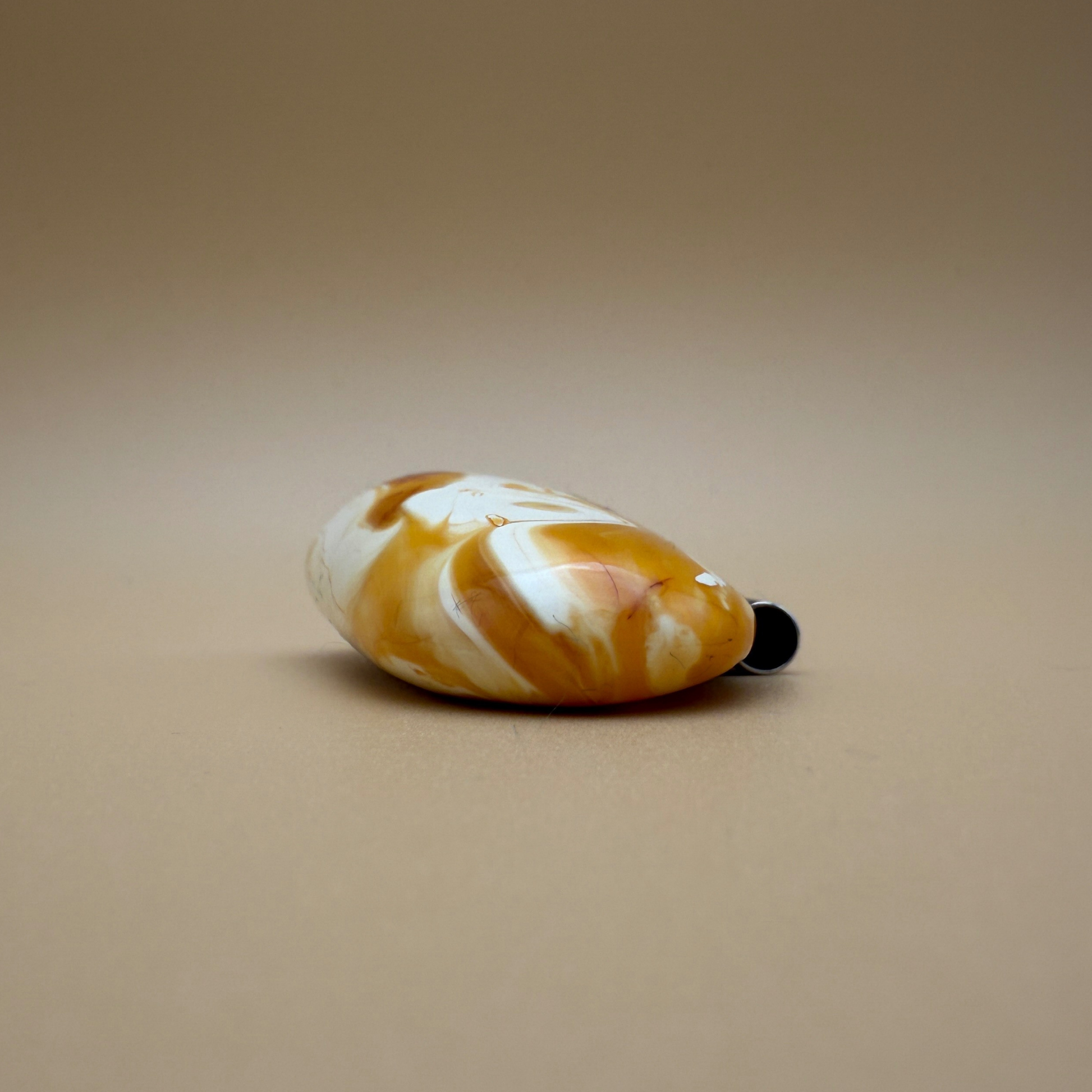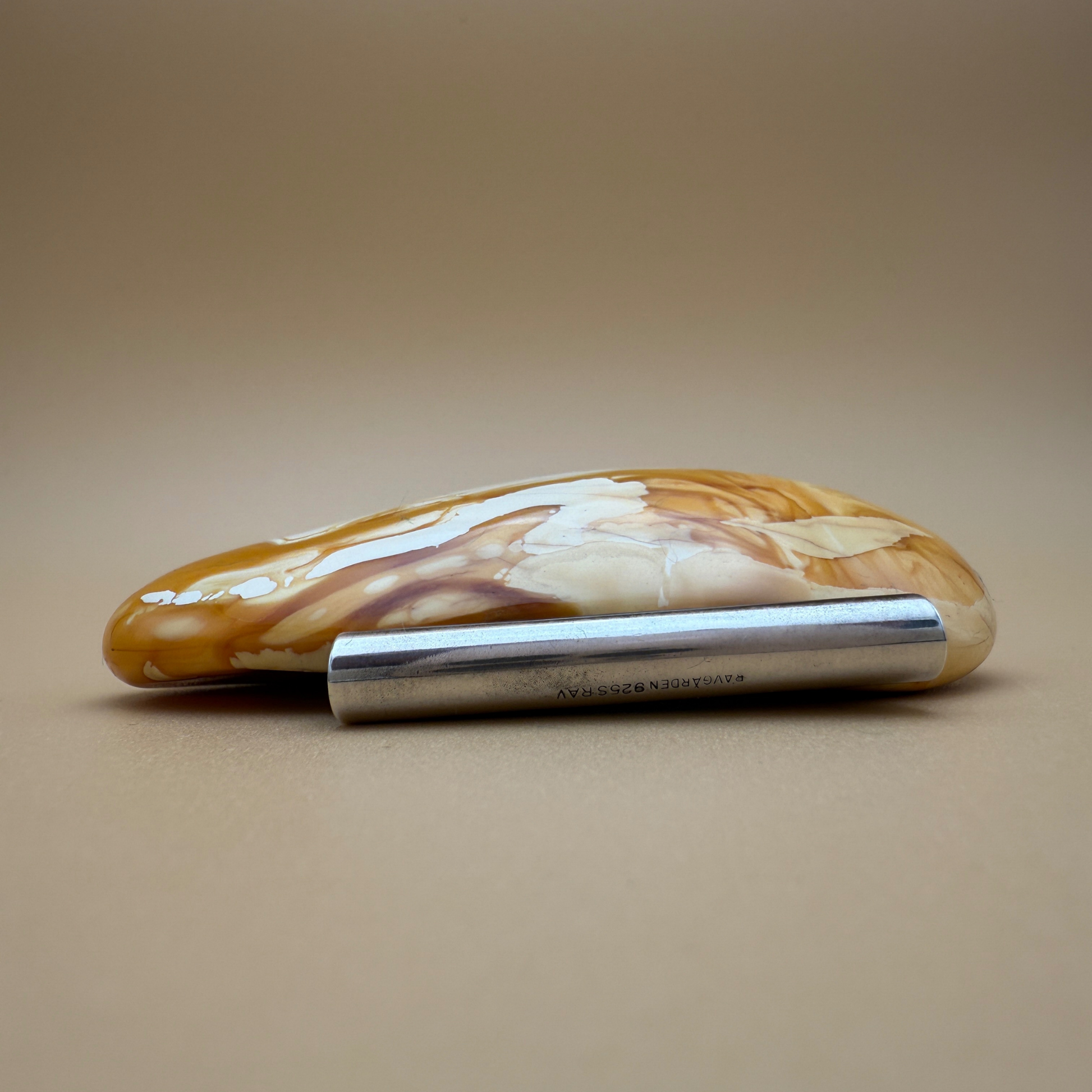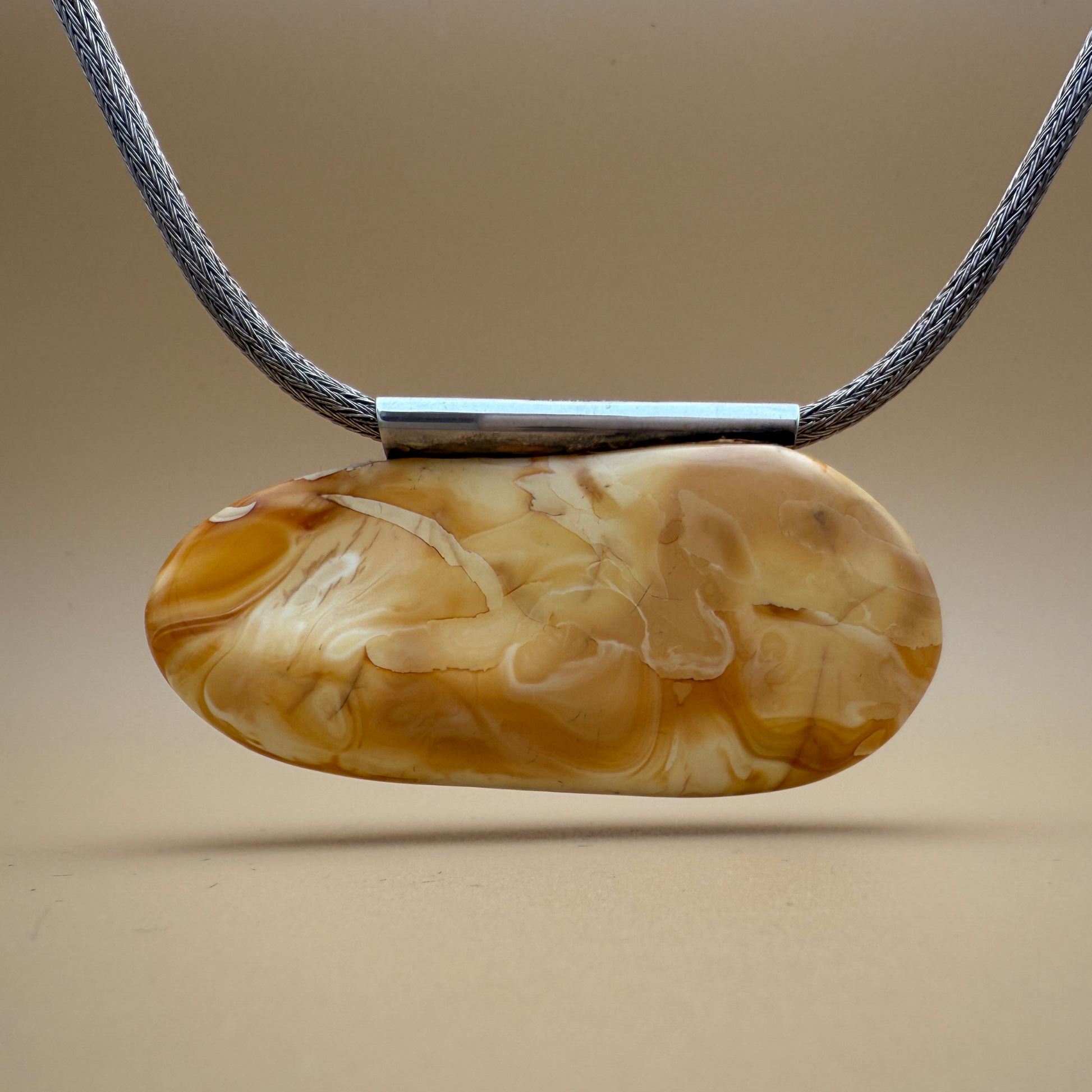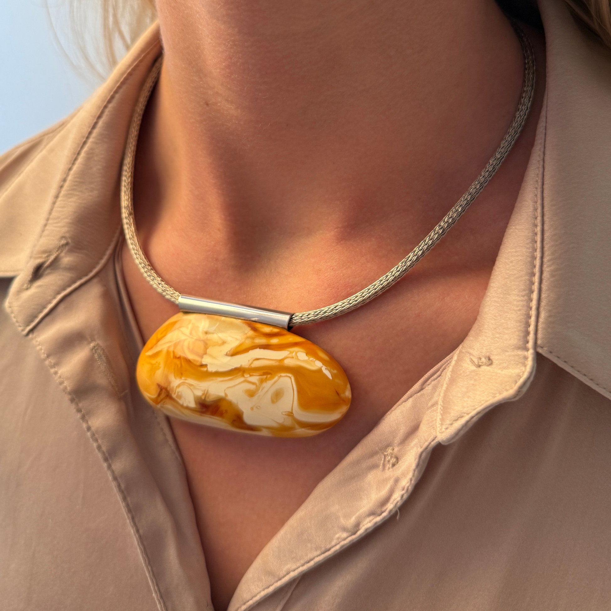 Dette unikke ravvedhæng er håndlavet i vores eget værksted på Ravgården , kun fem kilometer fra det brusende vesterhav. Den store, ovale form fremviser et fantastisk spil – en naturlig blanding af cremet hvidt rav, gyldne toner og delikate hvirvler af klart rav med en subtil shimmereffekt .