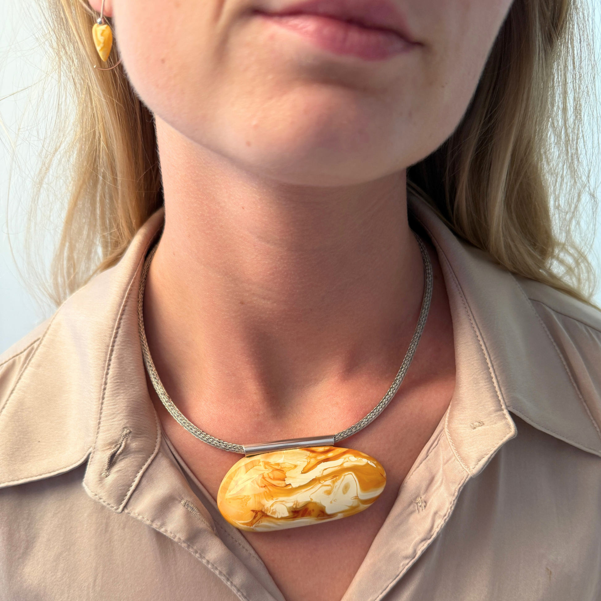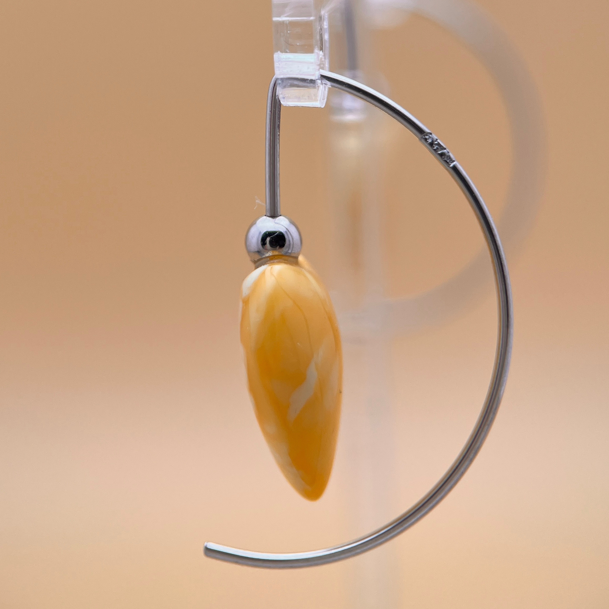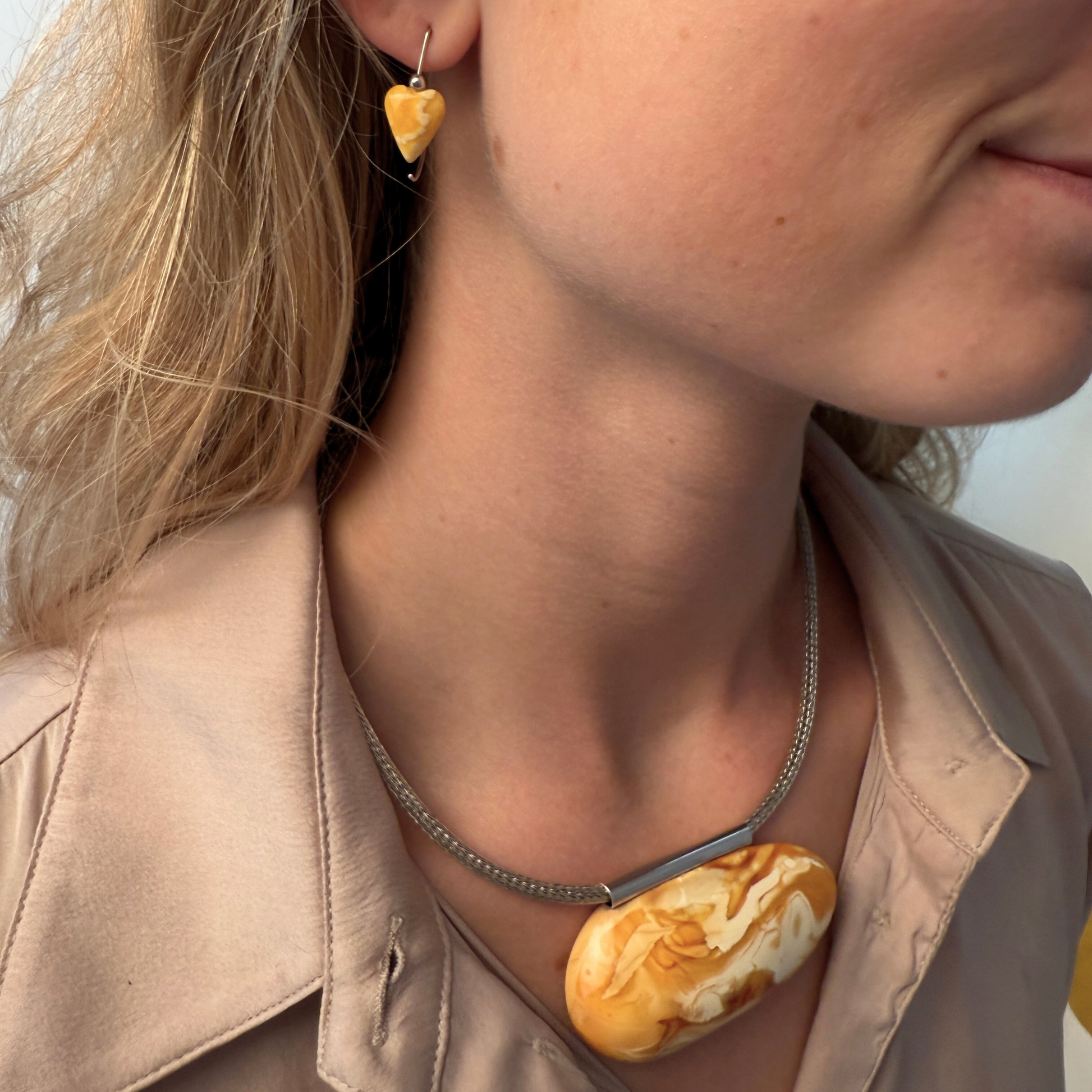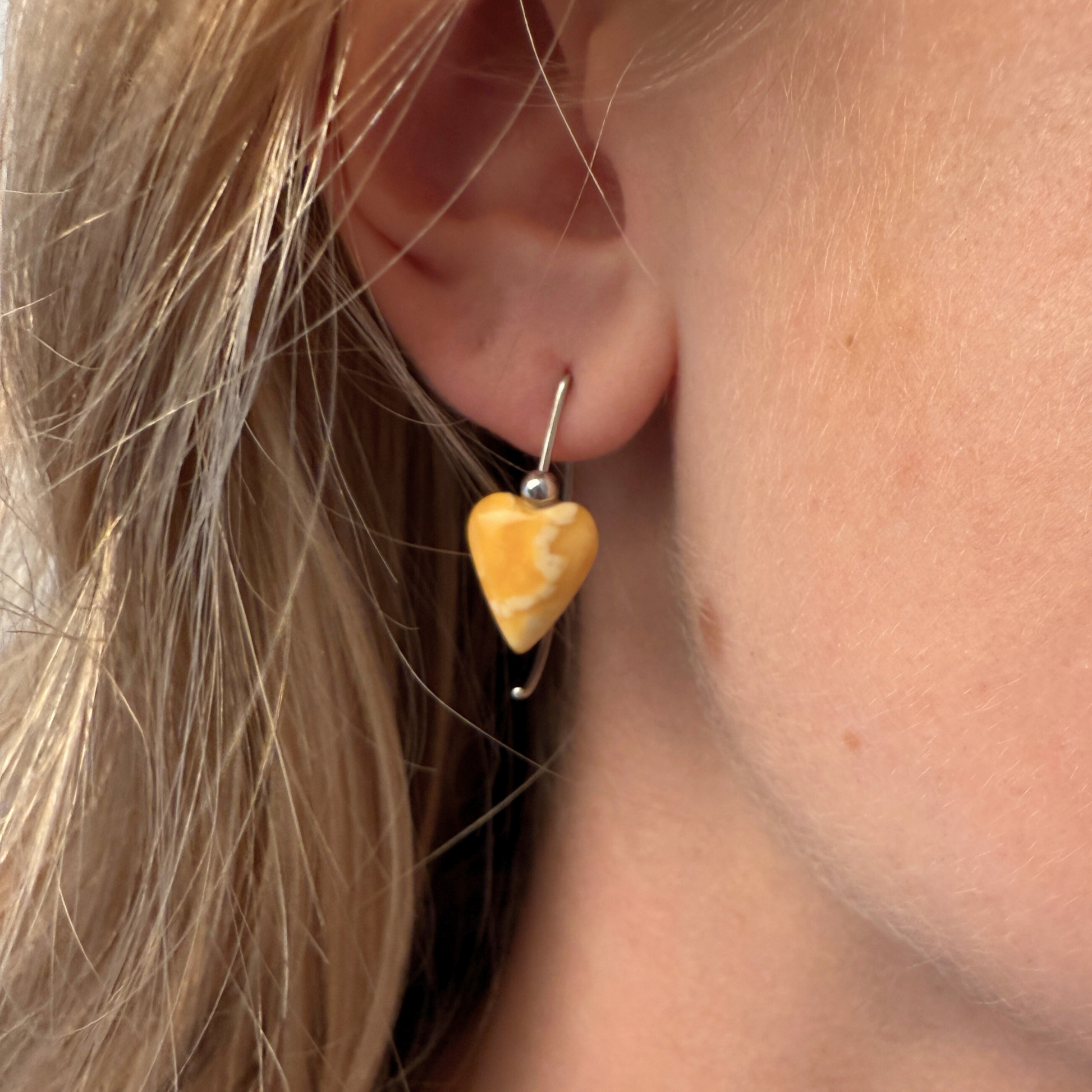Hjerterne er formet med omhu og fremhæver ravs blide hvirvler og varme, mælkeagtige toner. Kombinationen af hvid og lysegul giver dem et fredfyldt, lysfyldt udseende – både diskret og karakterfuld. Disse øreringe er virkelig enestående , med kun dette par tilgængeligt.