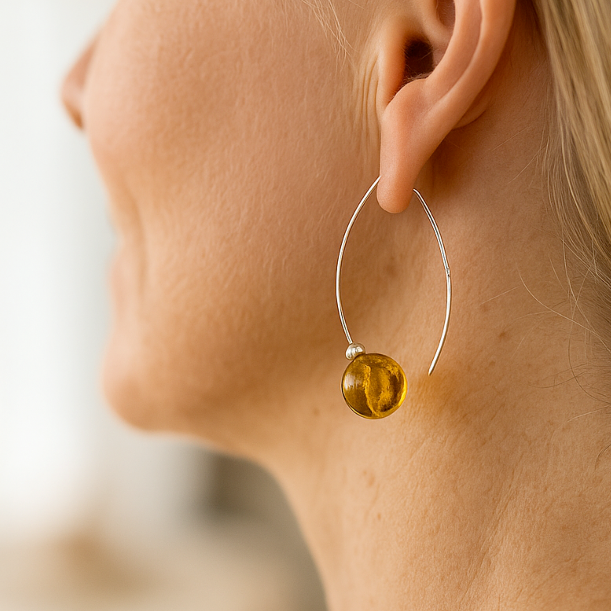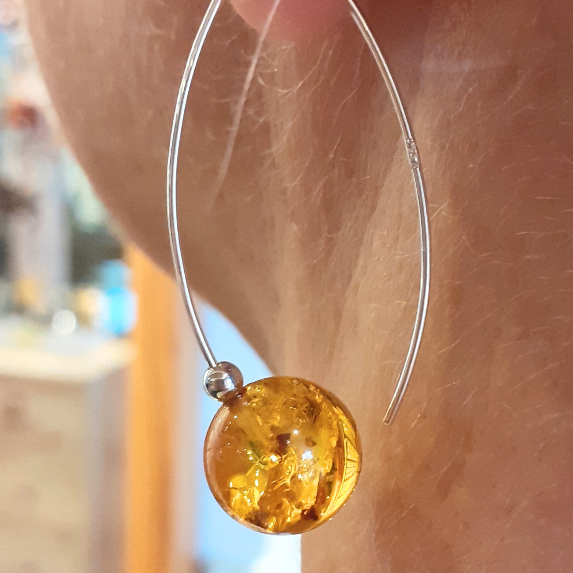 Hvert par har en rund 12 mm ravperle, der er ophængt i en buet 0,9 mm sterlingsølvtråd, der hænger lidt længere, hvilket skaber en blid bevægelse og en smukt afbalanceret silhuet. En lille sølvperle hviler over ravkuglen og holder kompositionen ren, minimalistisk og umiskendeligt Ravgården-agtig.