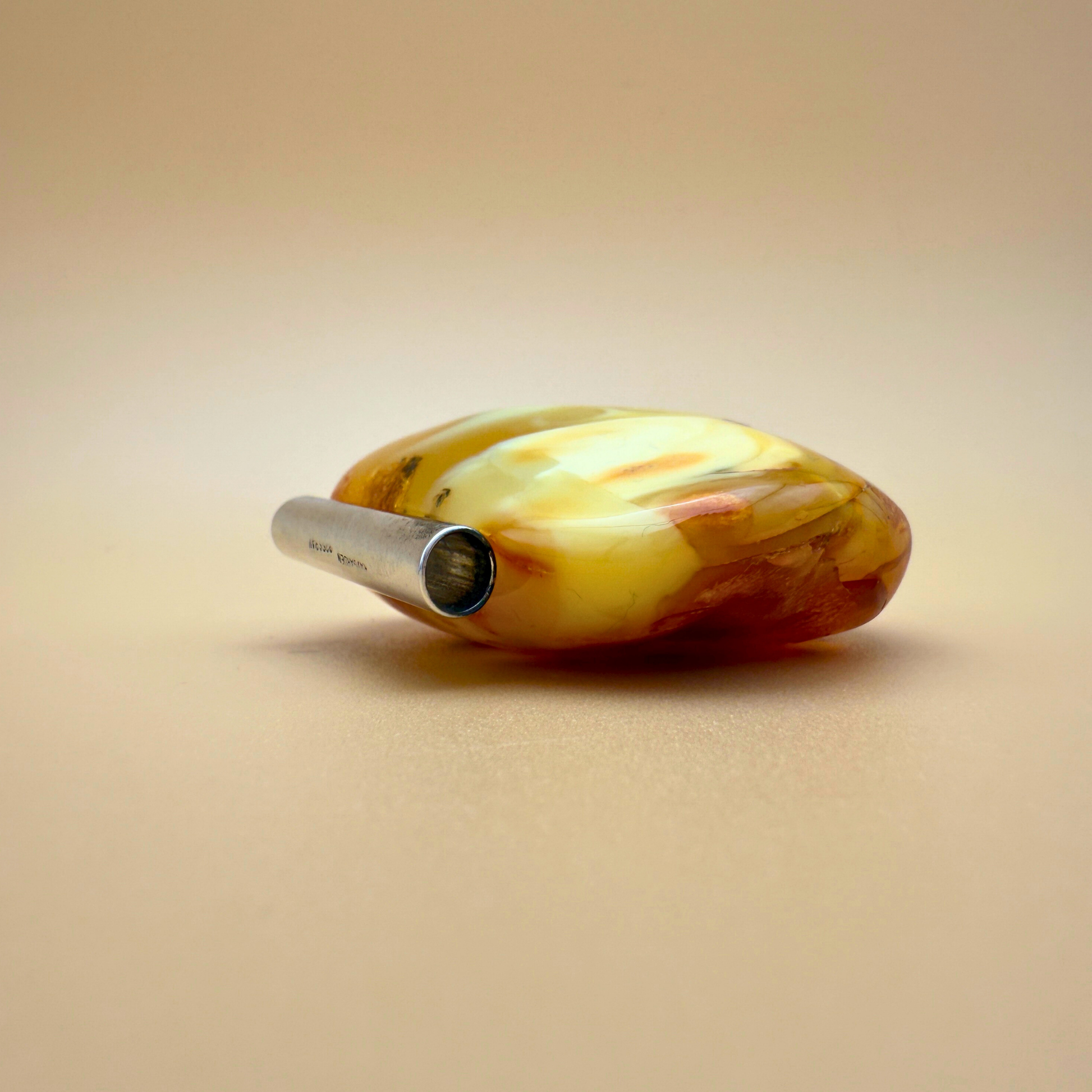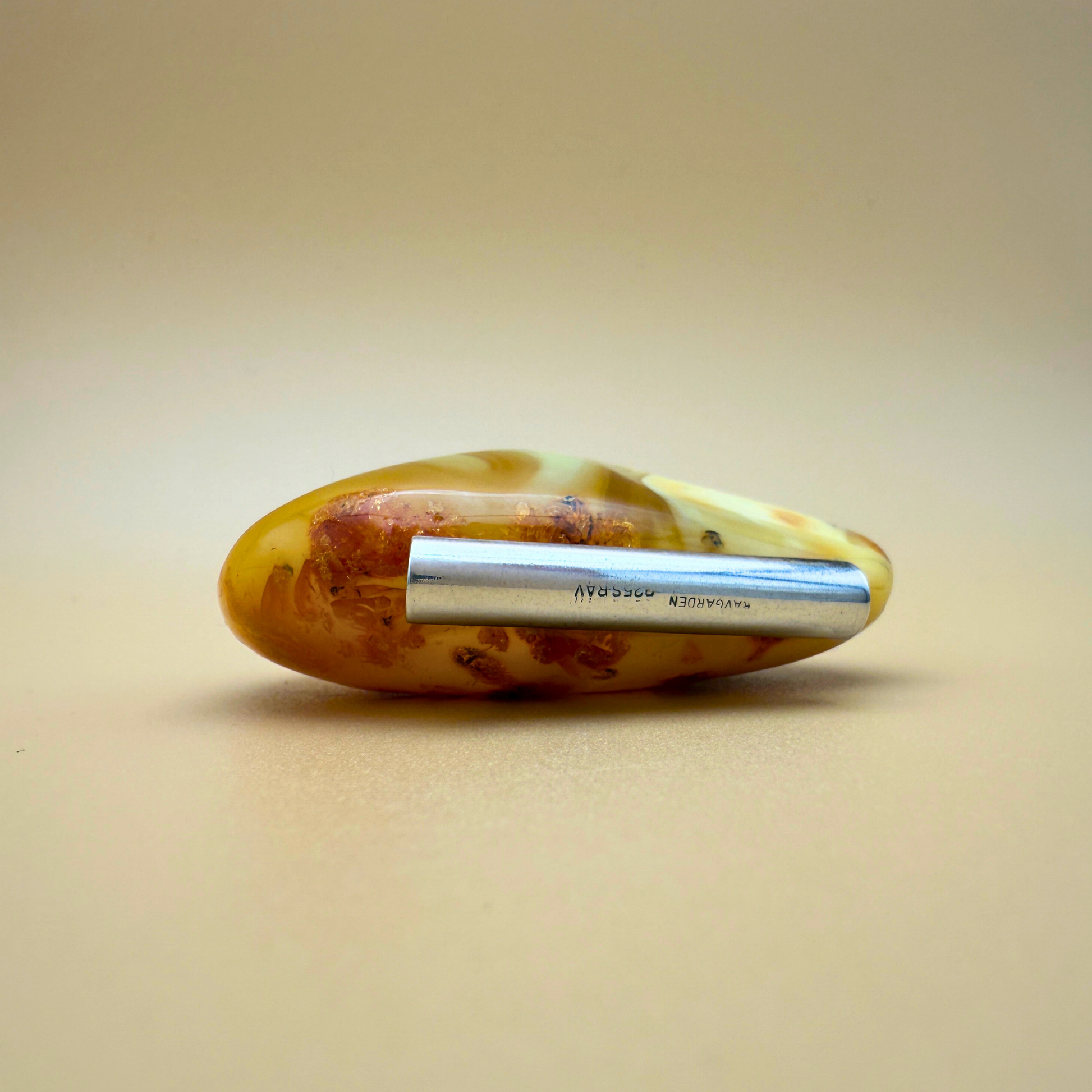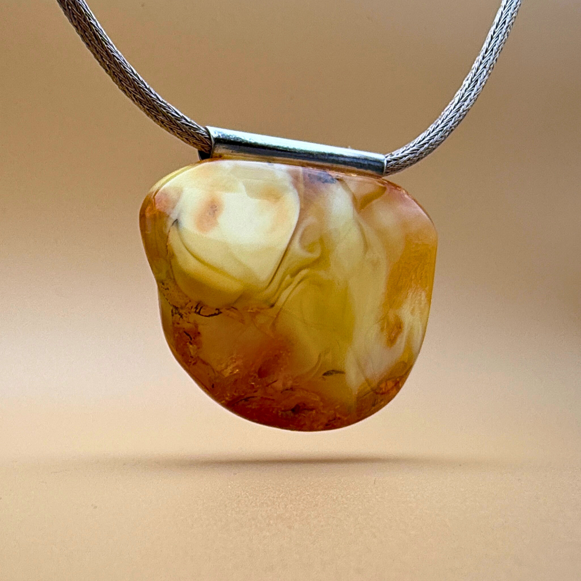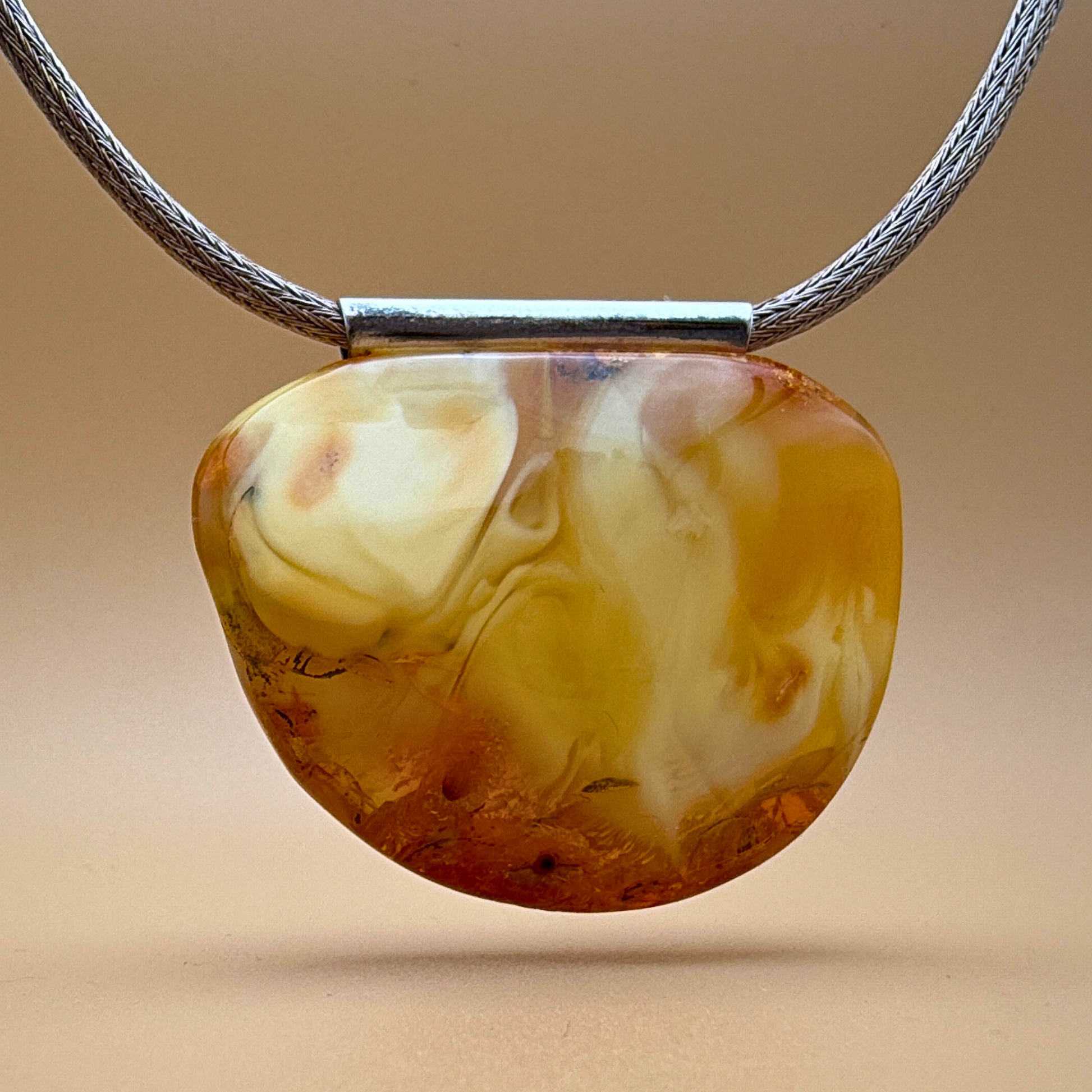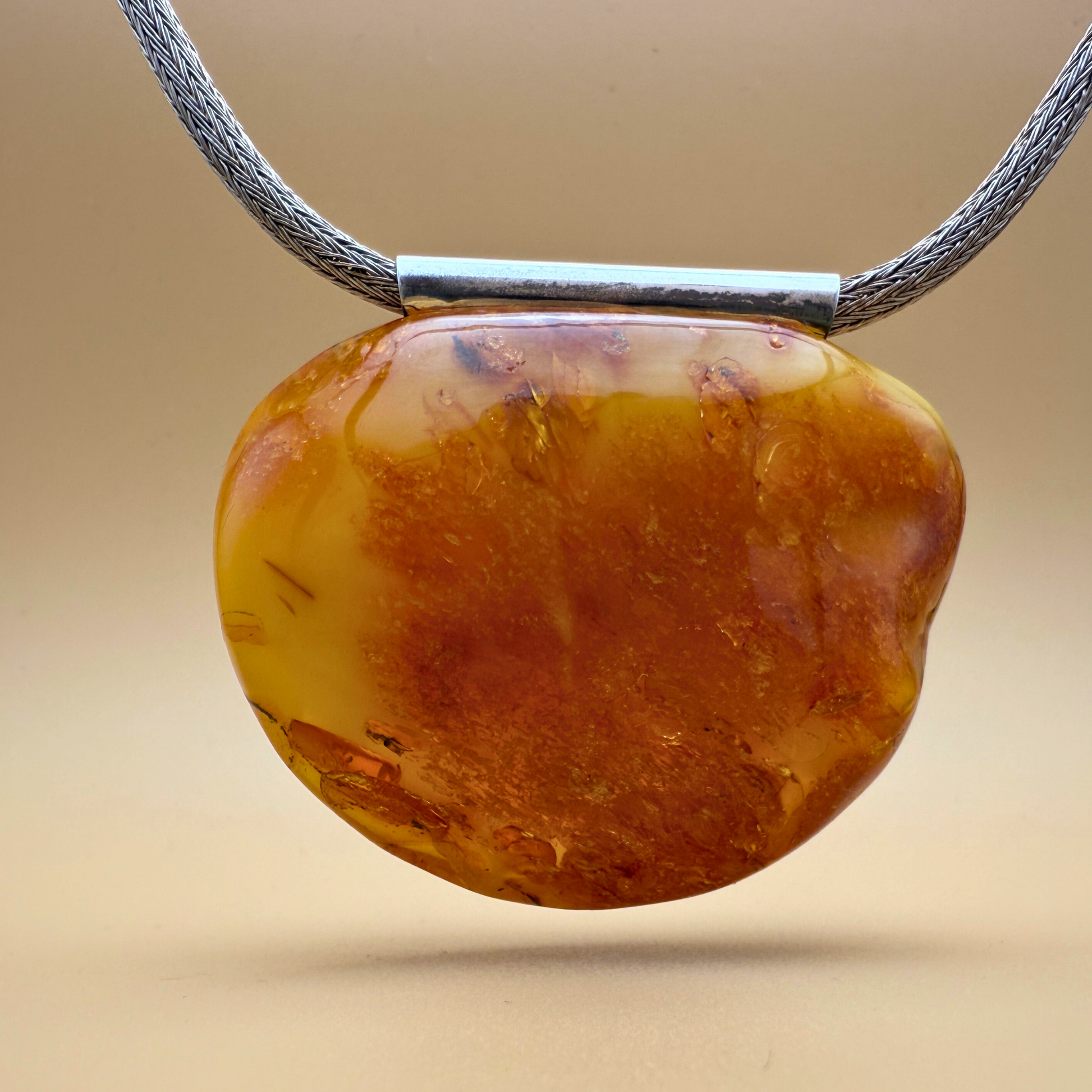 Dette exceptionelle vedhæng er håndlavet i vores eget værksted på Ravgården , ikke langt fra Nordsøen. Det er fremstillet af et smukt stykke nordisk rav i en unik kombination af cremet hvid , mælkegul og klar rav med en naturlig shimmereffekt .