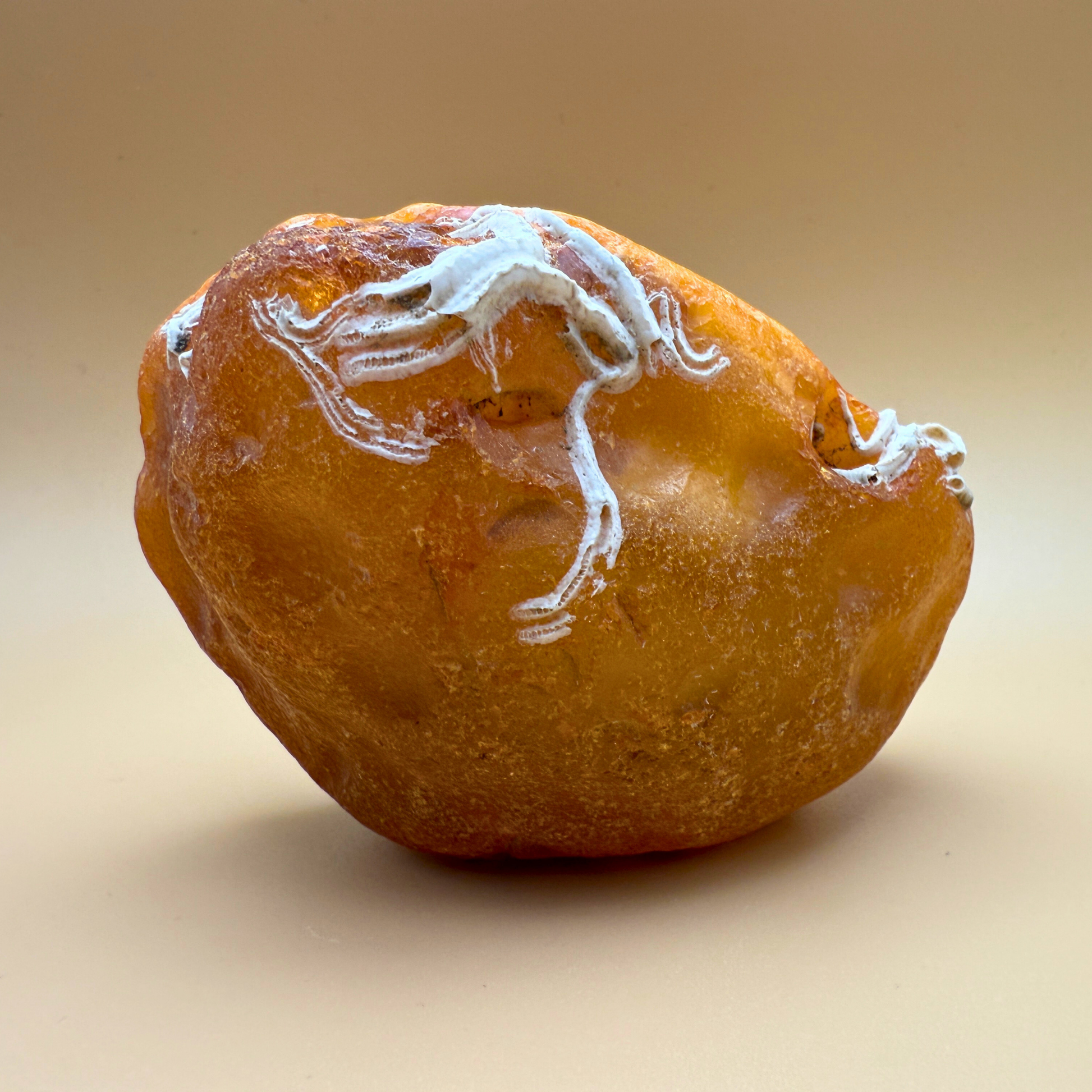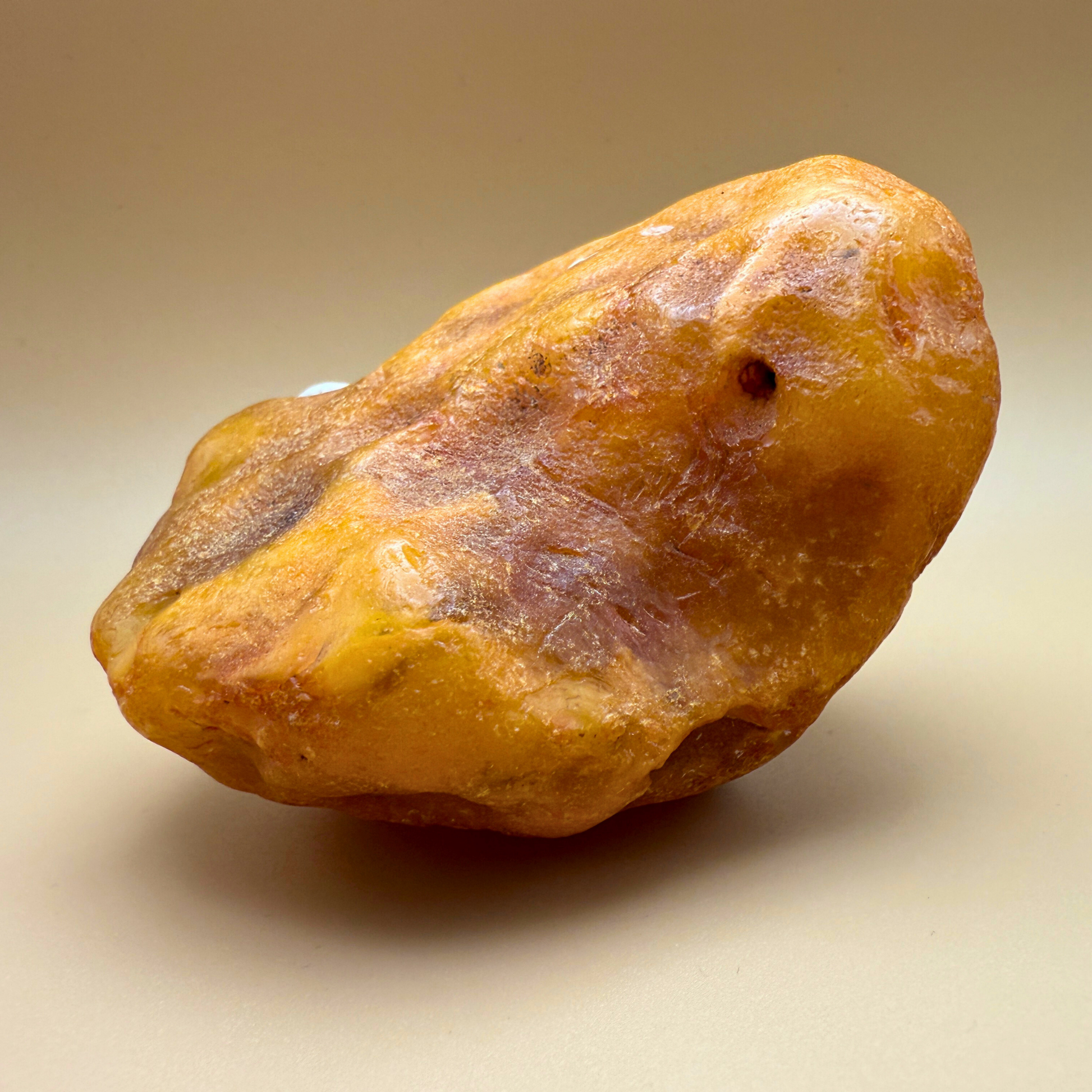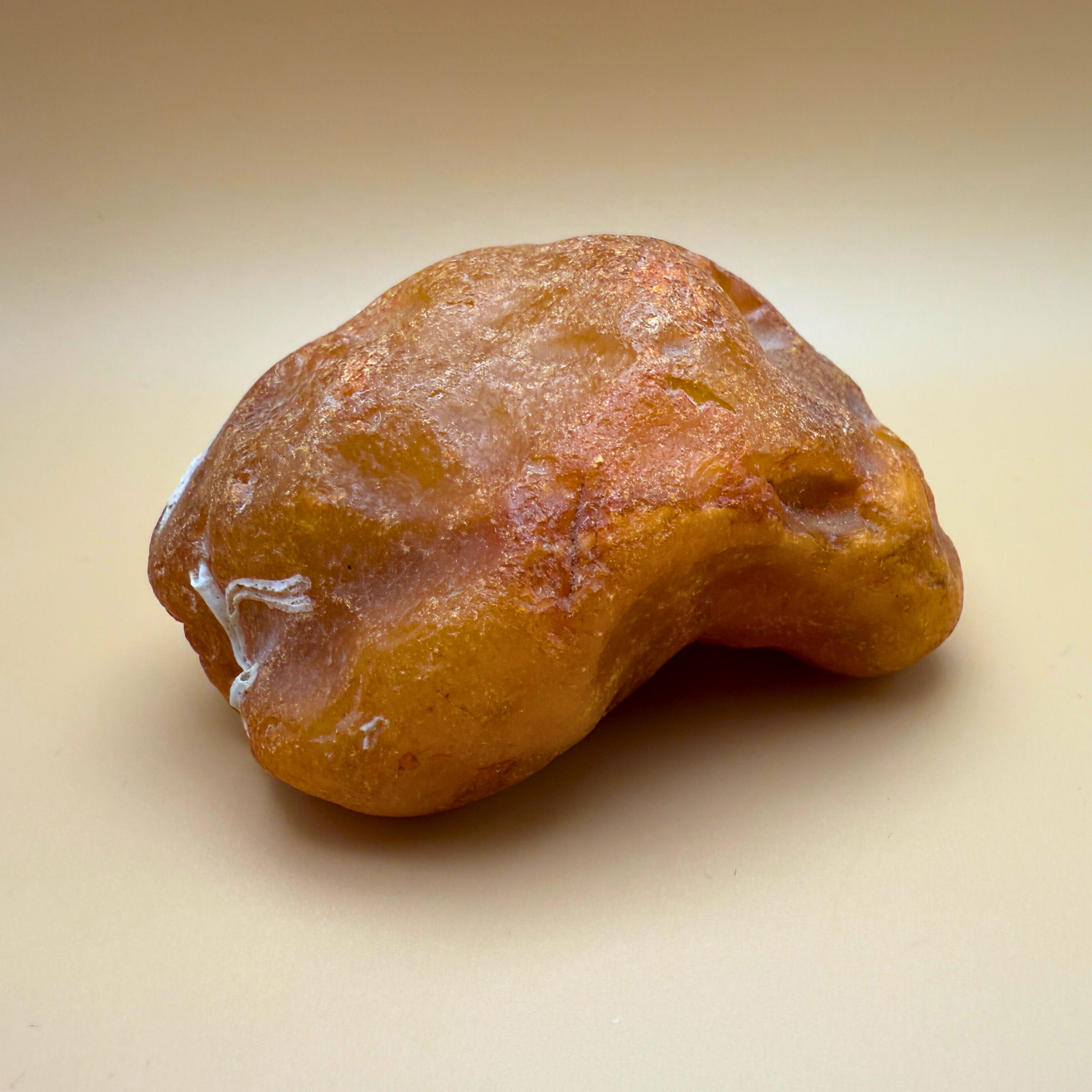 Dette rå stykke dansk rav blev fundet i det kolde vand omkring Danmark og vejer imponerende 226 gram . Dets rige gyldne farvetone og glatte, organiske overflade fortæller historien om tid og tidevand.