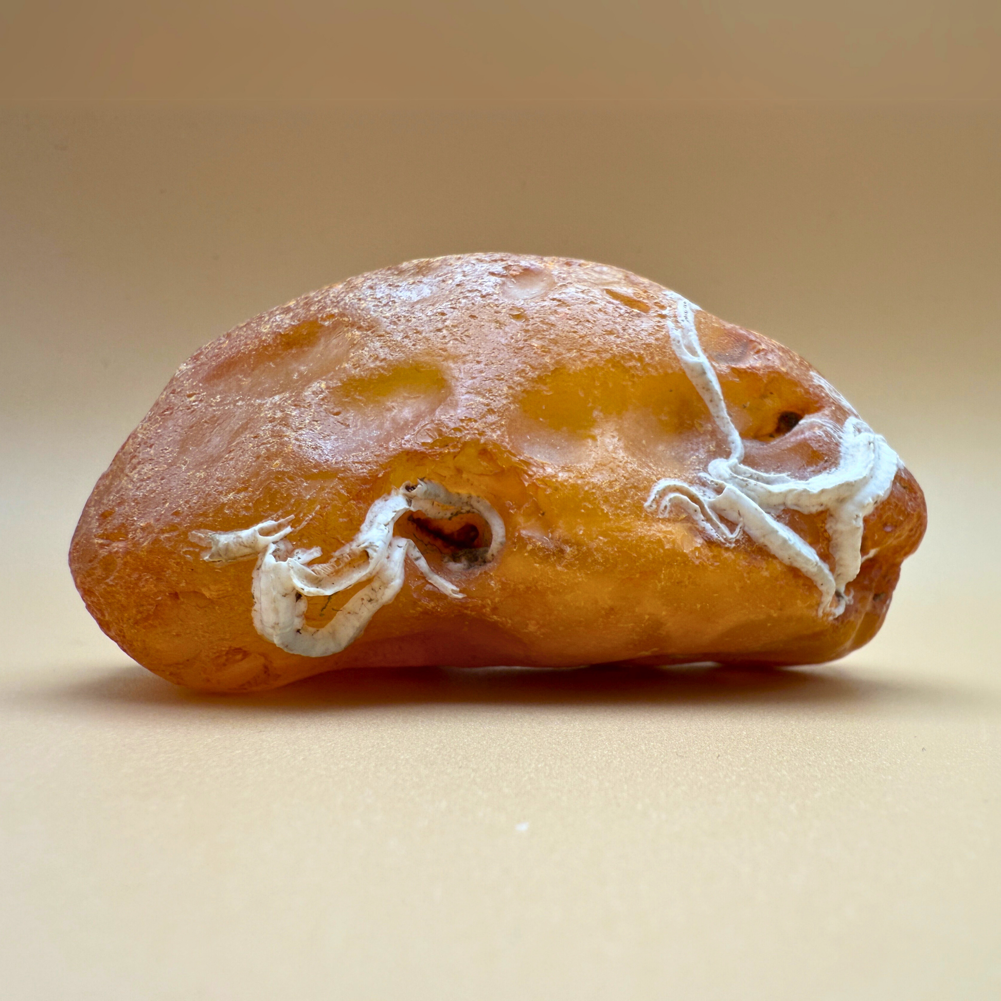Værket fremviser smukke spor af kalkholdige rørorme (Serpulidae) – små havdyr, der engang byggede fine, hvide, kalkholdige rør på ravet, mens det lå på havbunden. Disse sjældne formationer skaber en slående kontrast til ravets varme og tilføjer et lag af stille poesi til værket.
