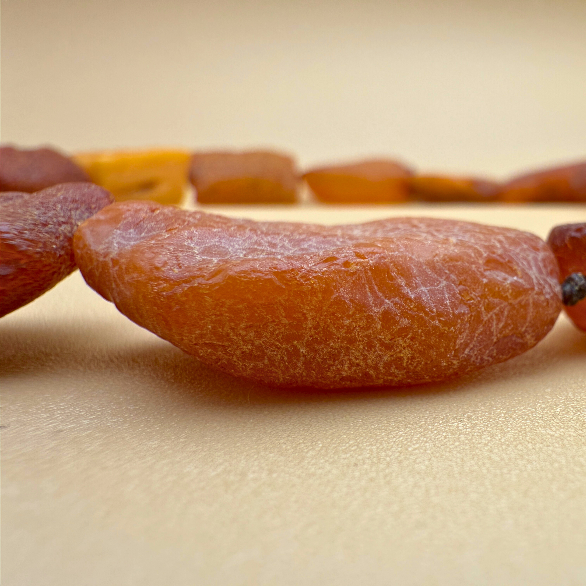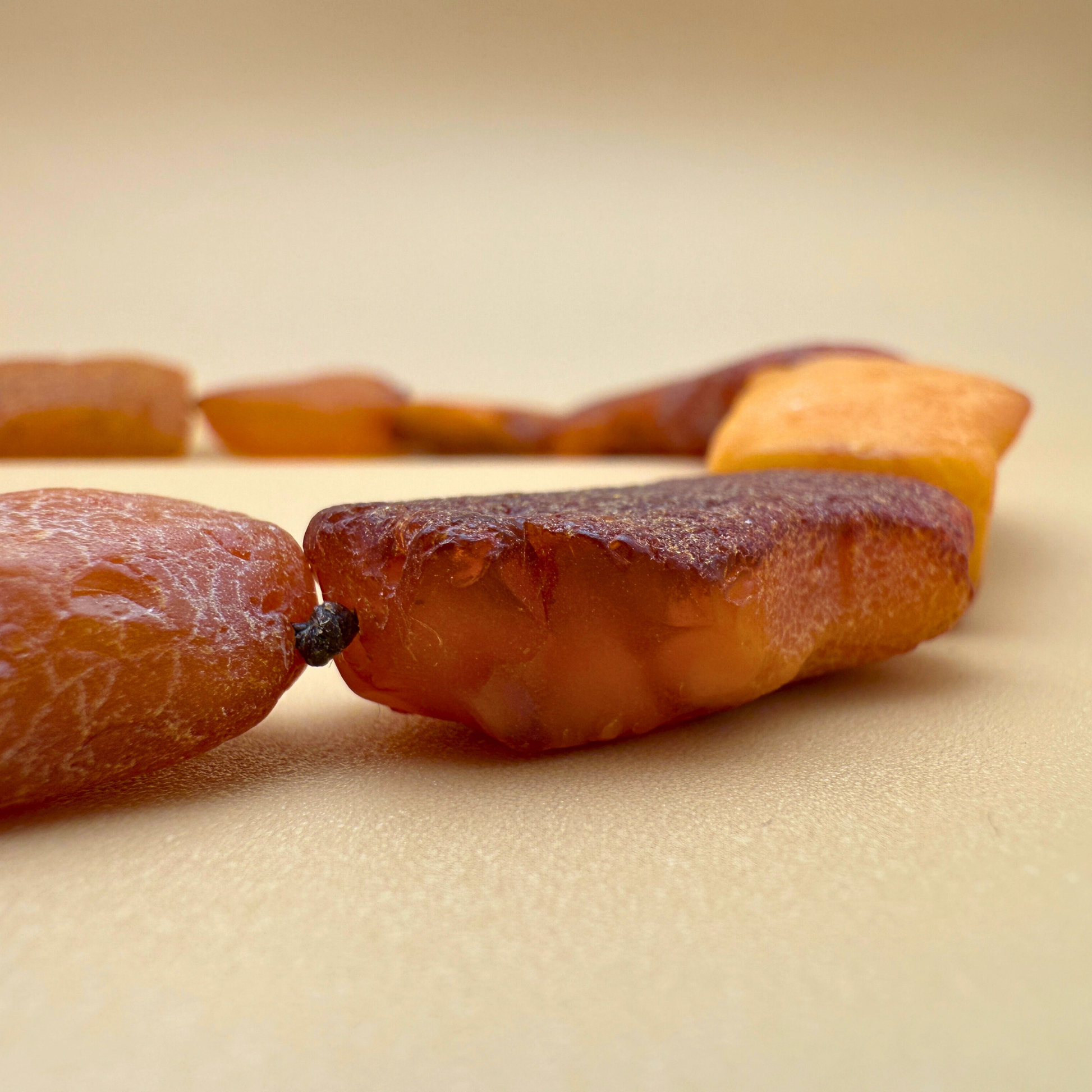 Denne rå ravkæde består af store, upolerede ravstykker i naturlige varme nuancer, kombineret med flere lysere gule perler, der giver en blid variation i farvespillet. En af de gule perler ligger i front og skaber et diskret fokuspunkt.
