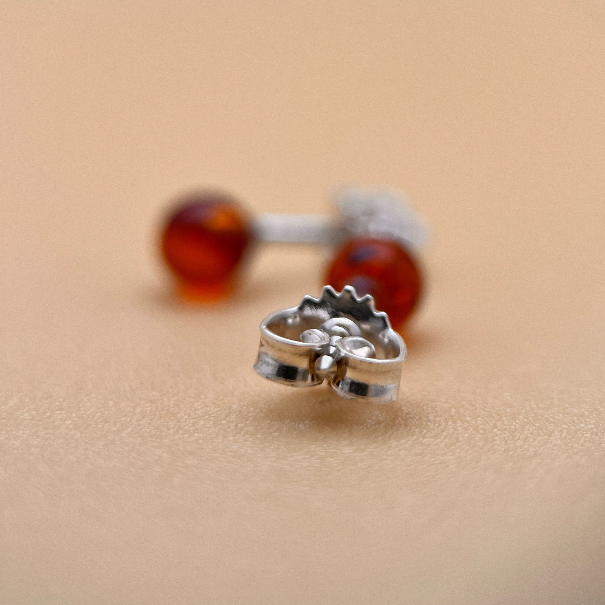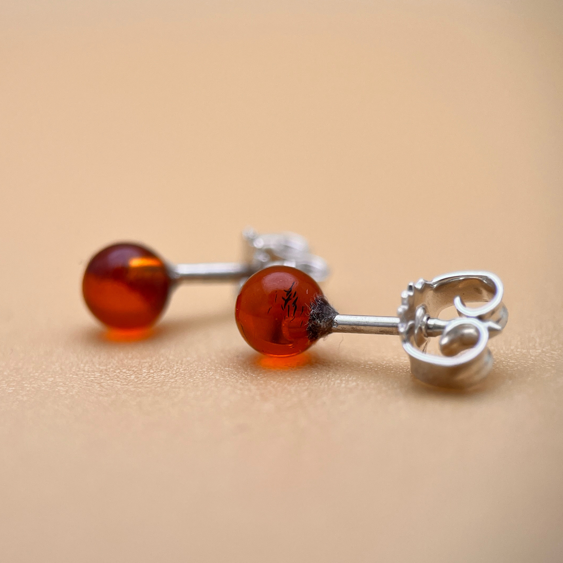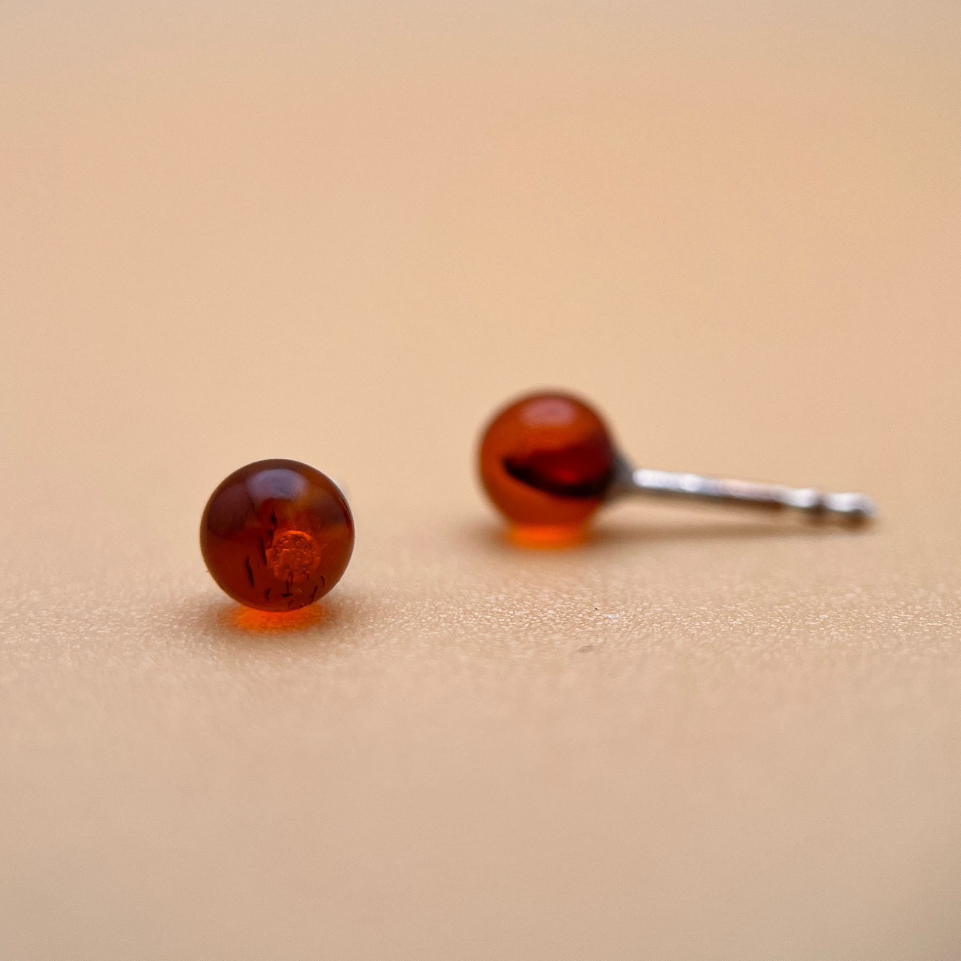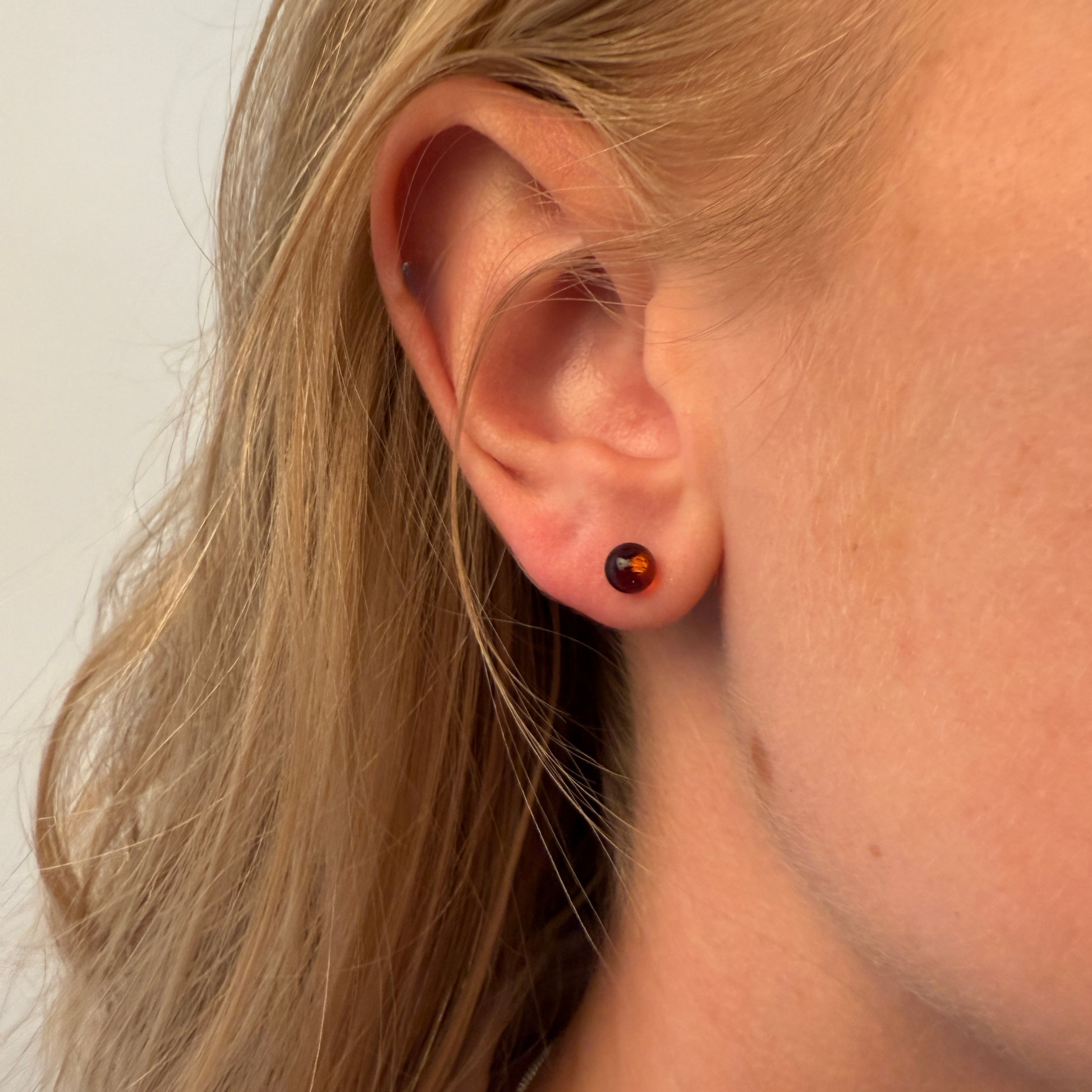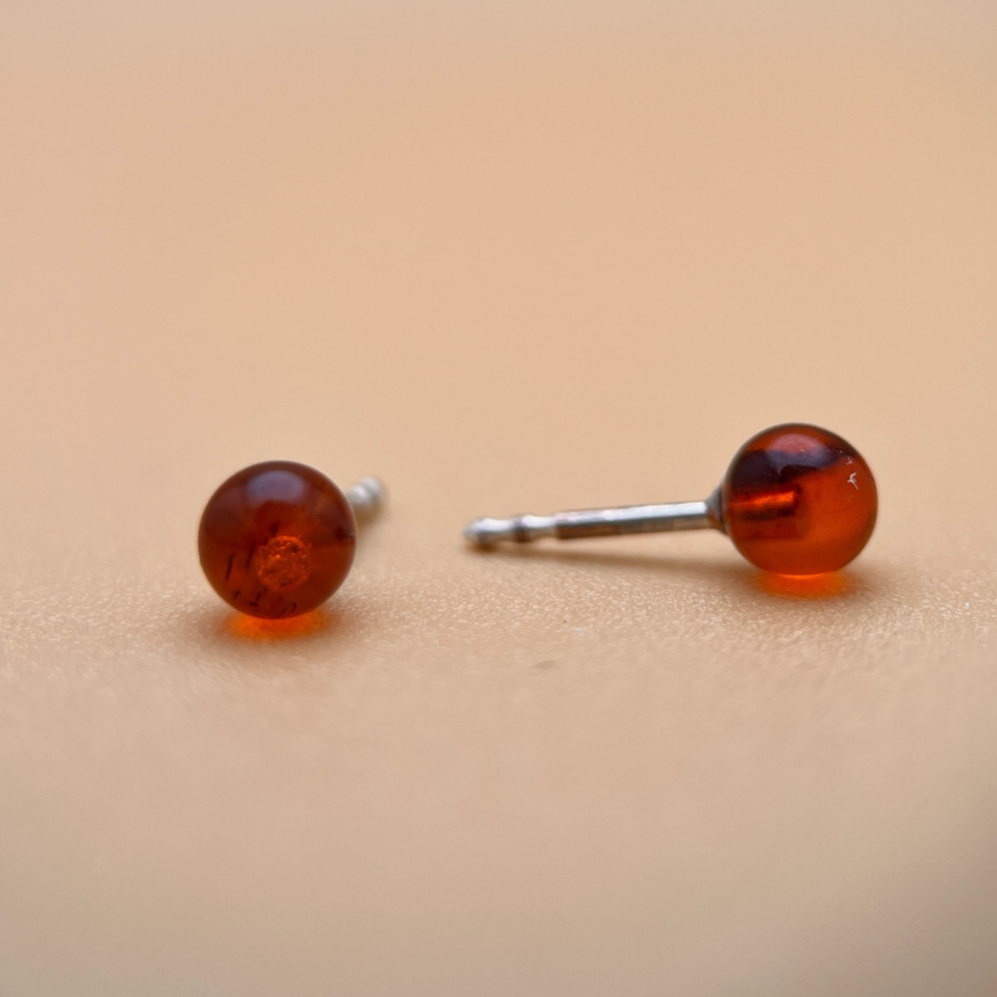 Et par enkle og elegante øreringe, perfekt til hverdagsbrug eller som en tidløs tilføjelse til enhver smykkekollektion. Disse øreringe har 5 mm runde ravperler i en dyb, klassisk cognac-tone – rig og varm, med naturlige indre refleksioner, der fanger lyset smukt.