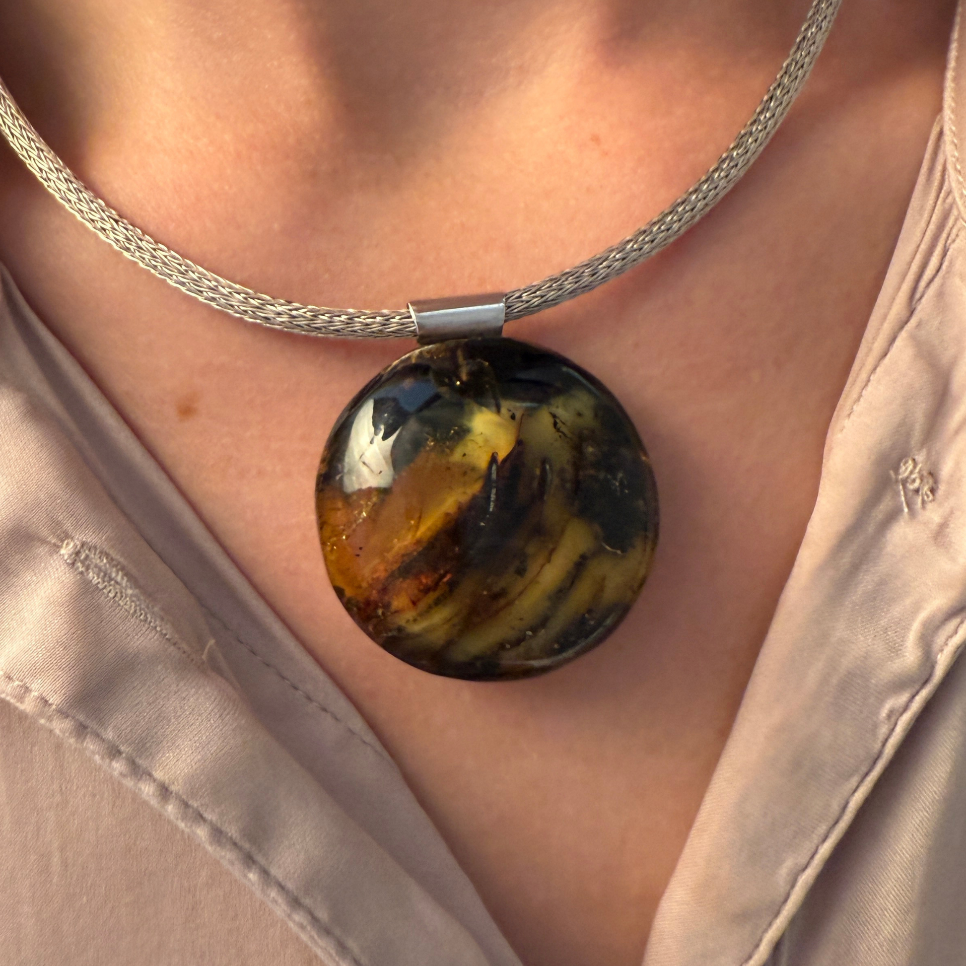 Dette dragende runde vedhæng er håndlavet på vores værksted ved Ravgården, blot få kilometer fra Vesterhavet. Det er lavet af dyb mosgrøn nordisk rav, fyldt med hvirvlende mælkehvide og klare skyer, som skaber en slående kontrast til de mørkere toner – som en fuldmåne der træder frem gennem skovens tåge.