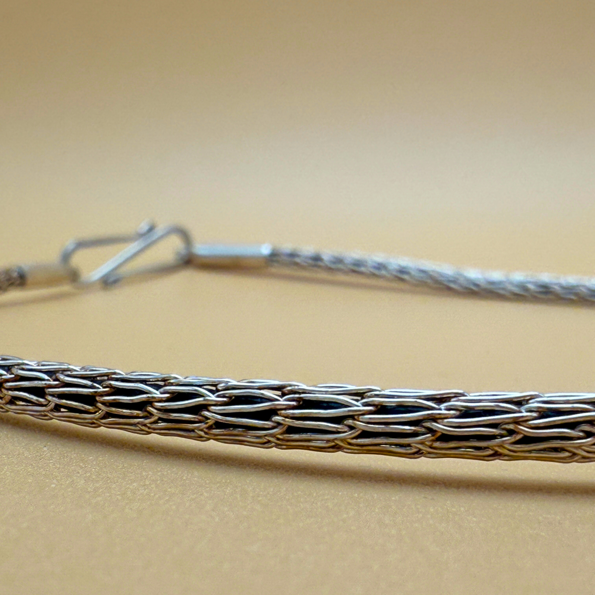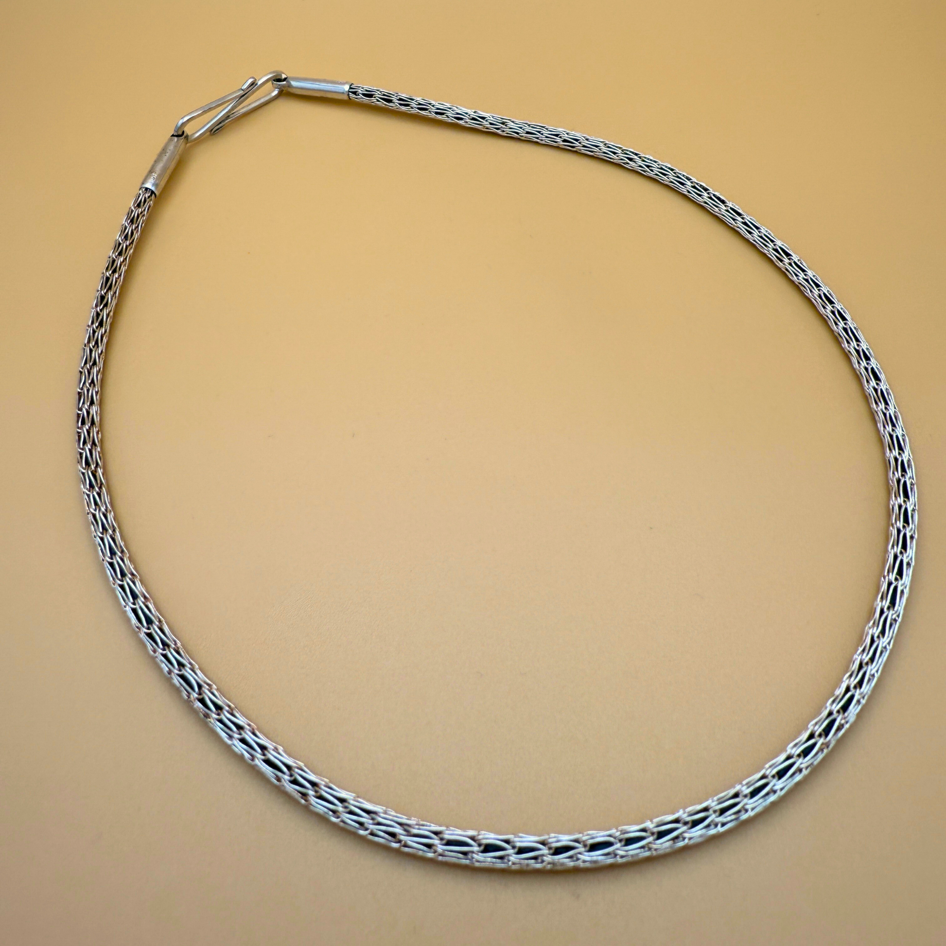 Denne kæde er fremstillet ved hjælp af en enkeltstrikningsteknik med 0,35 mm fin sølvtråd (999) . Den åbne struktur gør det muligt at se den sorte læderkerne diskret – hvilket giver kæden et råt og ærligt look , der fremhæver stingets rytme og detaljerne i arbejdet.