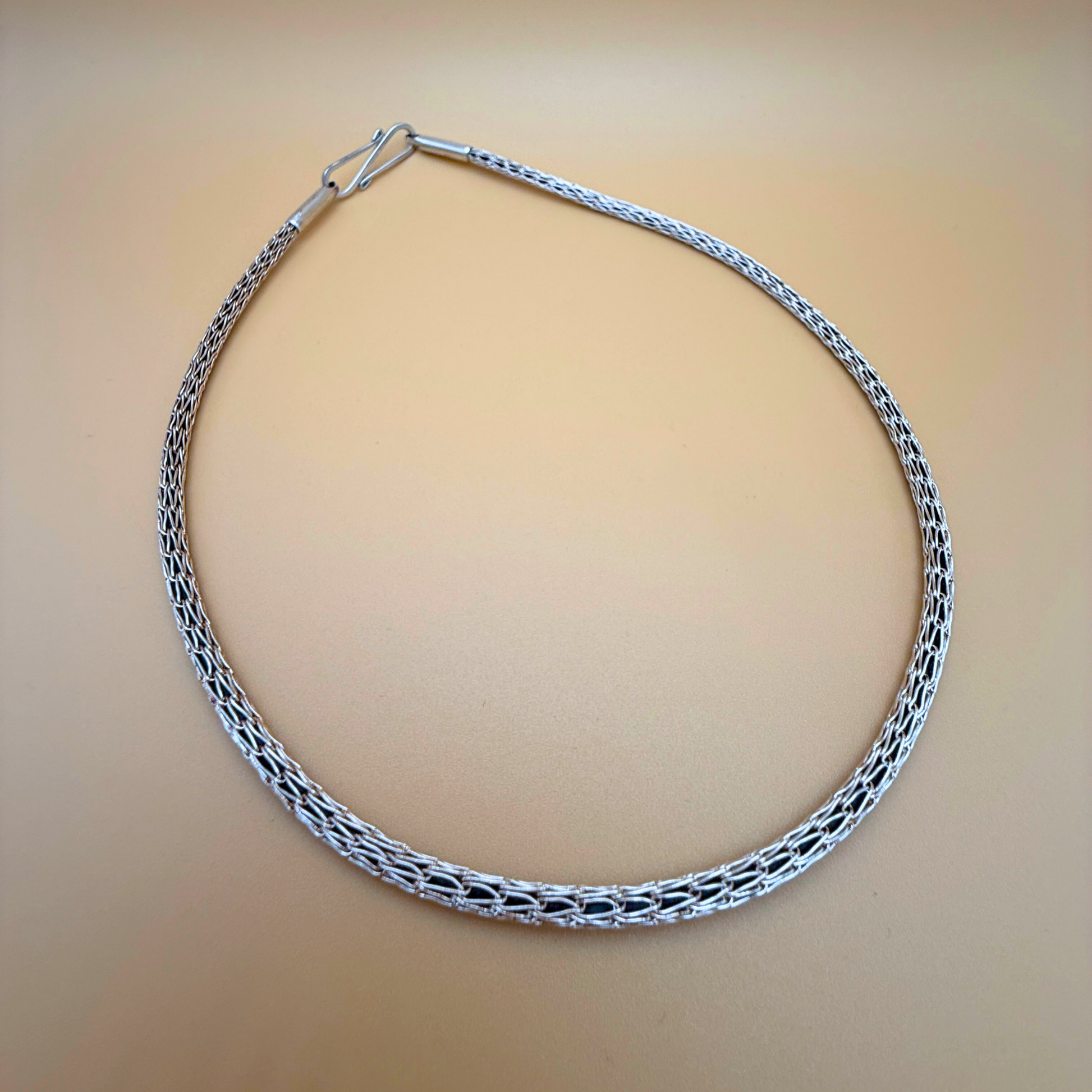 Læs mere om strikkeprocessen i vores blogindlæg om håndlavede sølvkæder.