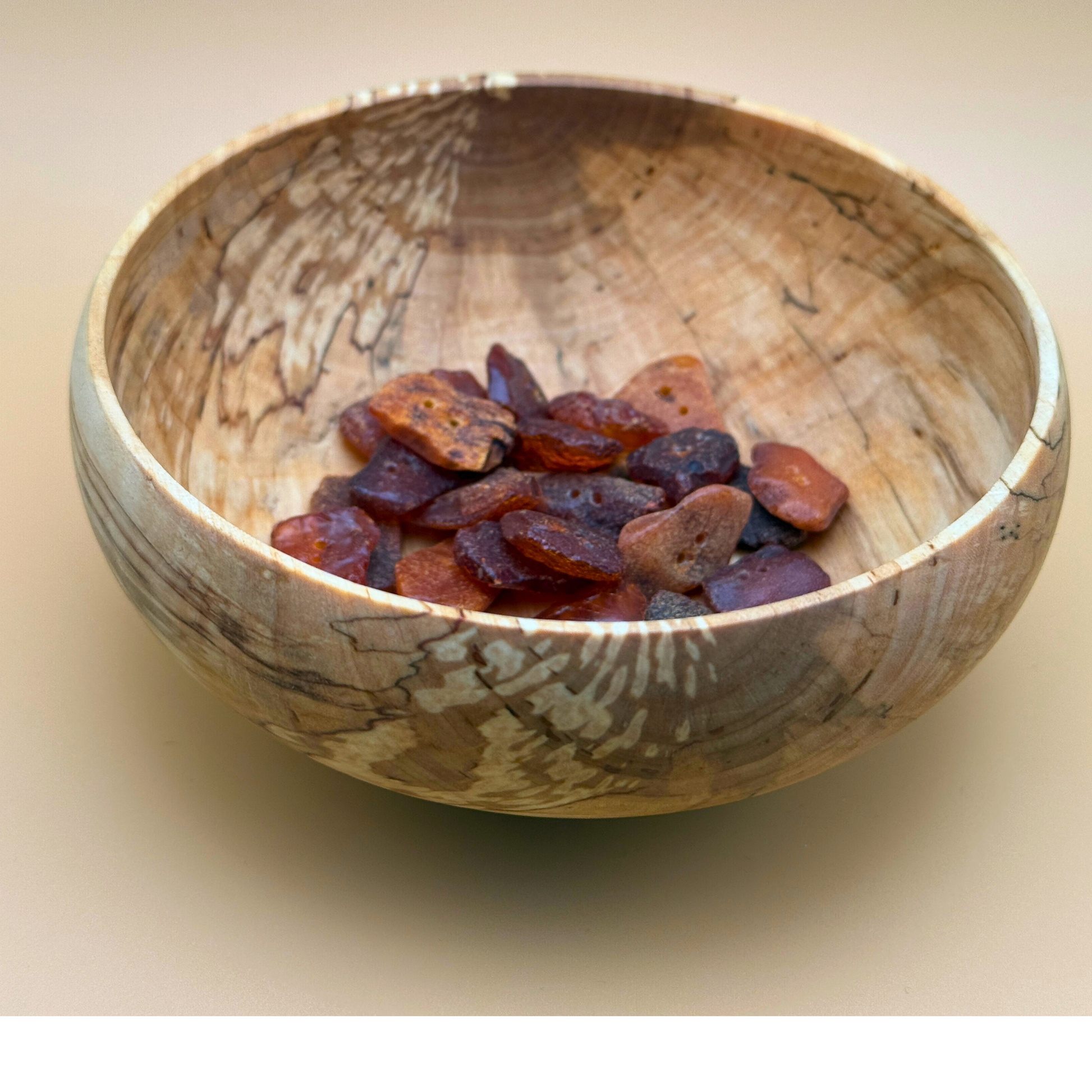 Skålen er behandlet med en fødevaresikker, farveløs olie , der bevarer træets rå skønhed og taktile blødhed. På undersiden finder du et lille lyst cognacfarvet stykke rav – en diskret signaturdetalje, der forbinder genstanden med Ravgaards verden af nordisk natur og håndværk.