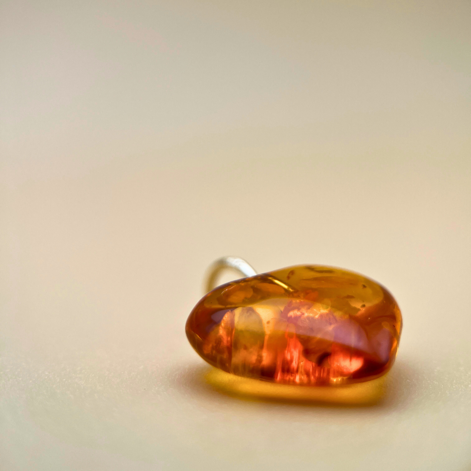 Hvert stykke er formet af naturligt rav, hvilket betyder, at der kan forekomme små variationer i den indre glimmer. Du modtager ikke præcis det stykke, der er vist på billedet – men altid et med samme tone, form og blide skønhed.