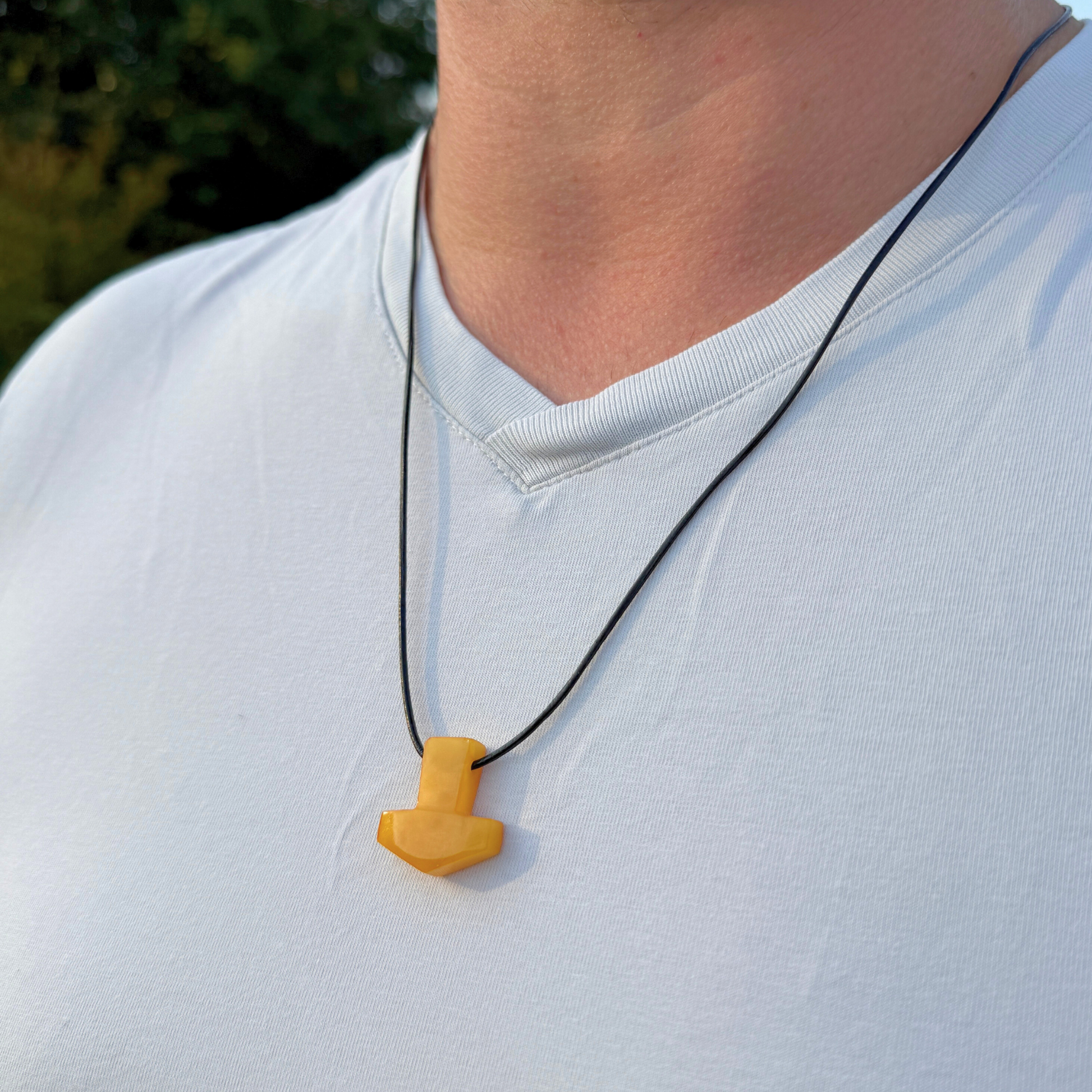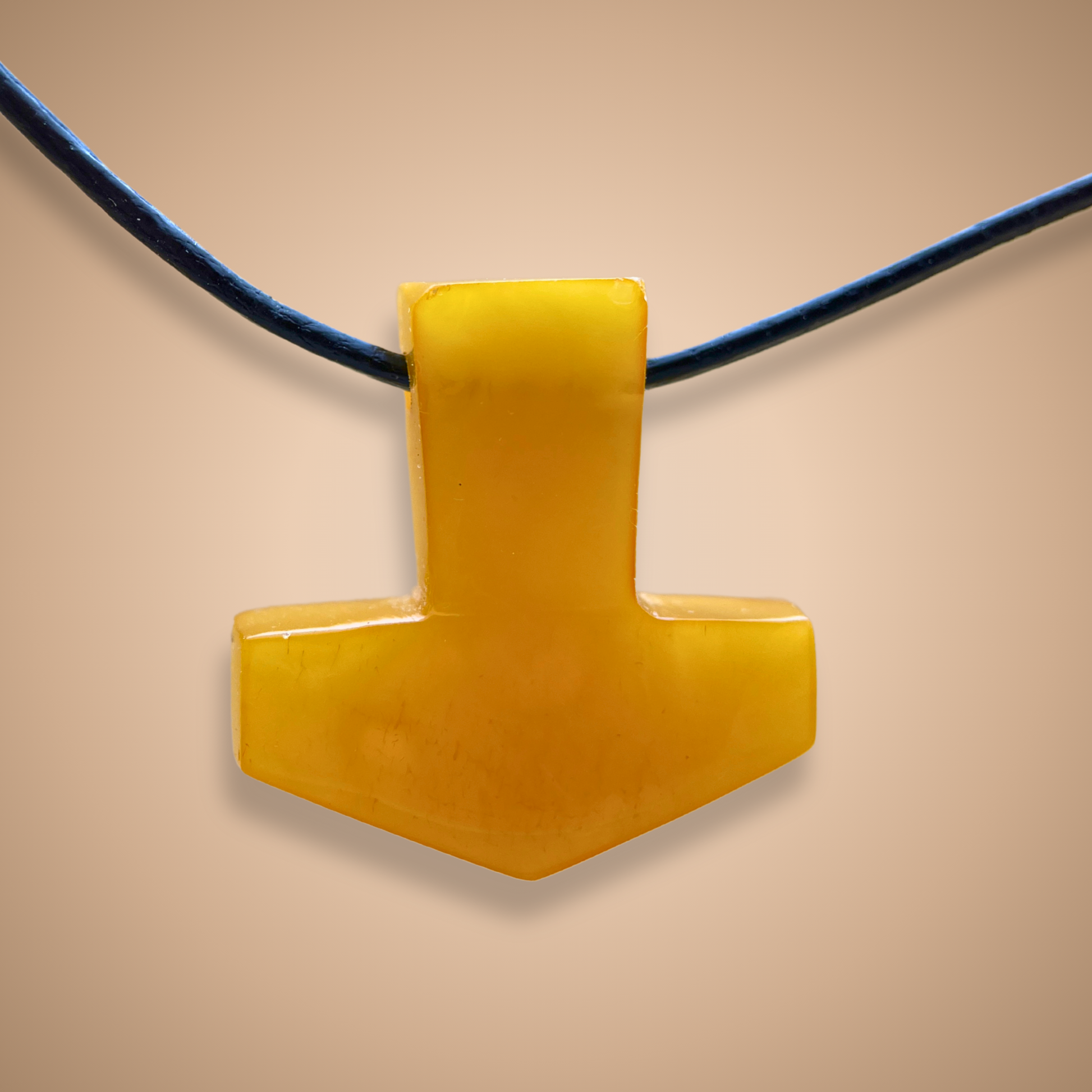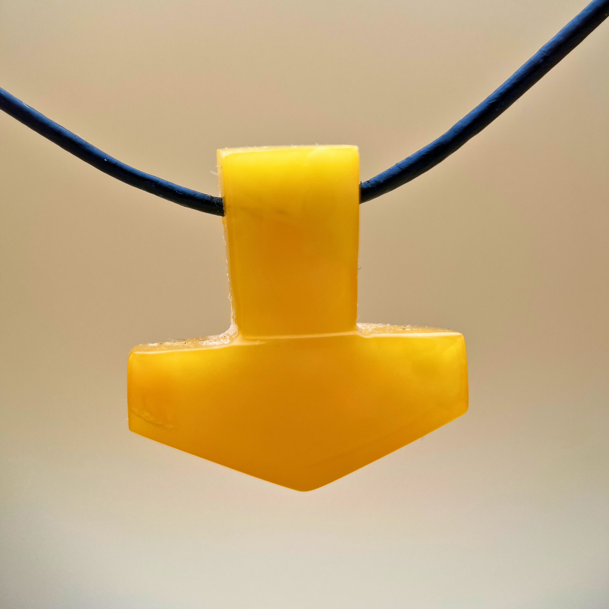 I nordisk mytologi er Thors hammer – Mjölnir – et symbol på styrke, beskyttelse og forbindelse til naturens rå kraft. Dette vedhæng genfortolker det gamle symbol i en blød, mælkegult rav, håndskåret af ægte baltisk rav og trukket på en sort lædersnor.