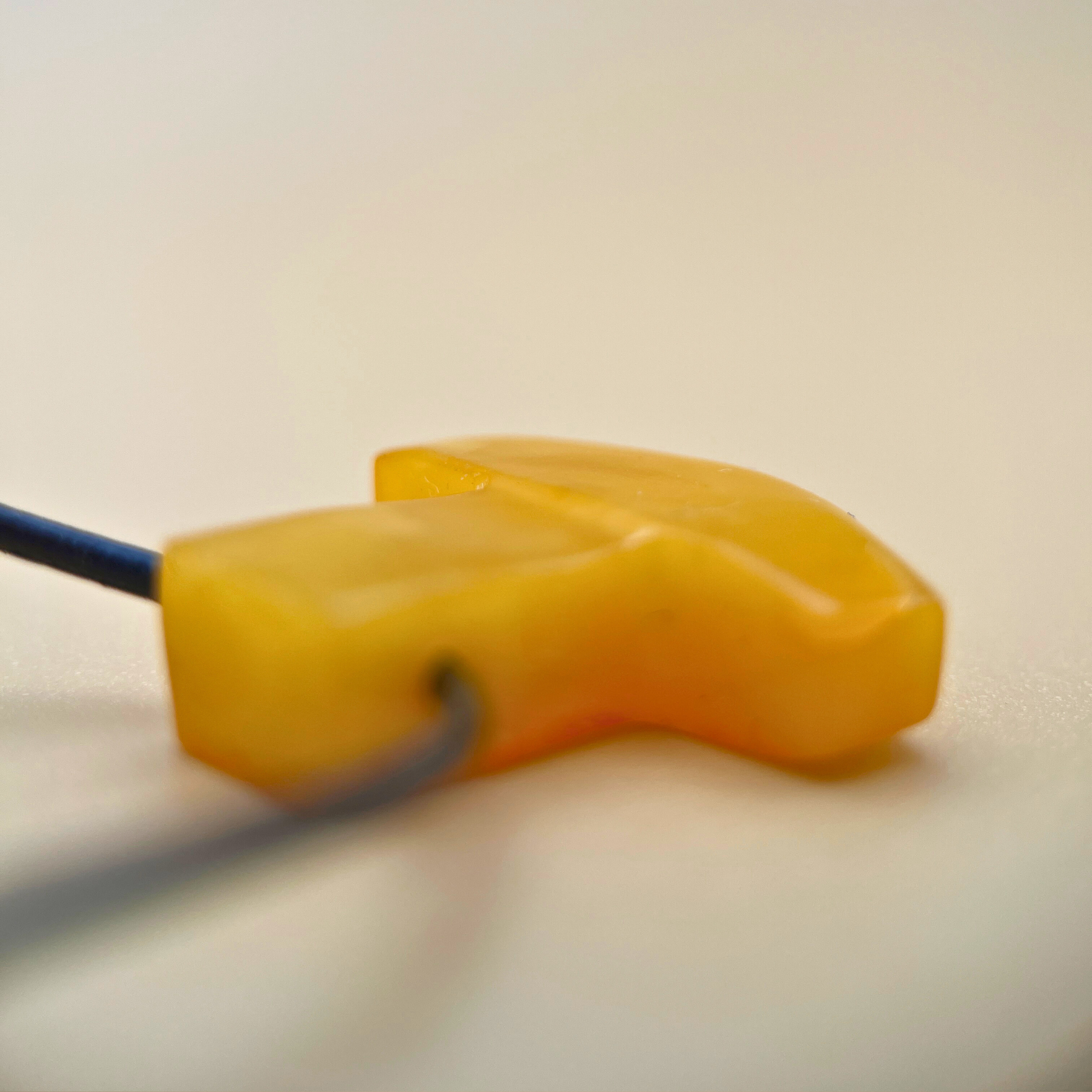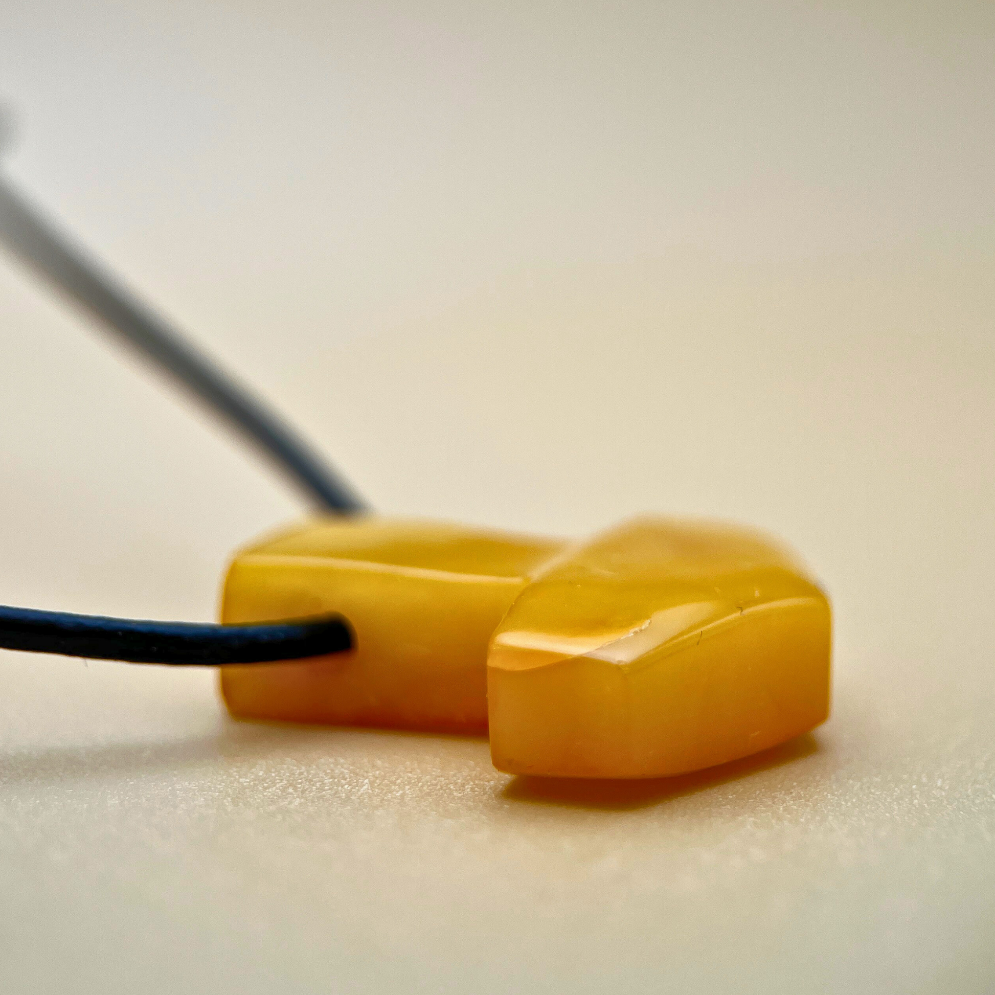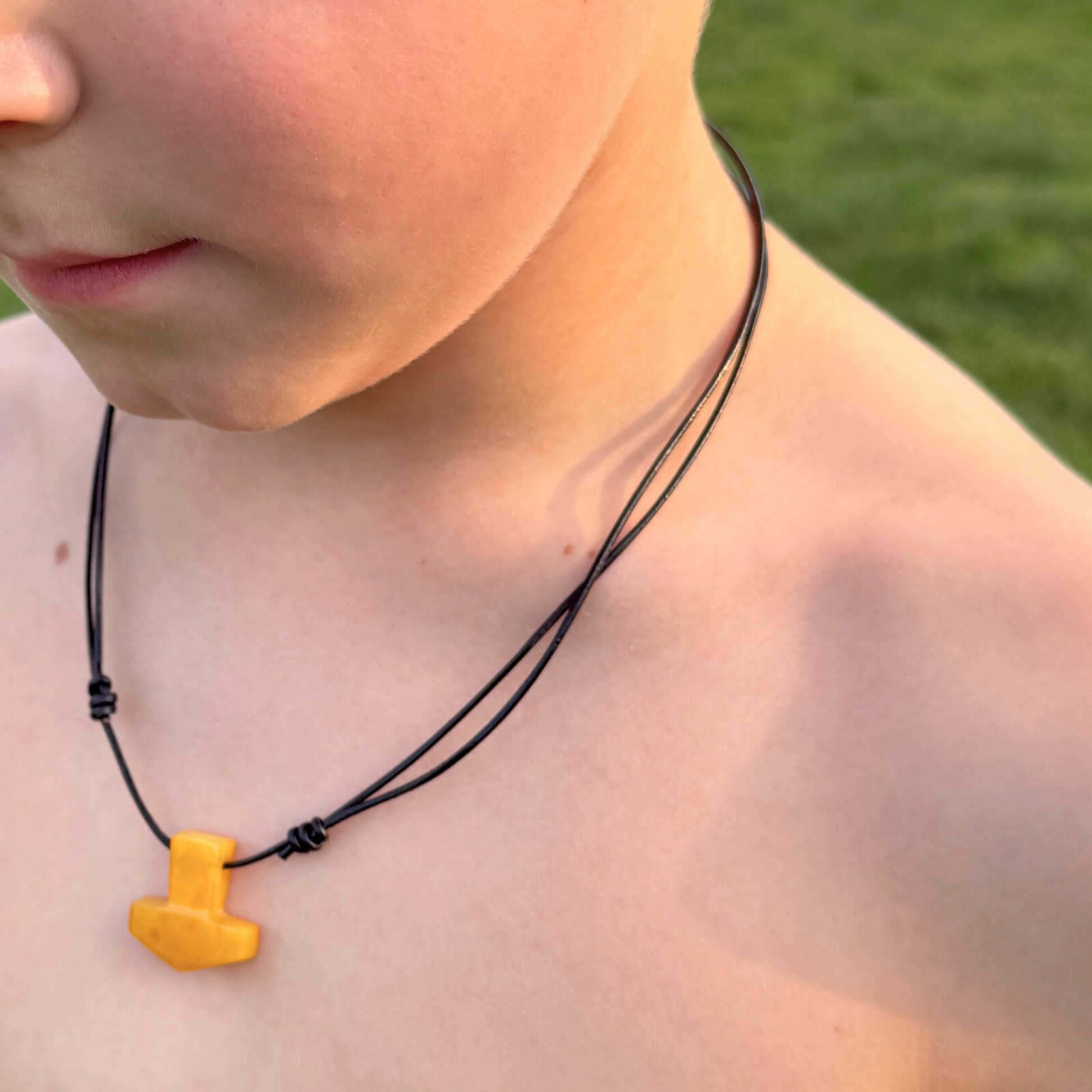 I nordisk mytologi er Thors hammer – Mjölnir – et symbol på styrke, beskyttelse og forbindelse til naturens rå kraft. Dette vedhæng genfortolker det gamle symbol i en blød, mælkegult rav, håndskåret af ægte baltisk rav og trukket på en sort lædersnor.