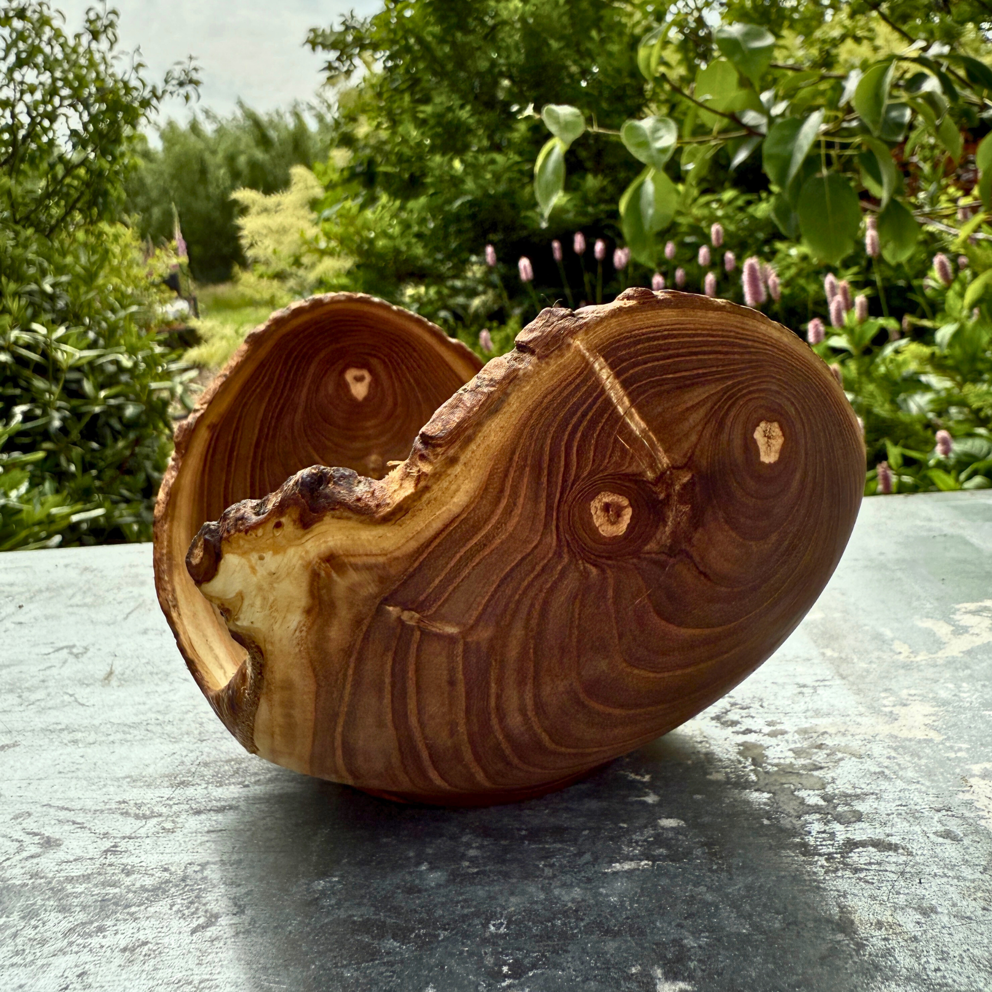 Bakken er udskåret af en naturligt buet gren , der er synlig i årets organiske linje. En lille fordybning på ydersiden er dannet af det lidt blødere, lyse kernetræ – et smukt naturligt element, der tilføjer både tekstur og dybde.